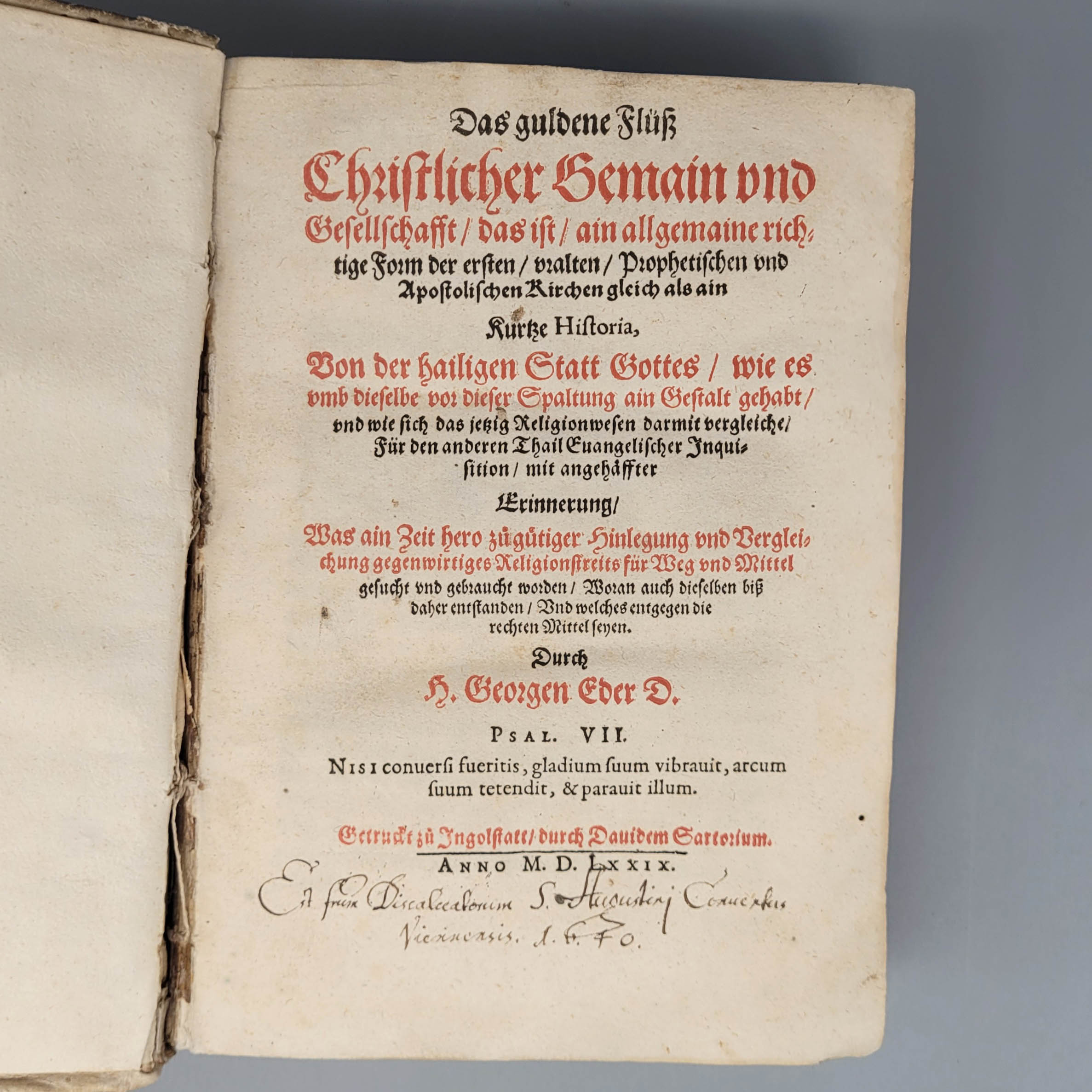 EDER, Georg: Das guldene Flüß Christlicher Gemain und Gesellschaft….Ingolstadt (David Sartorius) 1579 (geprägter Ledereinband der Zeit, Schließbänder fehlen)Wir weisen darauf hin, dass das Buch nicht kollationiert ist.