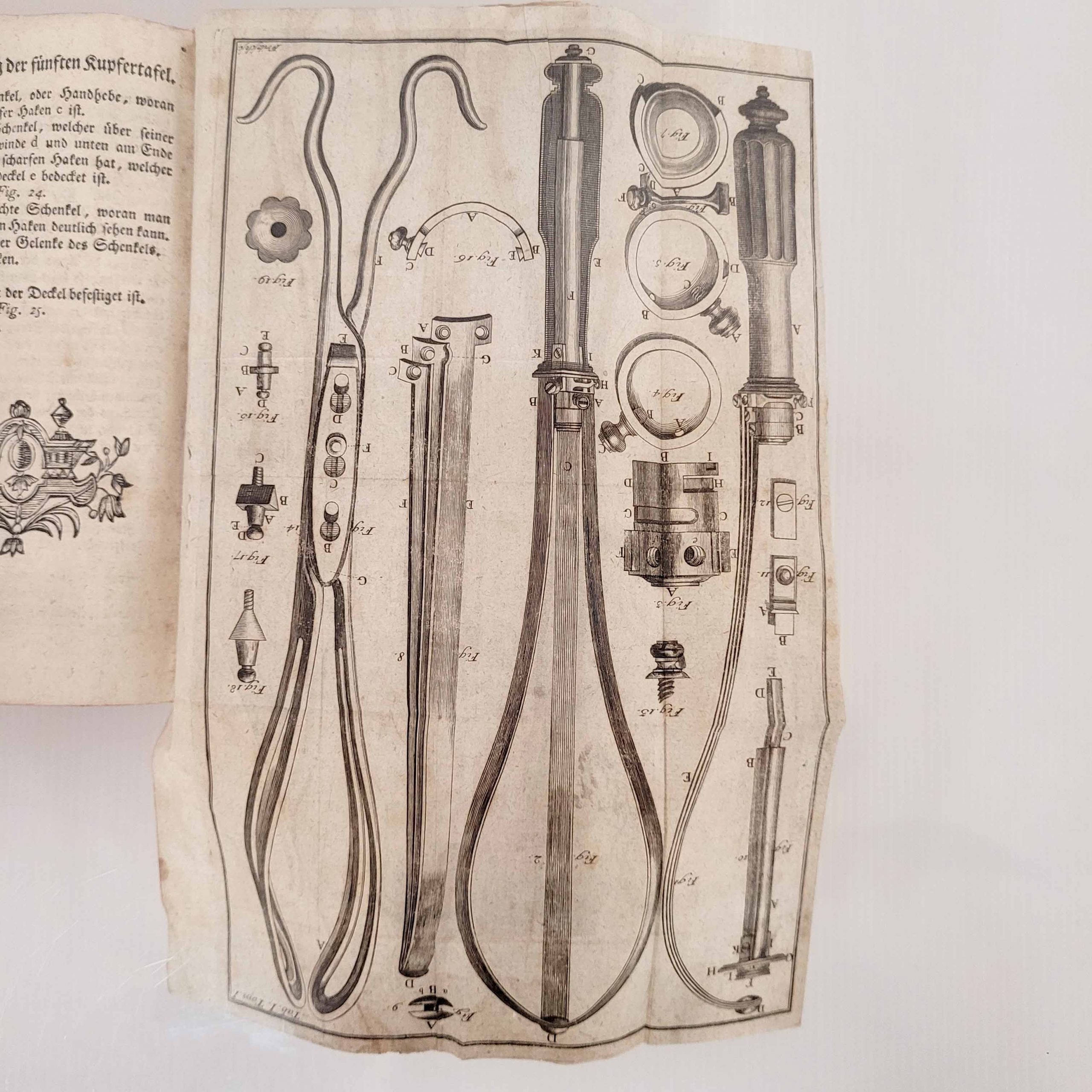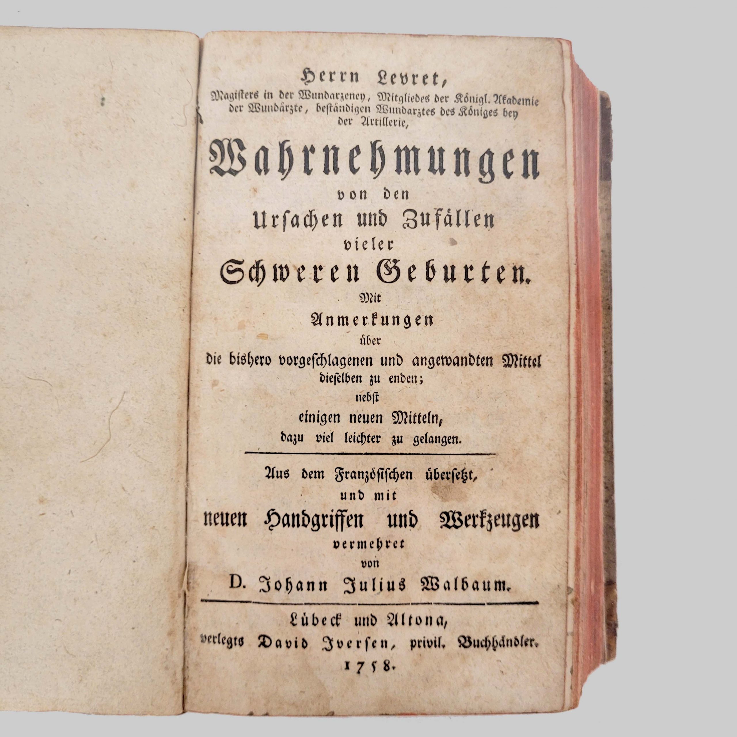 Lübeck / Altona (David Iversen) 1758 (542 Seiten mit der Abhandlung von Voigt, „Probeschrift von dem abgerissenem Kopfe eines Kindes in der Gebährmutter“ und Walbaum, „Neue Werkzeuge zur Geburtshülfe“, mit den Falttafeln [eine durch Wurmfraß leicht beschädigt] neuerer Halbledereinband mit altem Rücken)