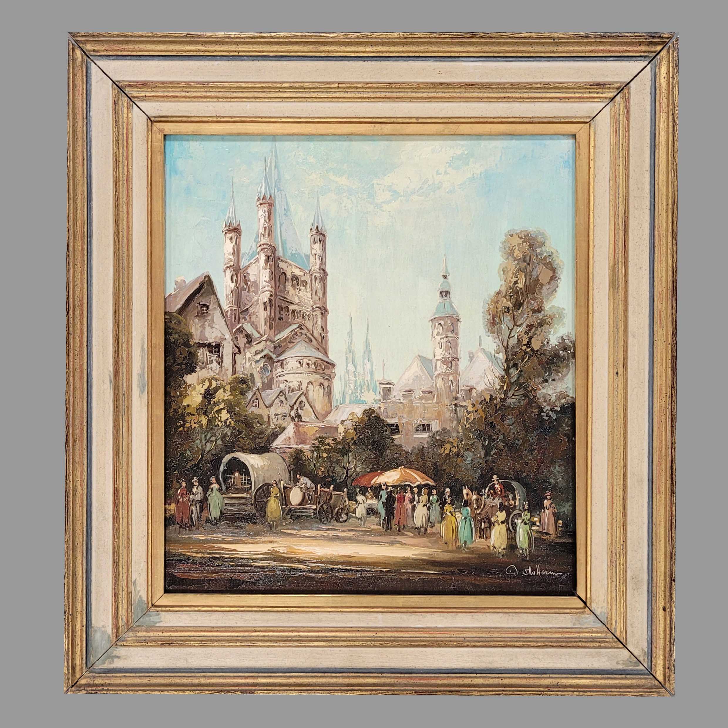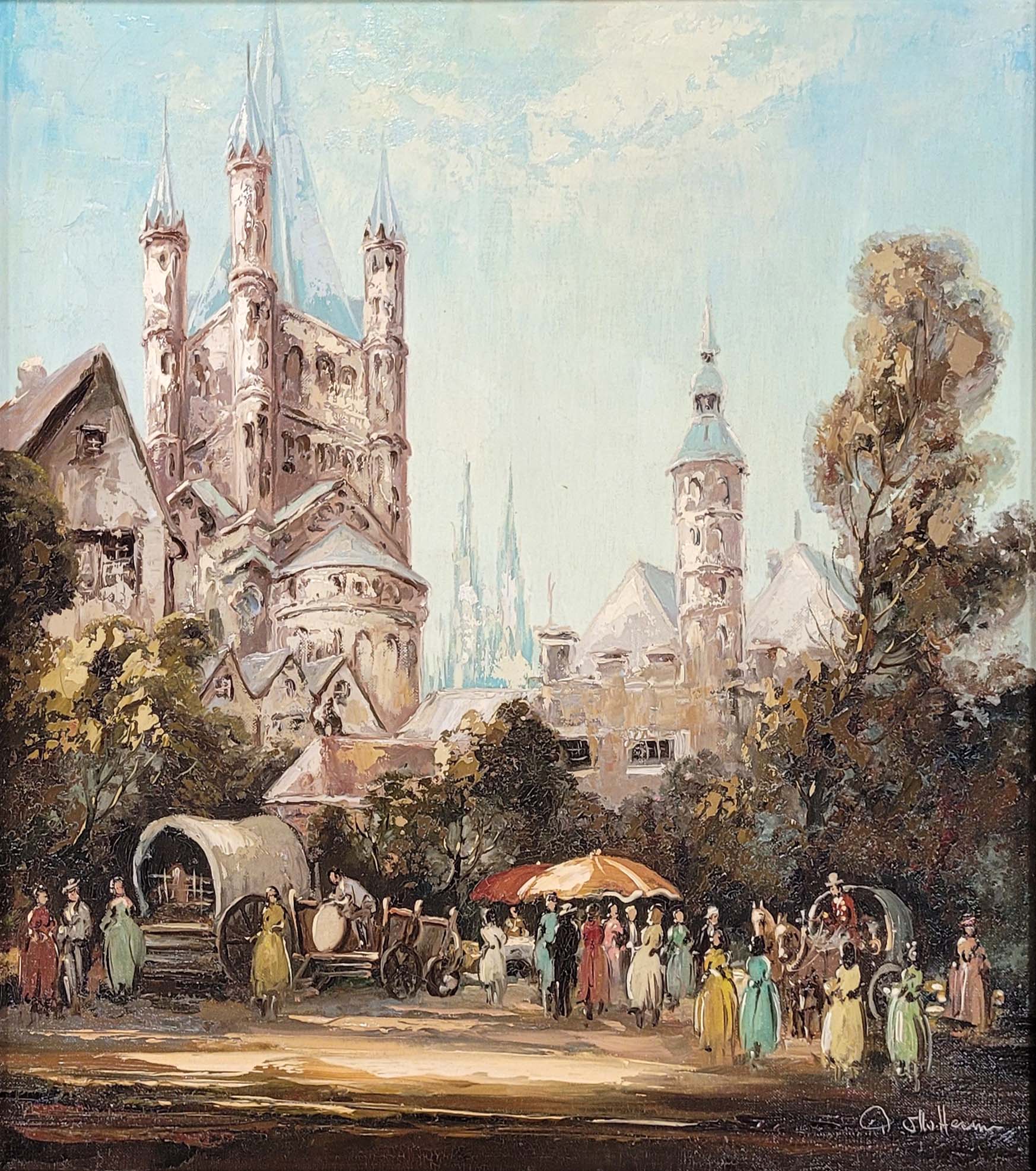 HEIM, Paul Otto (1898-1978): Szene an Groß St. Martin und Stapelhaus in KölnÖl auf Leinwand, signiert unten rechts, verso alt auf dem Keilrahmen betitelt, Etikett Kunsthandlung Goyert, Köln, 50,5 x 45 cm, Rahmen
