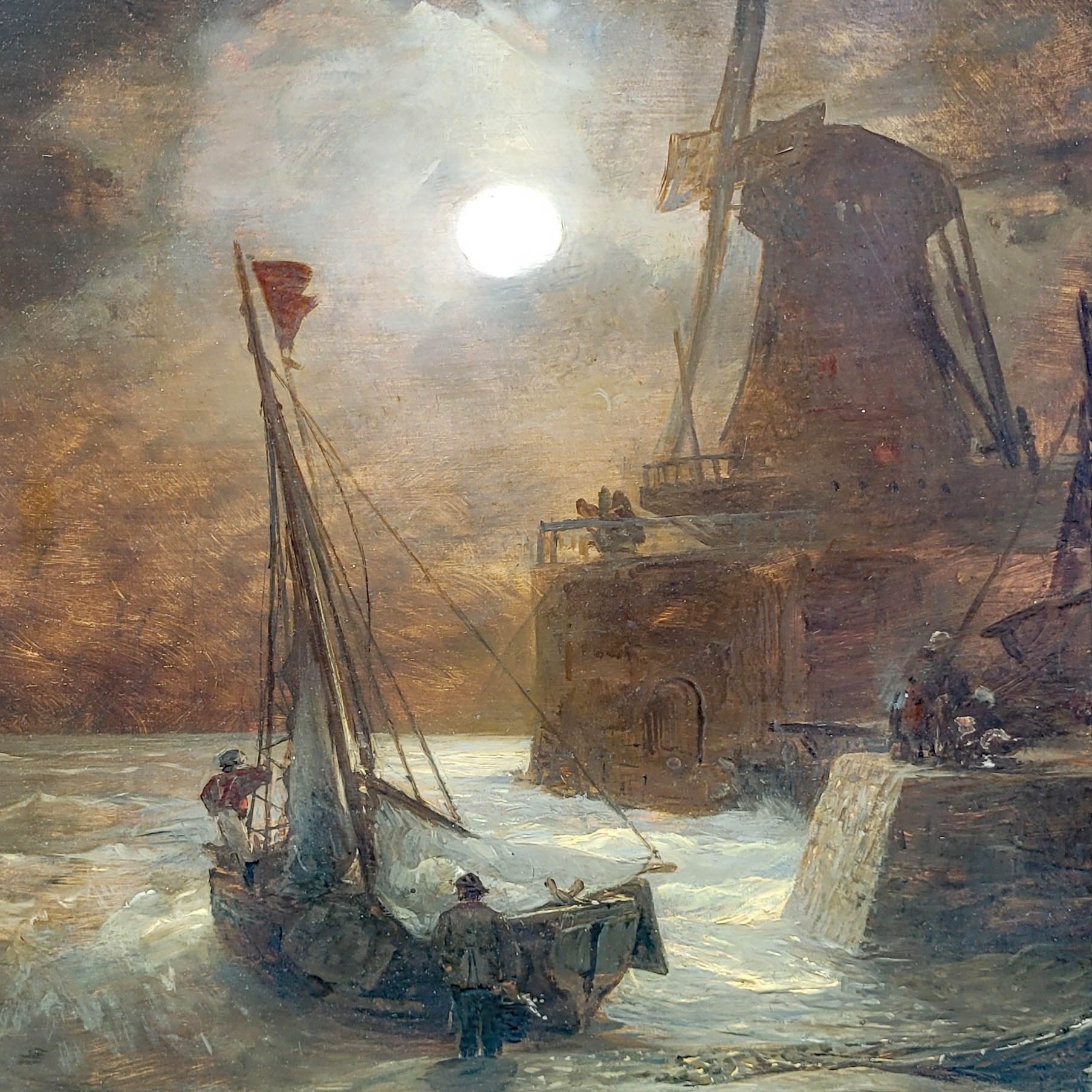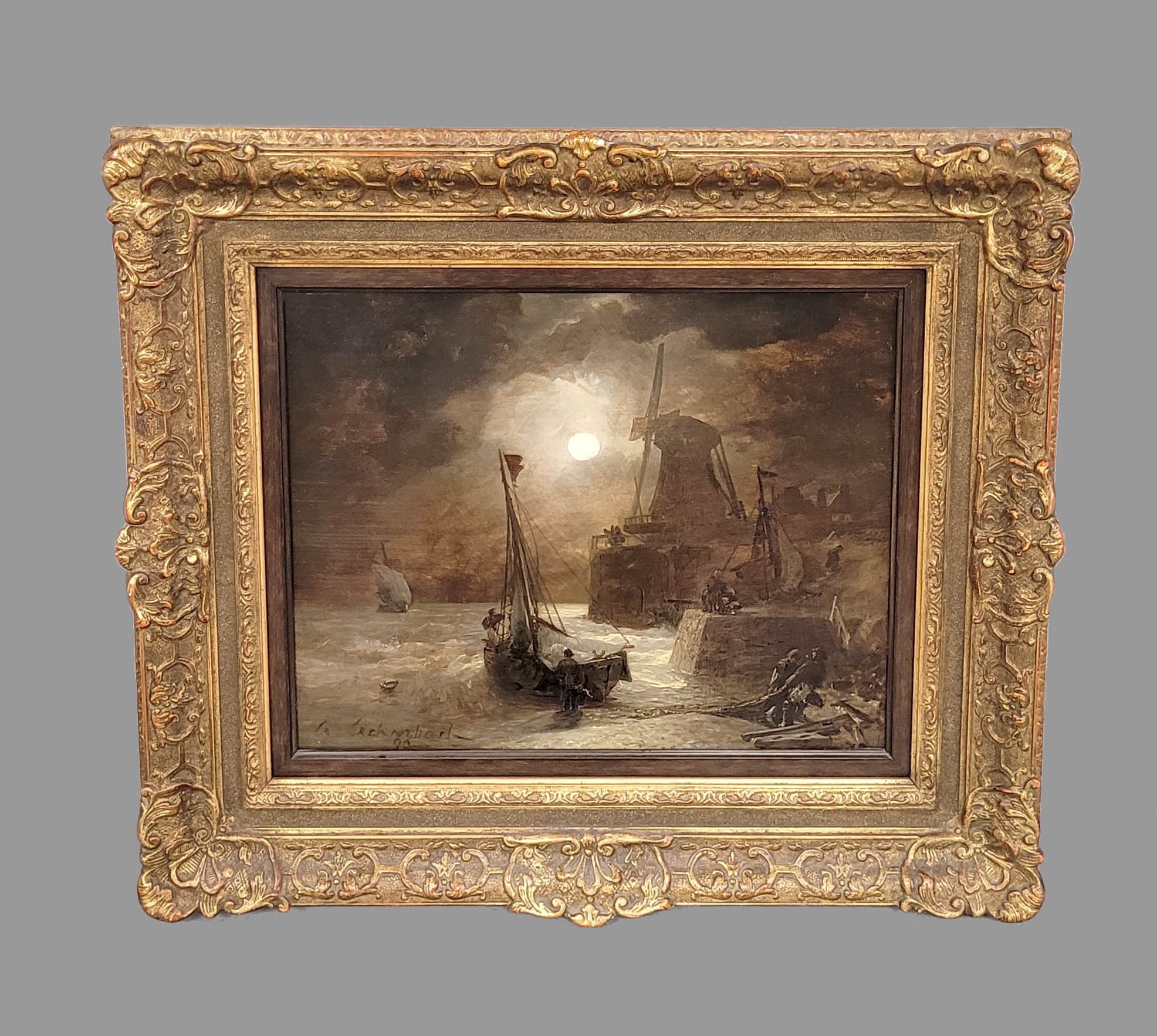 ACHENBACH, Andreas (1815-1910): Mondscheinlandschaft mit Windmühle und heimkehrenden FischernÖl auf Holz, signiert und datiert (18)96 unten links, 36 x 45,5 cm, Rahmen