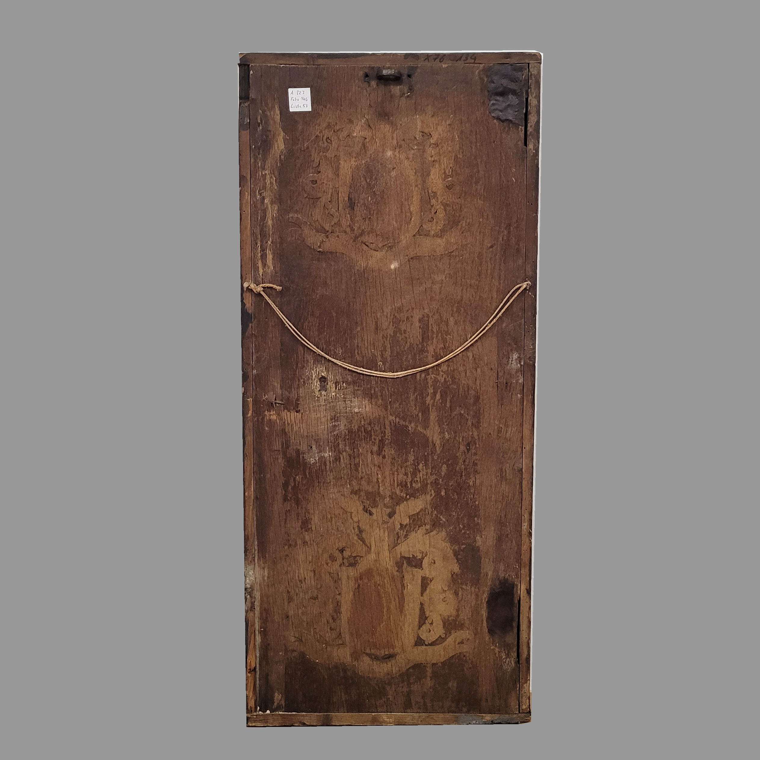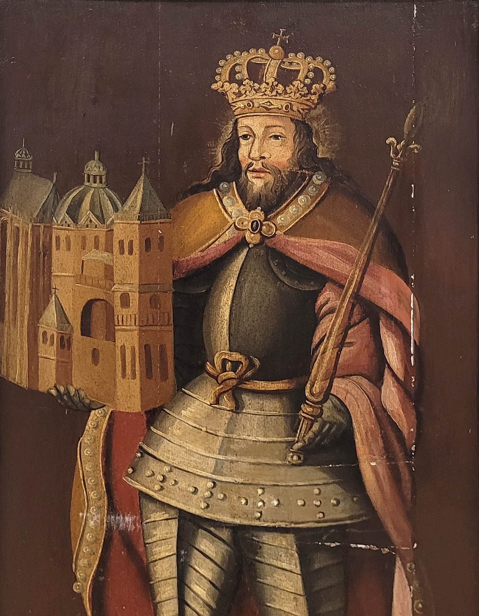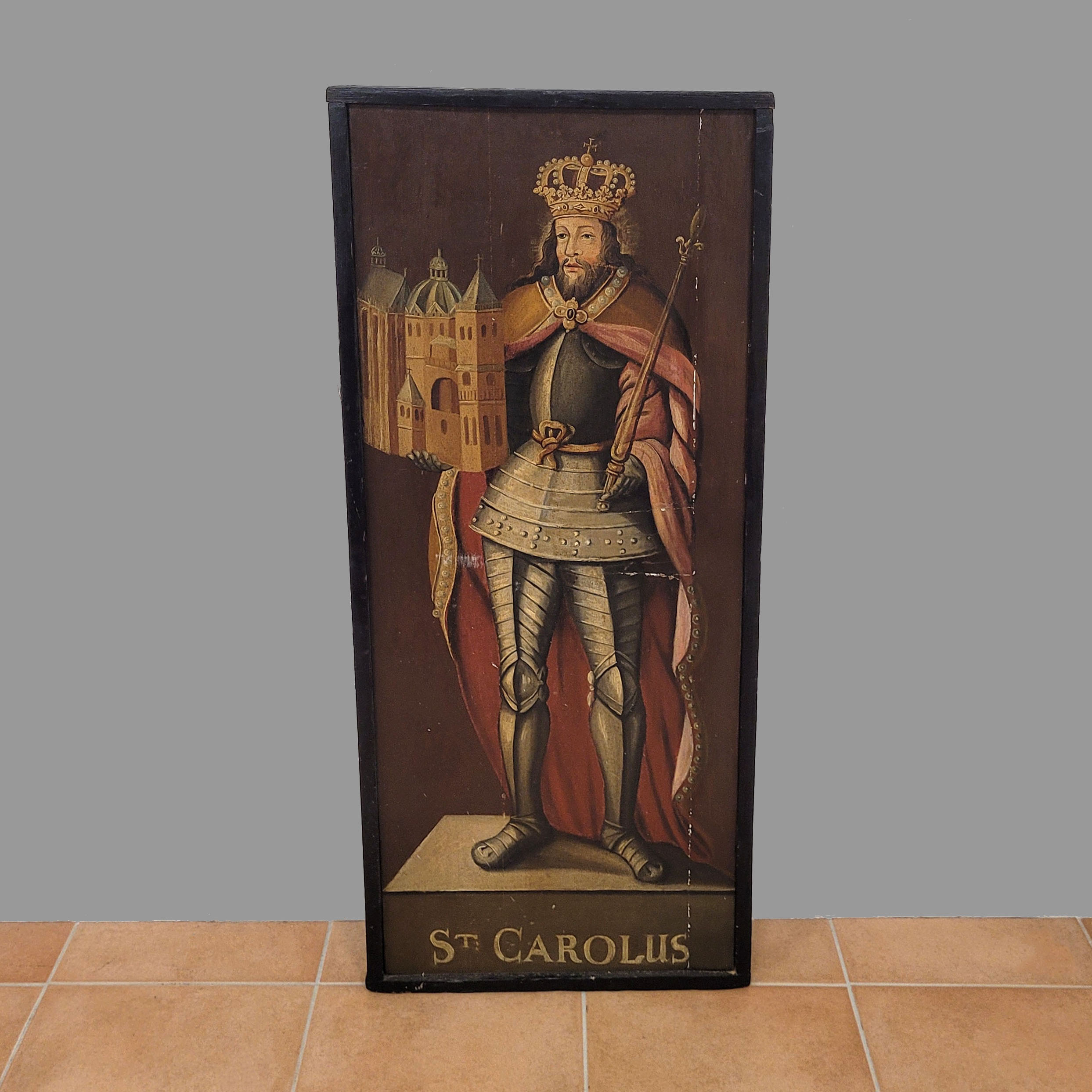 DEUTSCHER MEISTER (um 1800): Karl der Große mit dem Modell des Aachener DomsÖl auf Holz (wohl Schranktür), Rheinland, um 1800, 100 x 40,5 cm, Rahmen