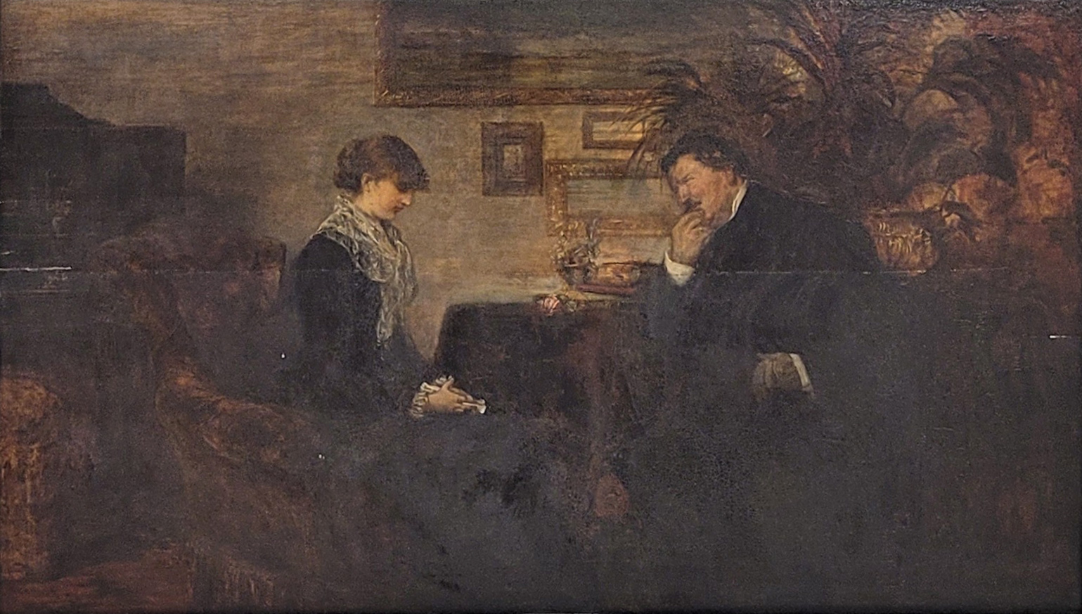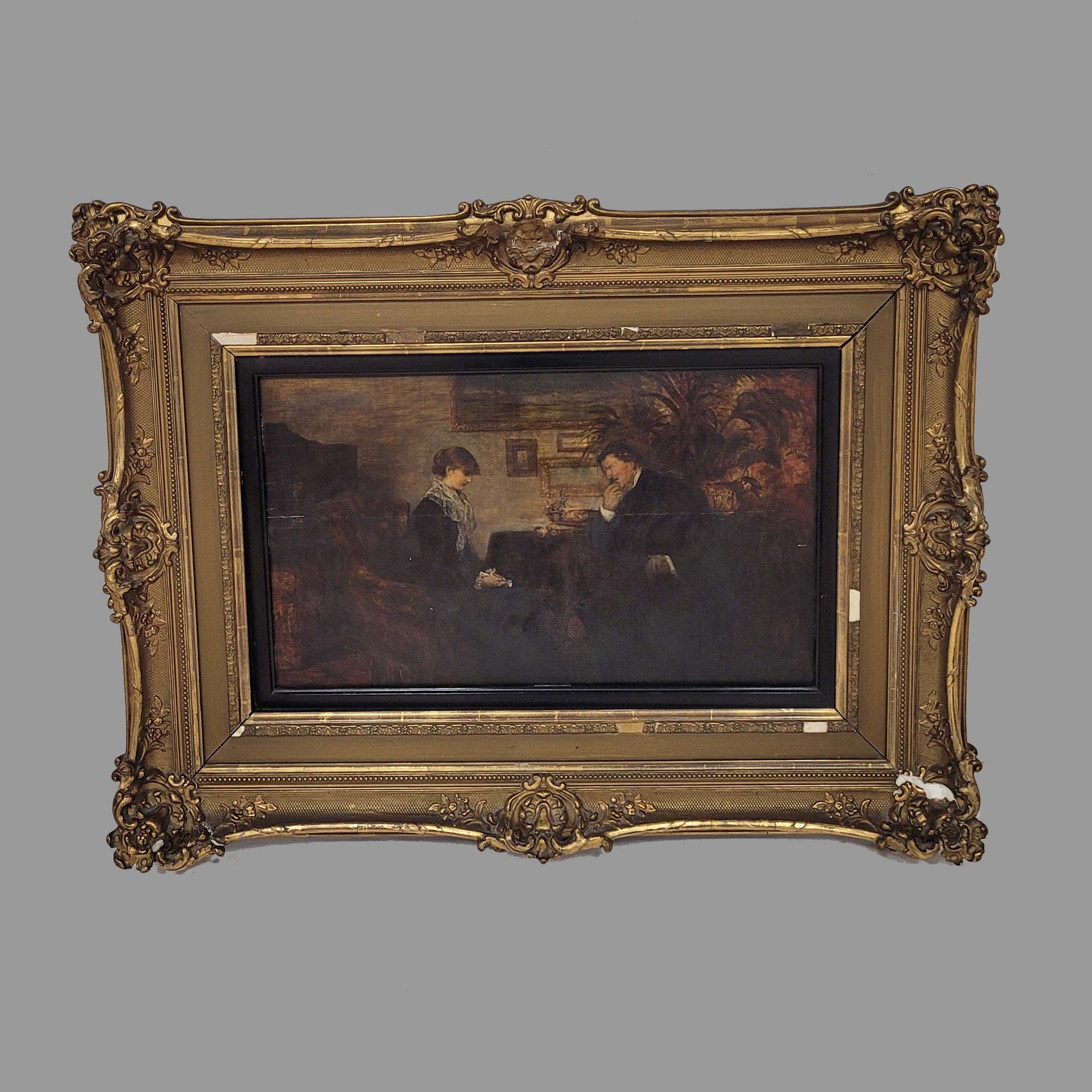 HARBURGER, Edmund (1846-1906): Das GesprächÖl auf Holz, signiert oben links, 33 x 53 cm, Rahmen (beschädigt)