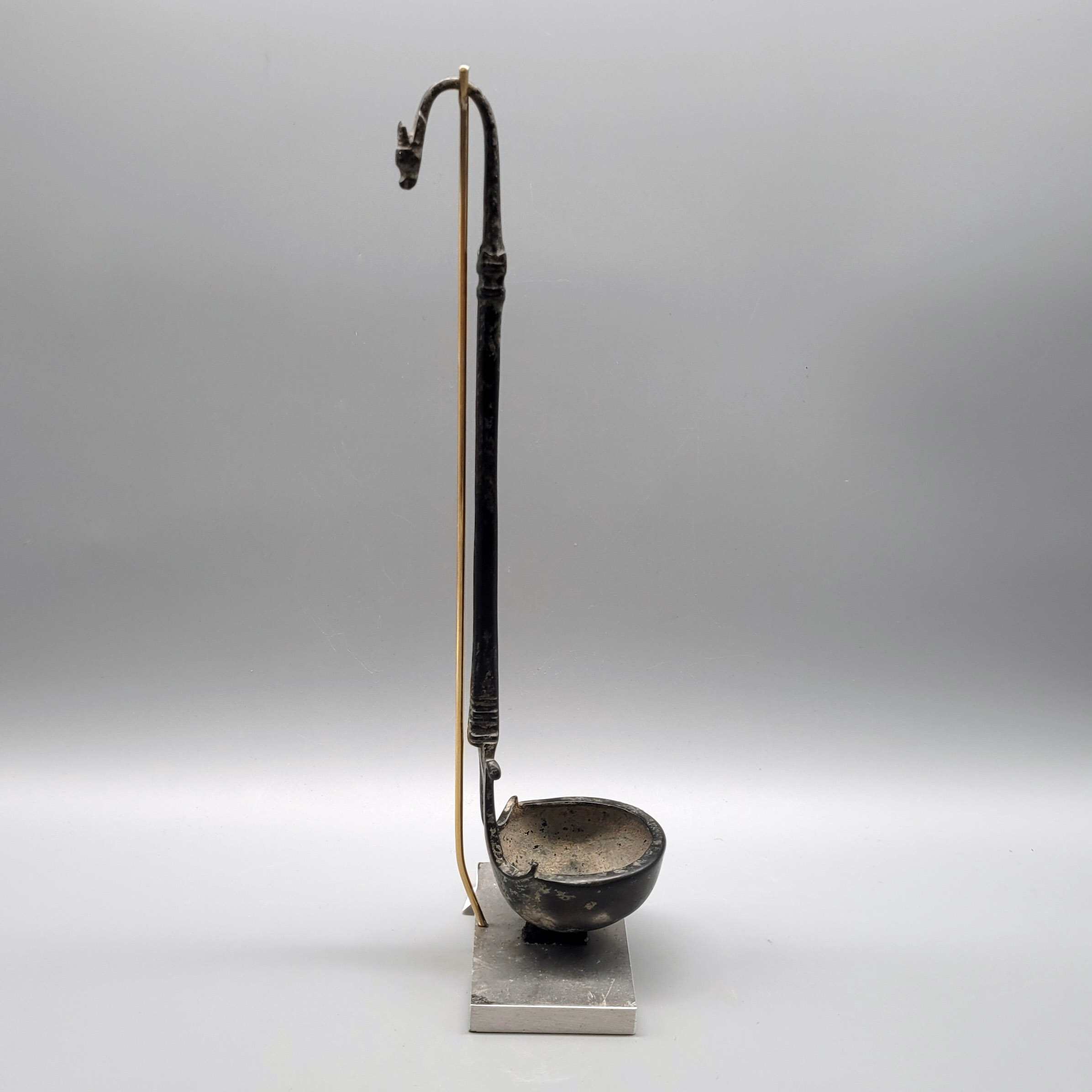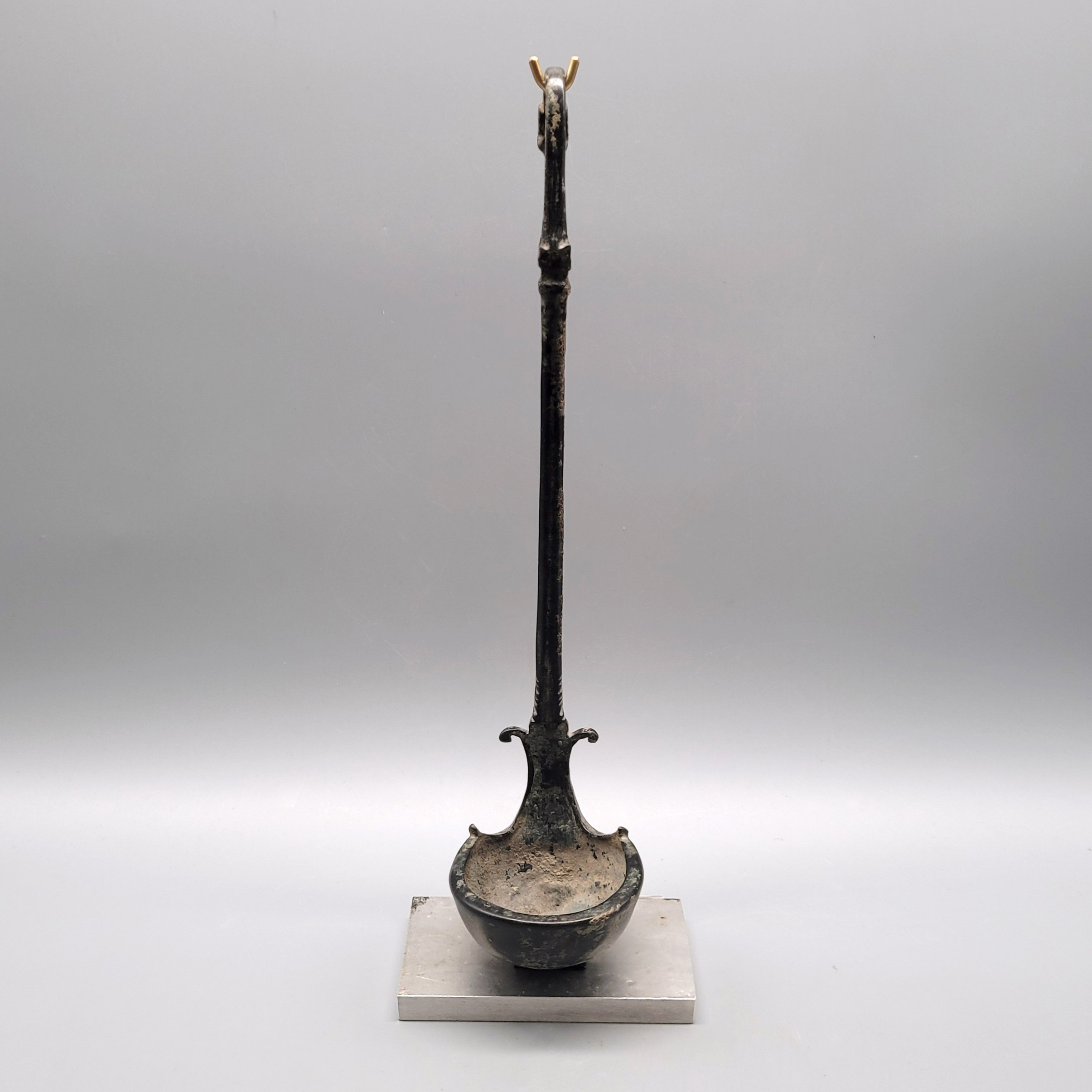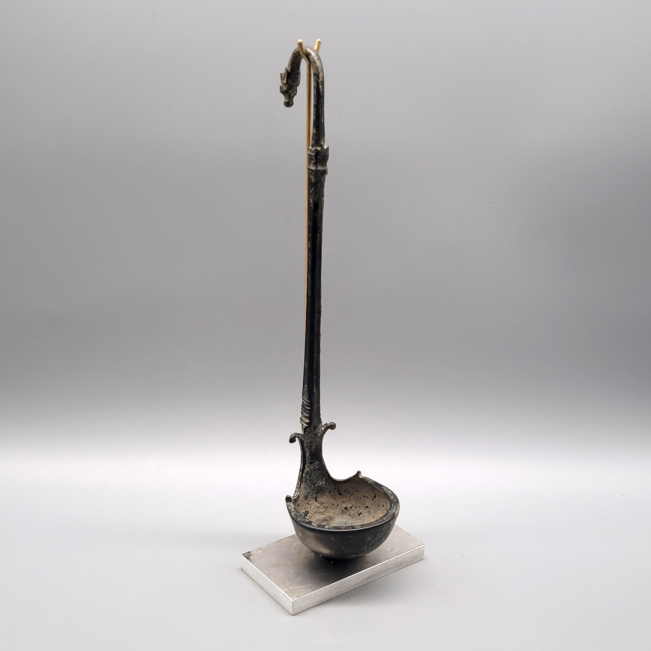 Bronze, Kelle mit volutenartigem Übergang in den Griff, dessen gebogenes Ende in Form eines stilisierten Stierkopfes, Italo-Griechisch 5.-4. Jahrhundert v. Chr., Höhe 28,5 cm (Prov.: Forum Romanum Antik, Köln, 1997)