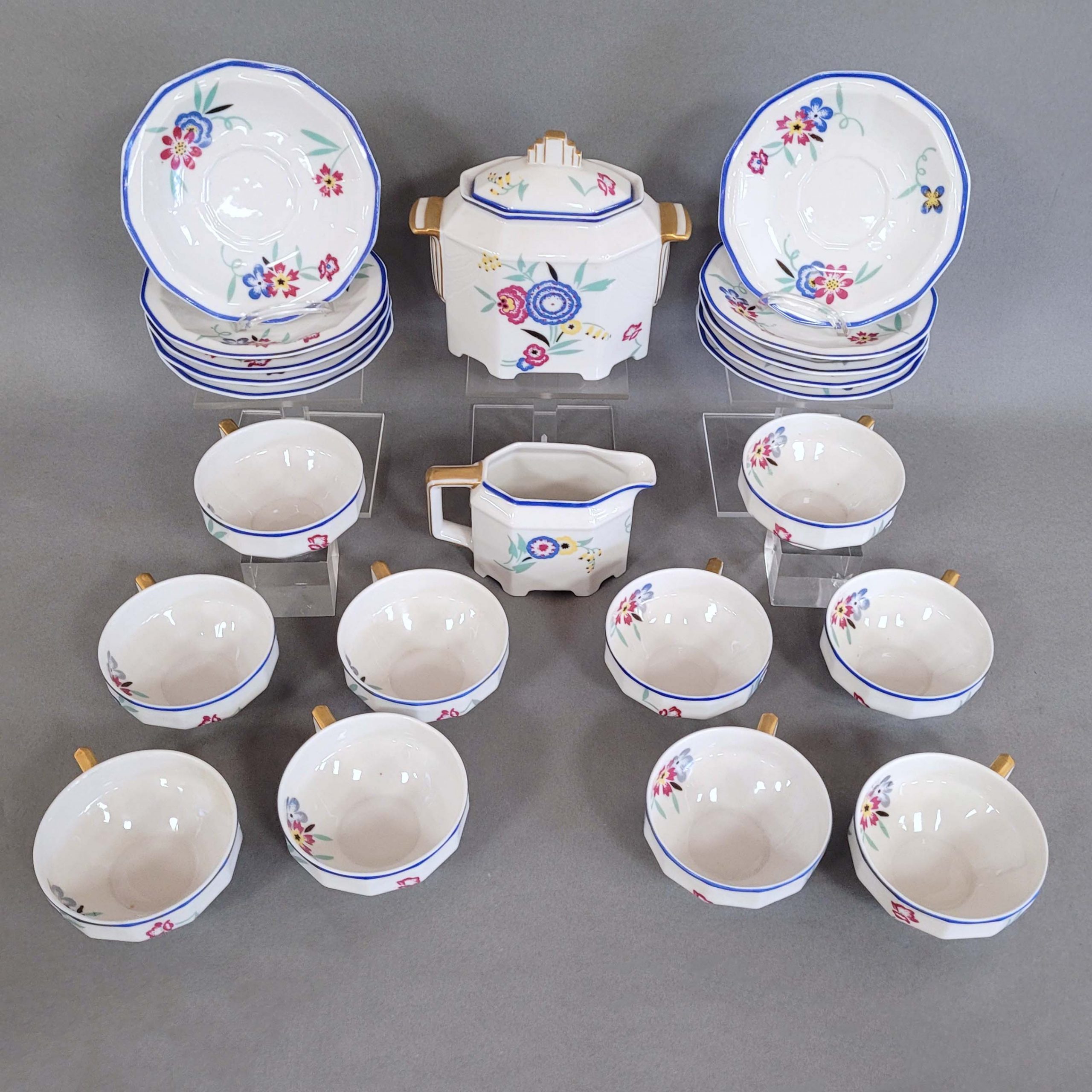 Art-Déco Teeservice für 10 PersonenPorzellan, bemalt, partiell vergoldet, B&C, Limoges, 10 Tassen, 10 Untertassen, Sahnegießer, Zuckerdose, Höhe 14 cm (Zuckerdose)
