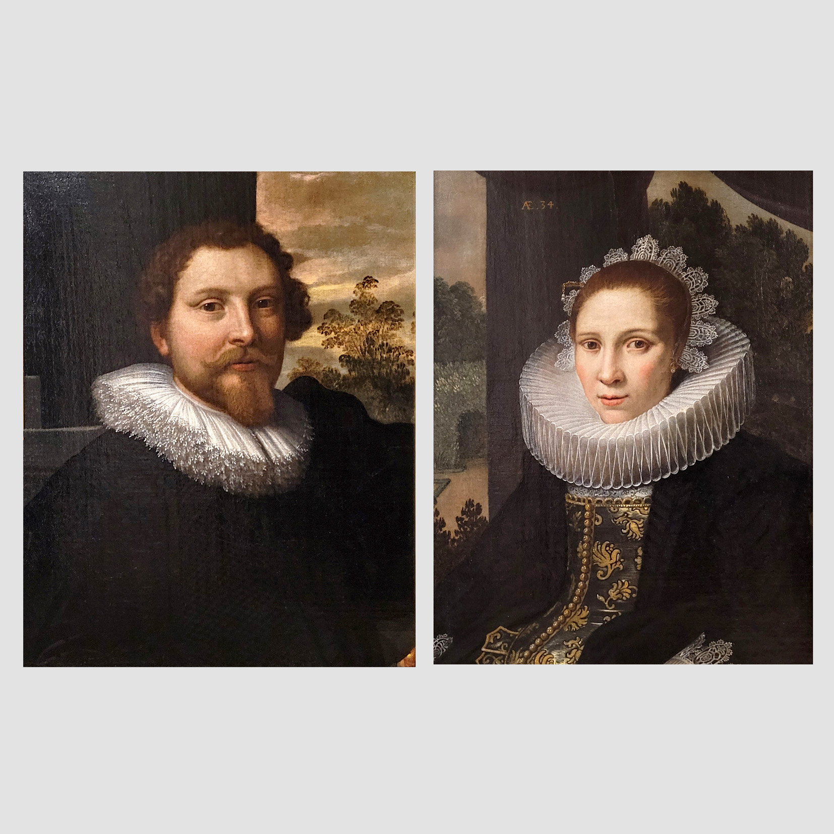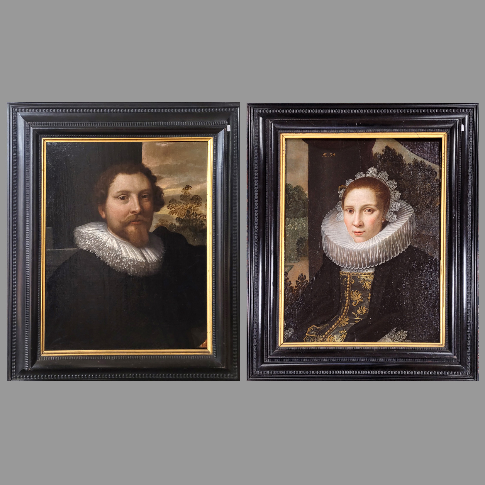 Umkreis Cornelis de Vos (1584-1651), Öl auf Leinwand, altdoubliert, auf dem Frauenporträt Bezeichnung „AE[TATIS] 34“, 61 x 50 cm bzw. 63,5 x 48 cm, Rahmen