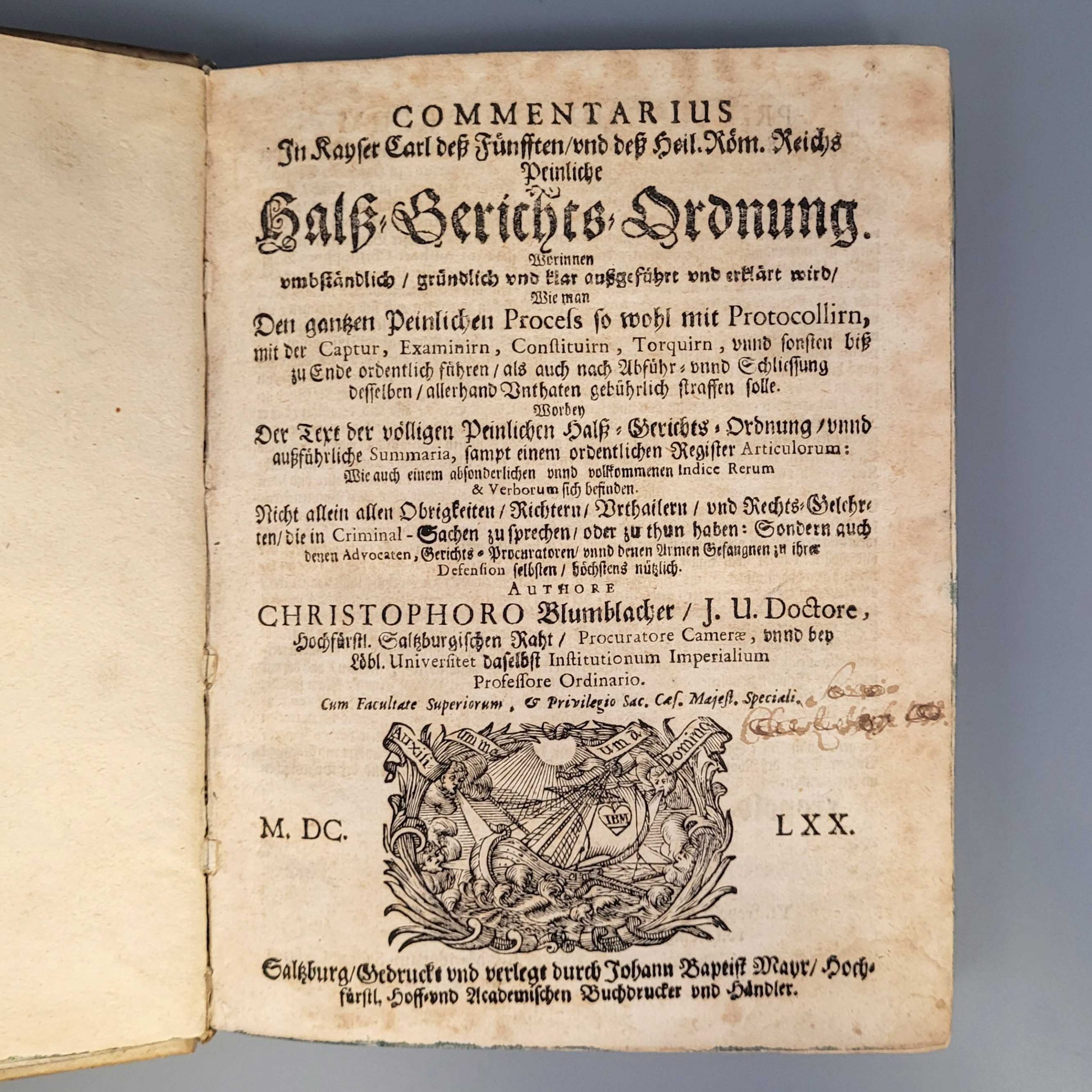 BLUMBLACHER, Christoph: Commentarius in Kayser Carl deß Fünfften und deß Heil. Röm. Reichs Peinliche Halß-Gerichts-Ordnung