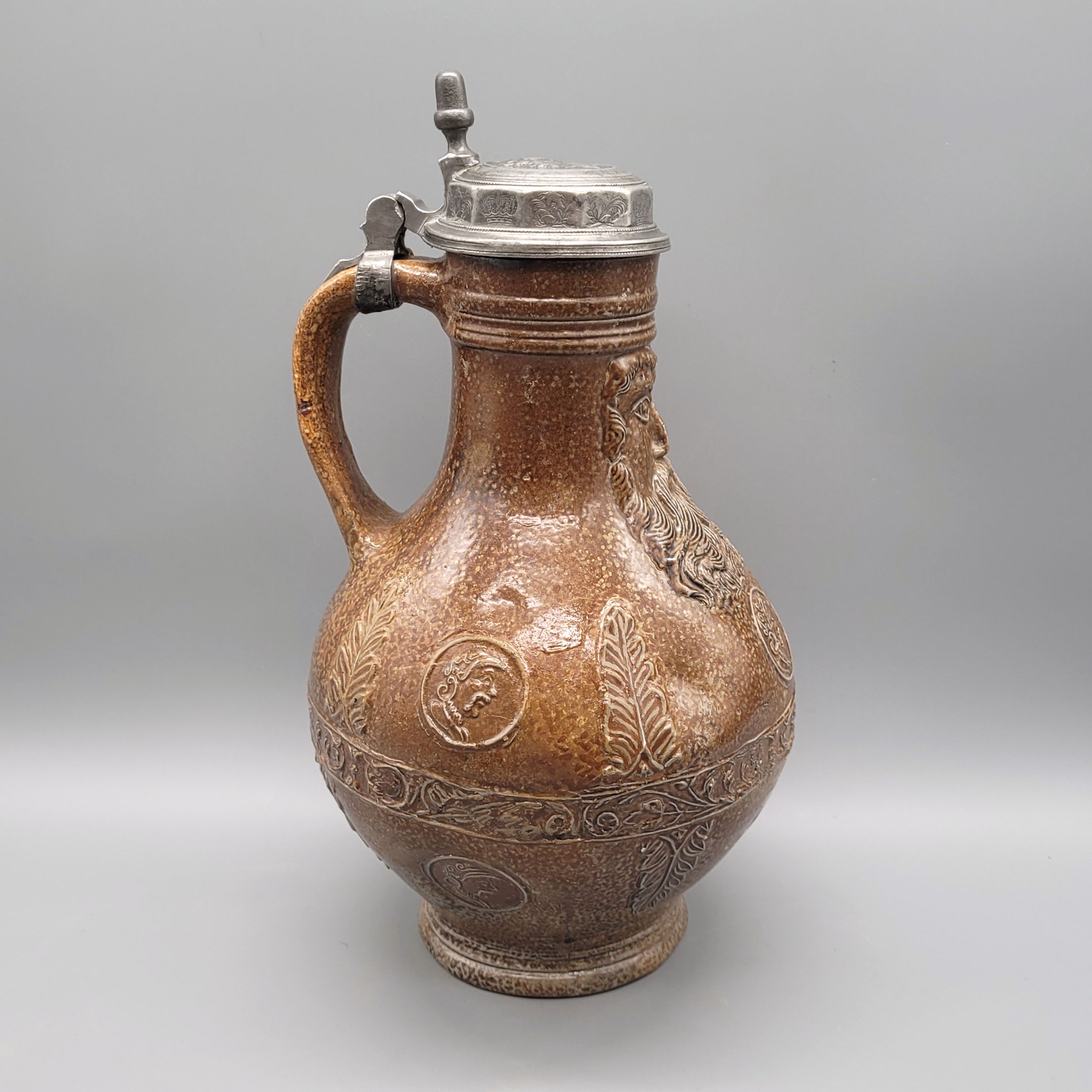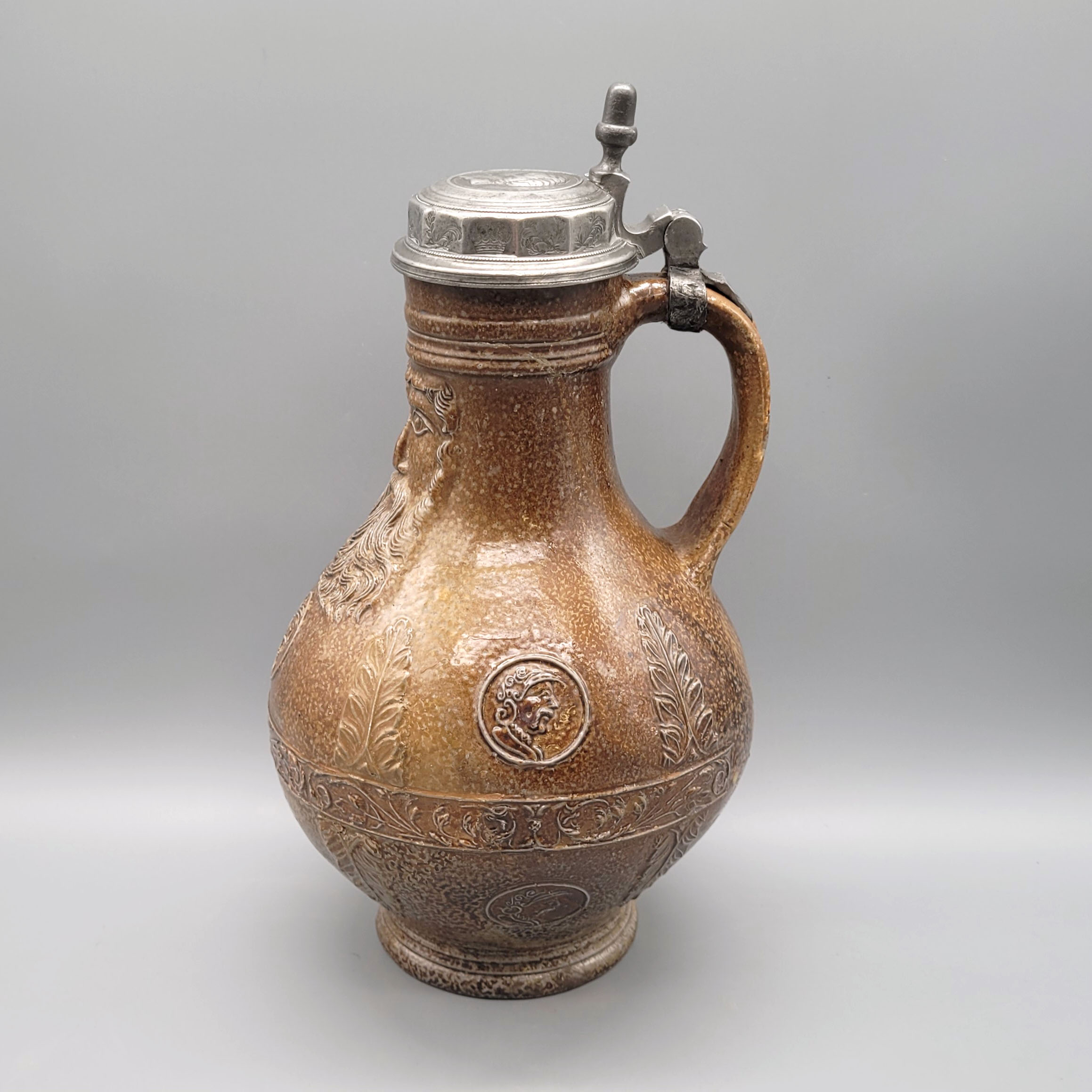 BartmannskrugSteinzeug, glasiert, Medaillonporträtauflagen, Palmetten, Rankenfries, Zinnmontierung des 19. Jahrhunderts, Frechen Mitte 16. Jahrhundert, Höhe 30 cm (Ergänzungen)