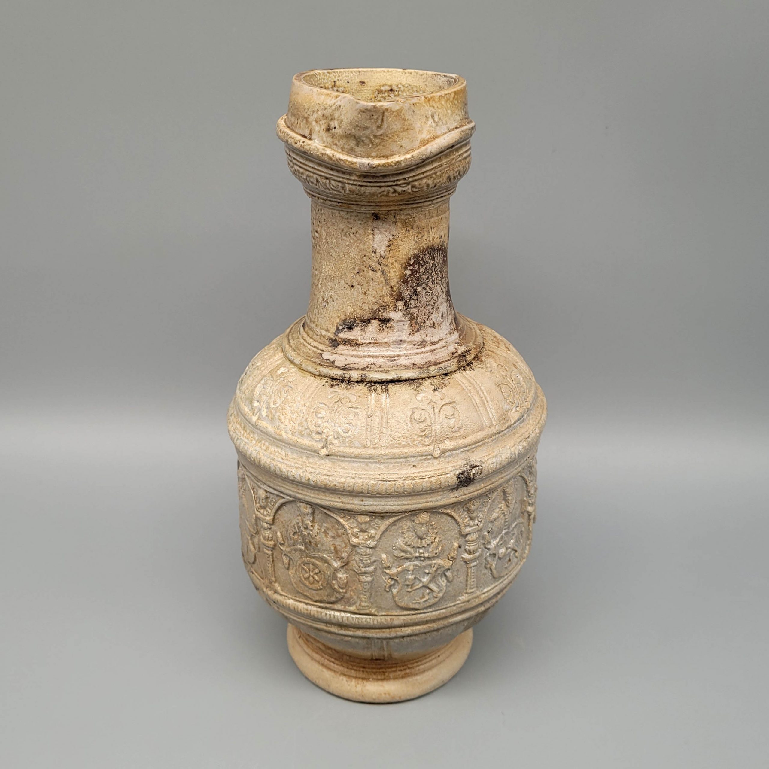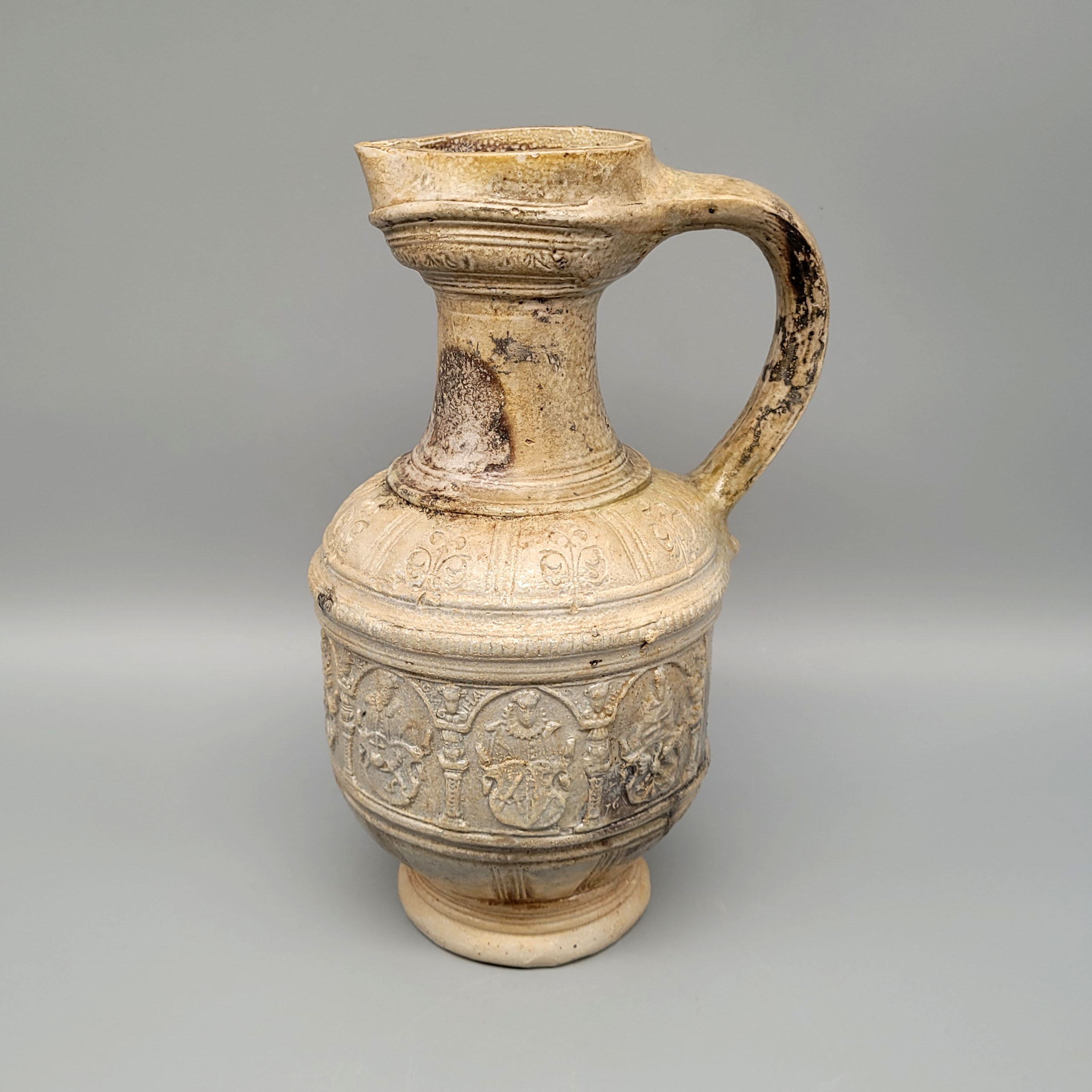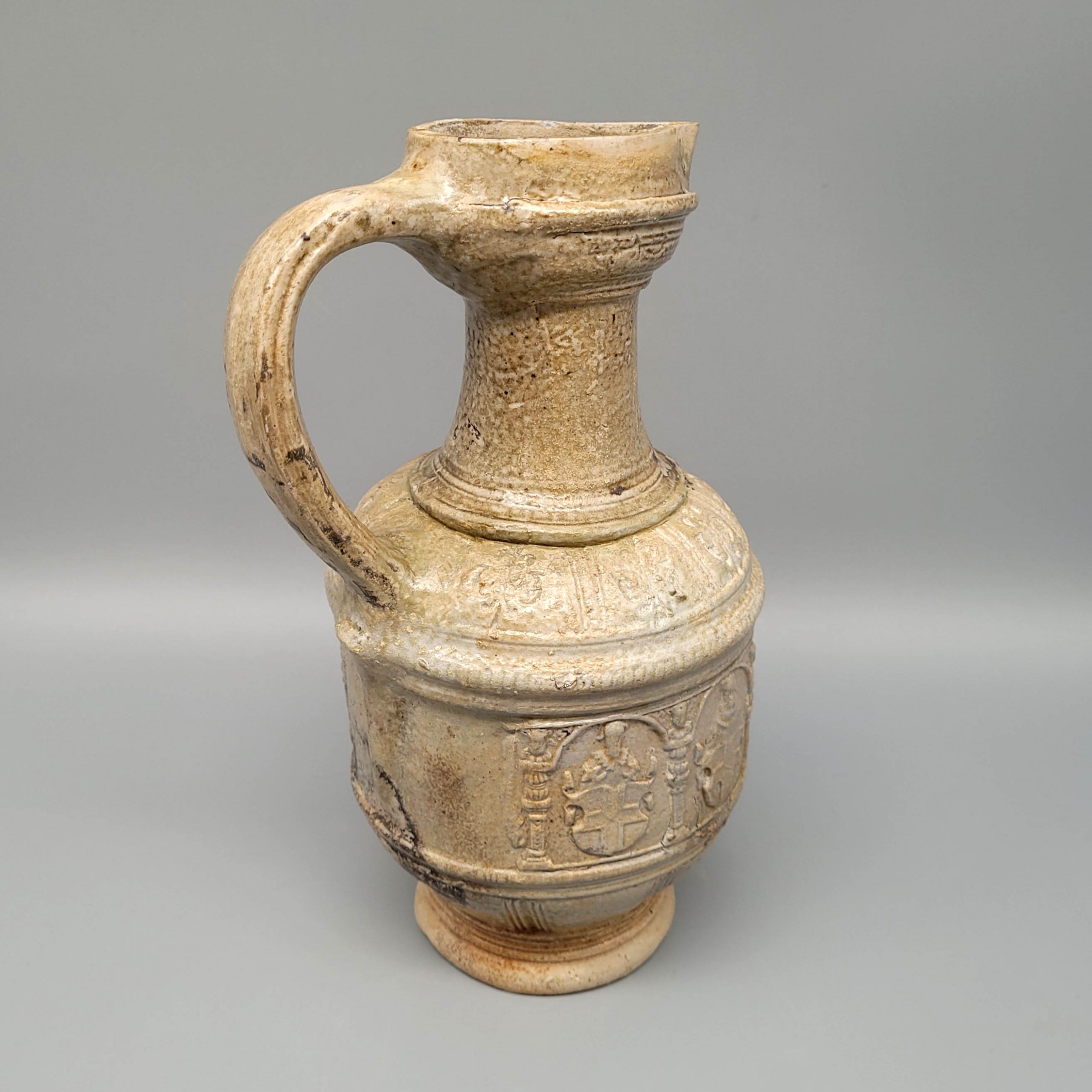 Steinzeug, hell glasiert, auf dem Hals Kanneluren mit gestempelten floralen Elementen, auf der Wandung Kurfürstenfries mit Wappen unter Arkadenbögen, datiert 1603, Raeren Anfang 17. Jahrhundert, Höhe 23,5 cm (restauriert, zusammengesetzt, Ergänzungen)