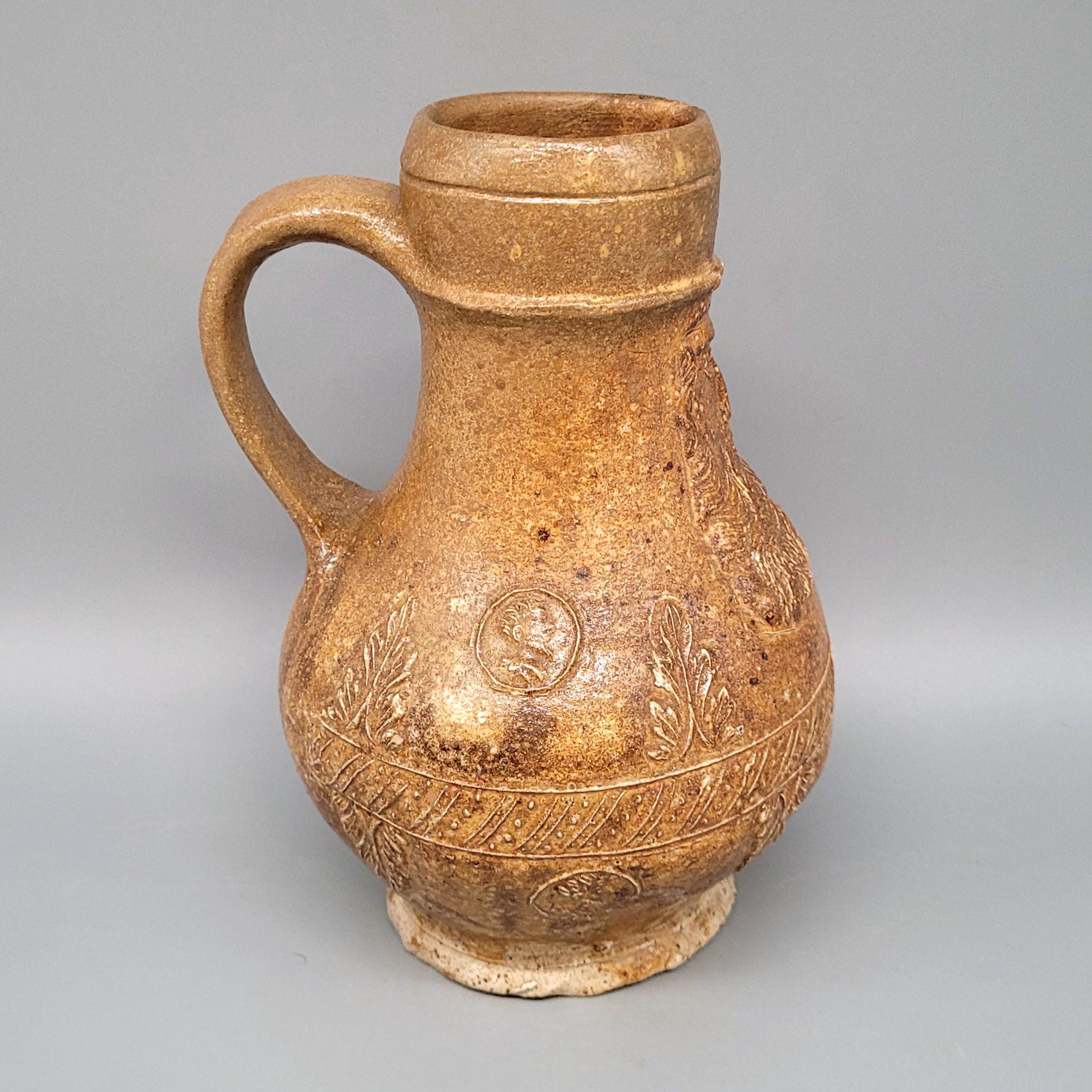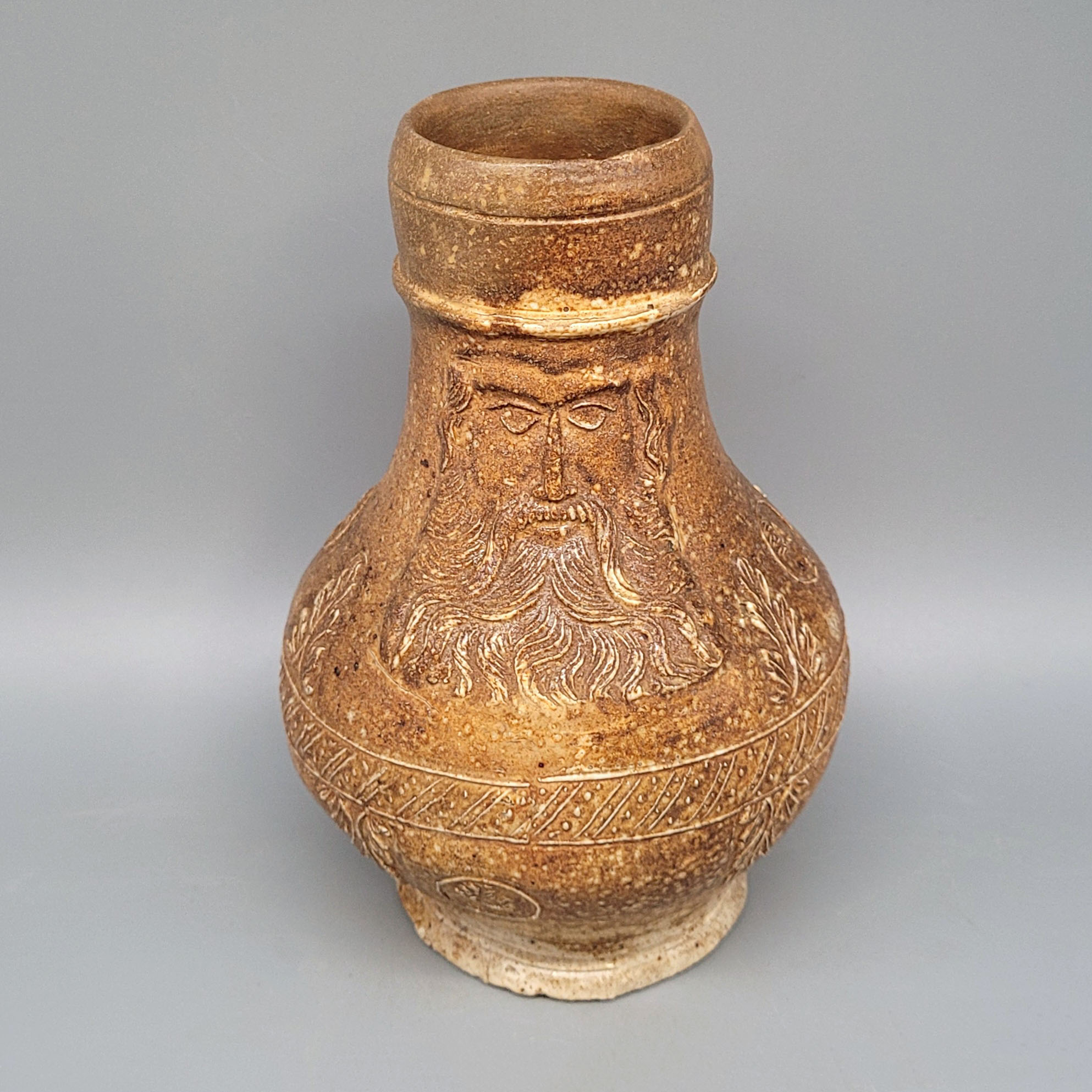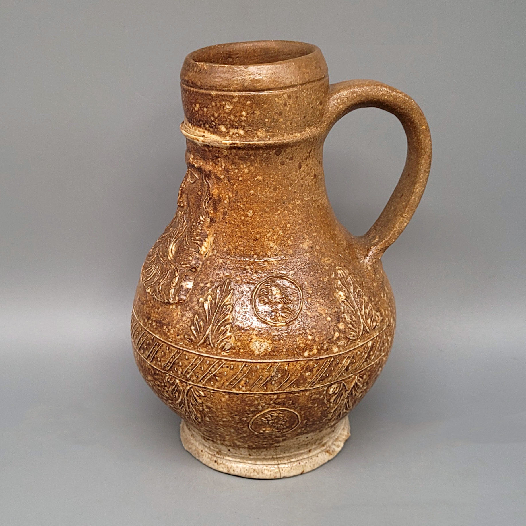 BartmannskrugSteinzeug, glasiert, Porträtmedaillons, Palmetten, Zierband, Frechen 16. Jahrhundert, Höhe 18 cm (Henkel ergänzt)