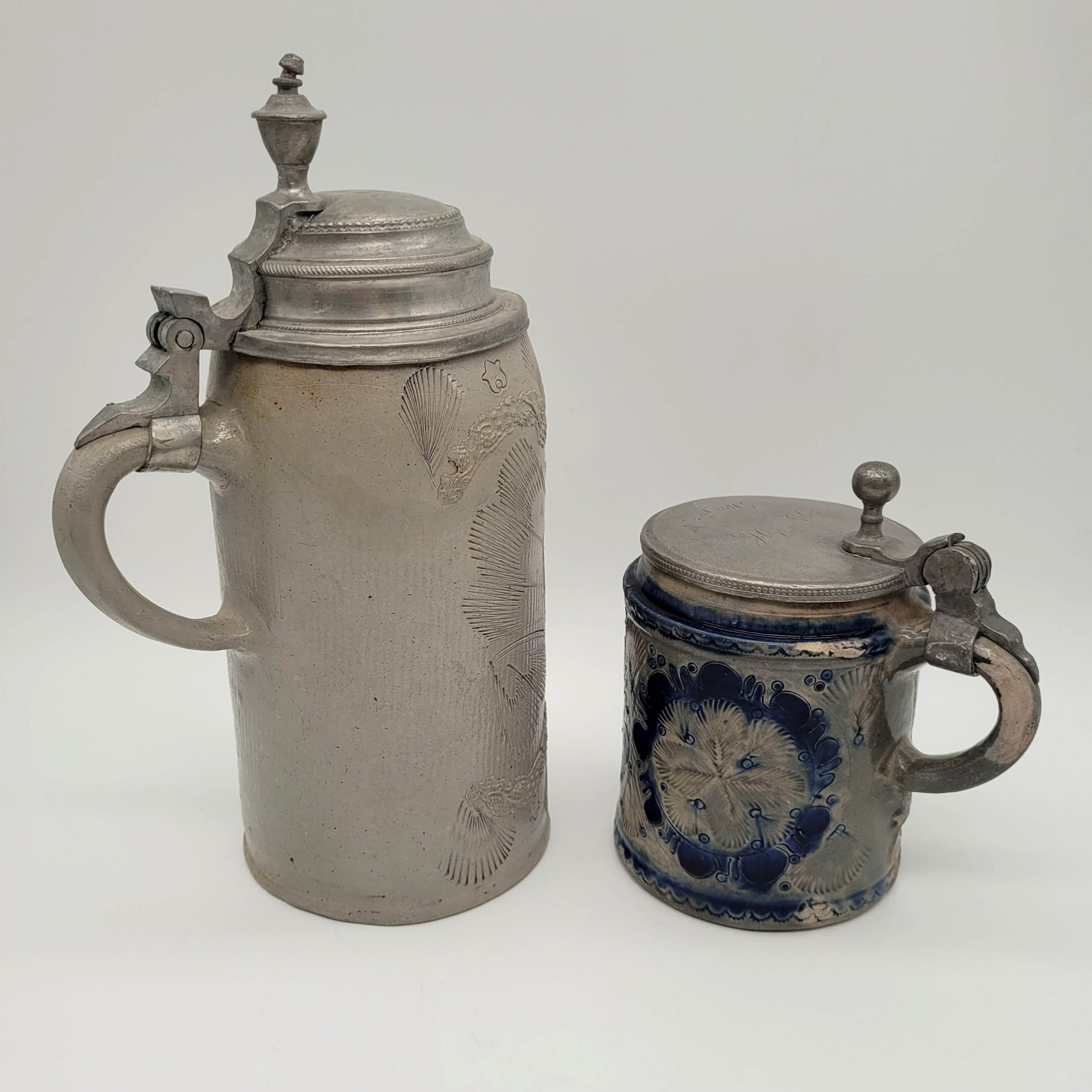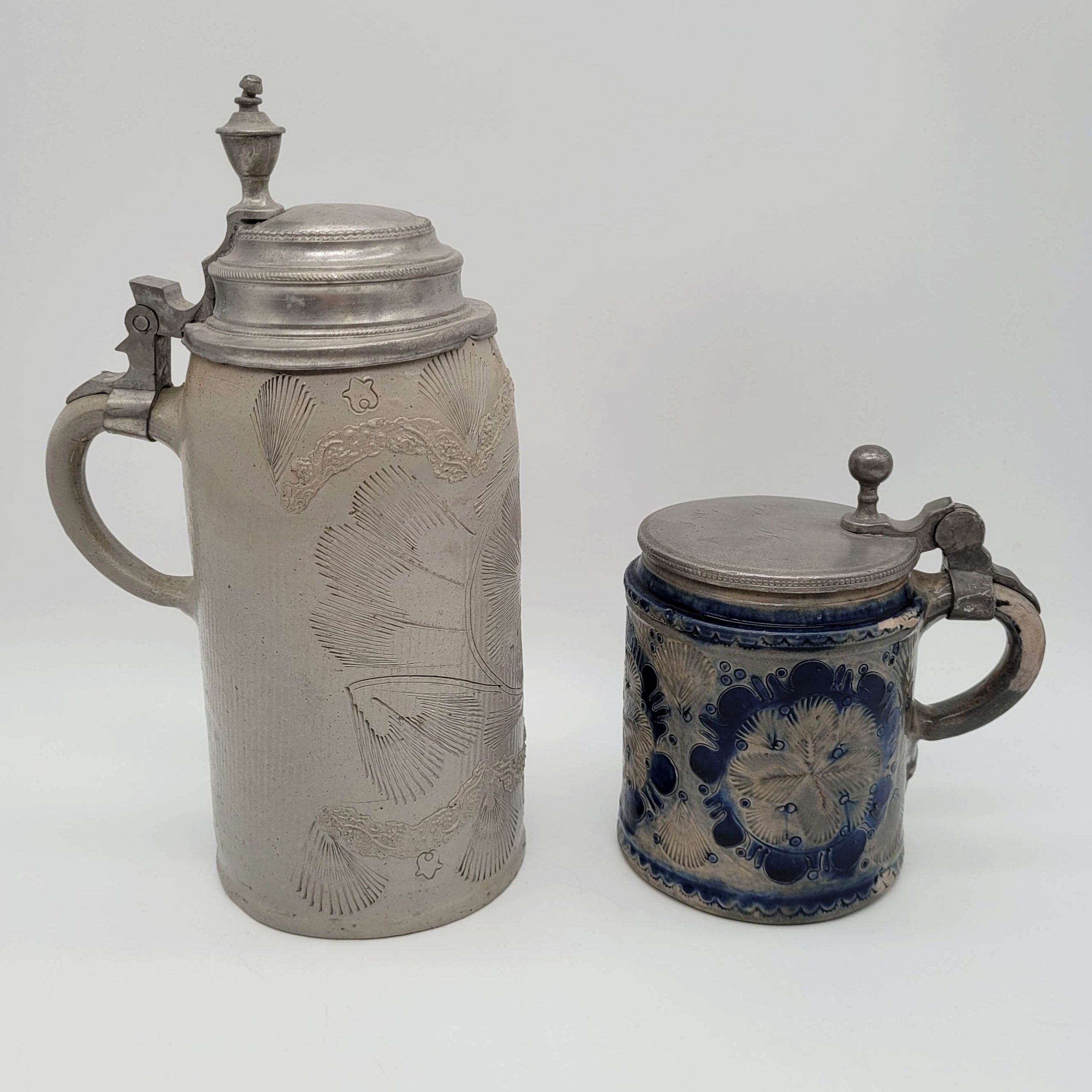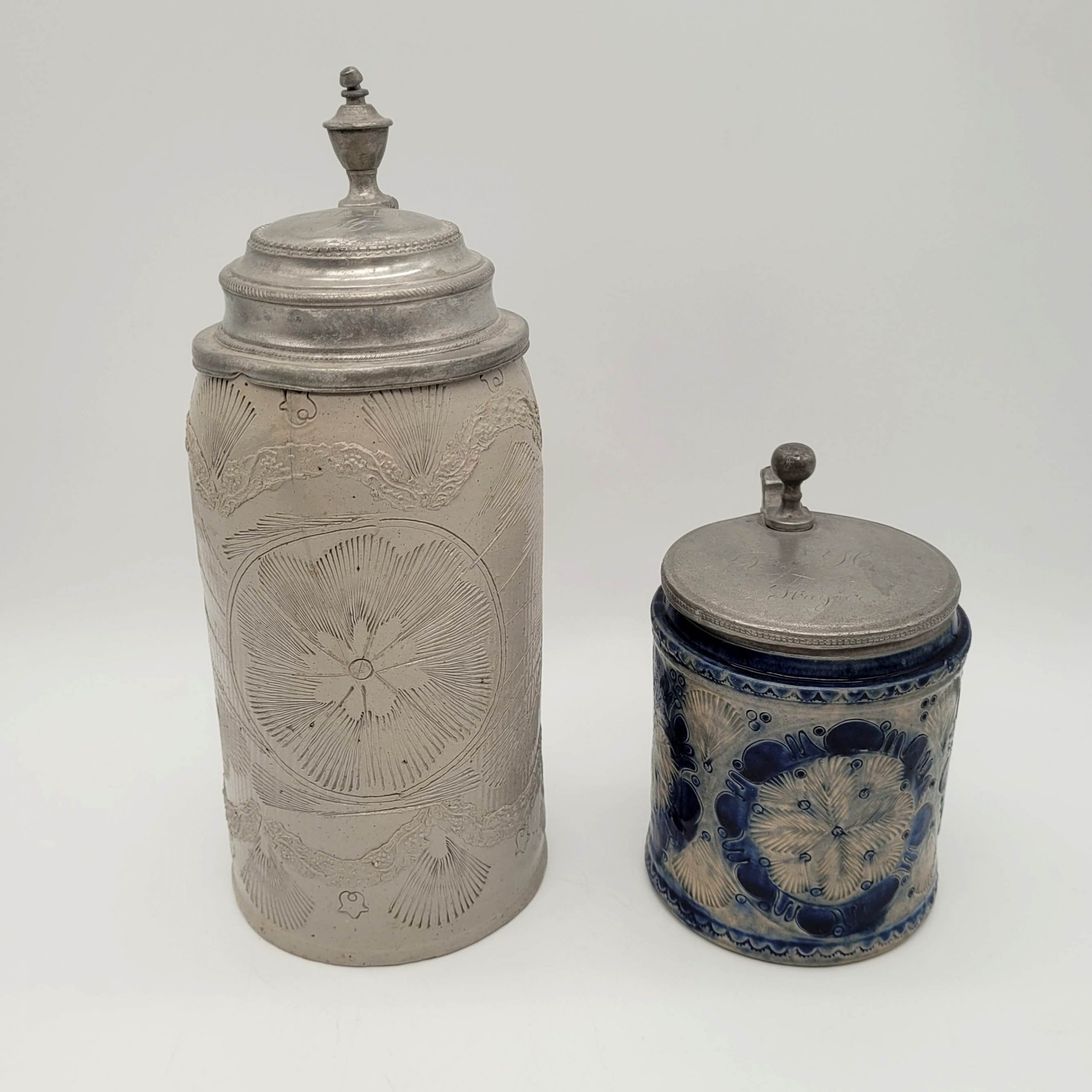 Zwei WalzenkrügeSteinzeug, glasiert, Wandung mit Rosetten in Knibisdekor, Bemalung mit Kobaltblau (1x), Zinndeckel, Westerwald 18./19. Jahrhundert, Höhe bis zu 25 cm