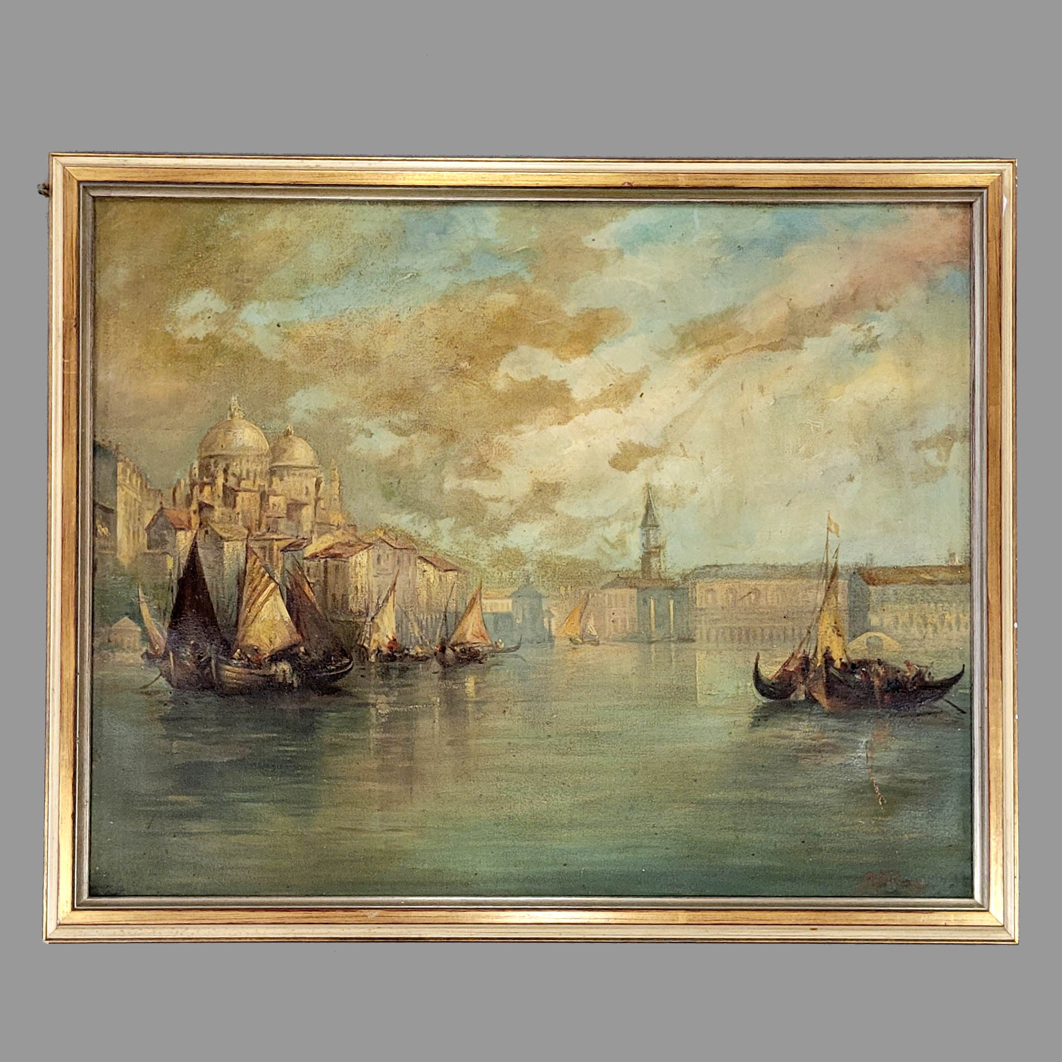 DEUTSCHER MEISTER: Ansicht auf VenedigÖl auf Leinwand, undeutlich signiert unten rechts, 62 x 79 cm, Rahmen (Riss in der Leinwand unten rechts)