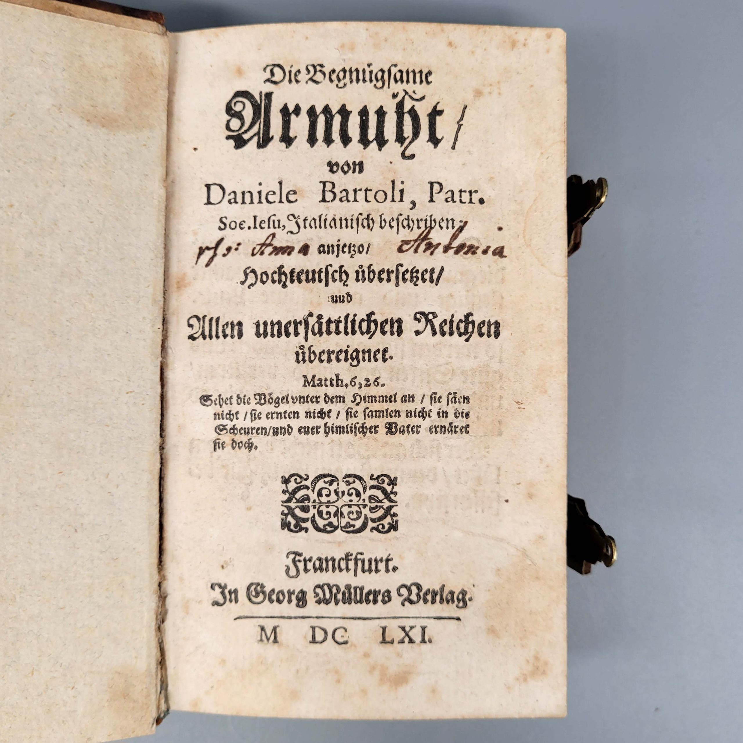 BARTOLI, Daniele: Die Begnügsame Armuht…Frankfurt (Georg Müller) 1661 (späterer Ledereinband mit Metallschließen)Wir weisen darauf hin, dass das Buch nicht kollationiert ist.