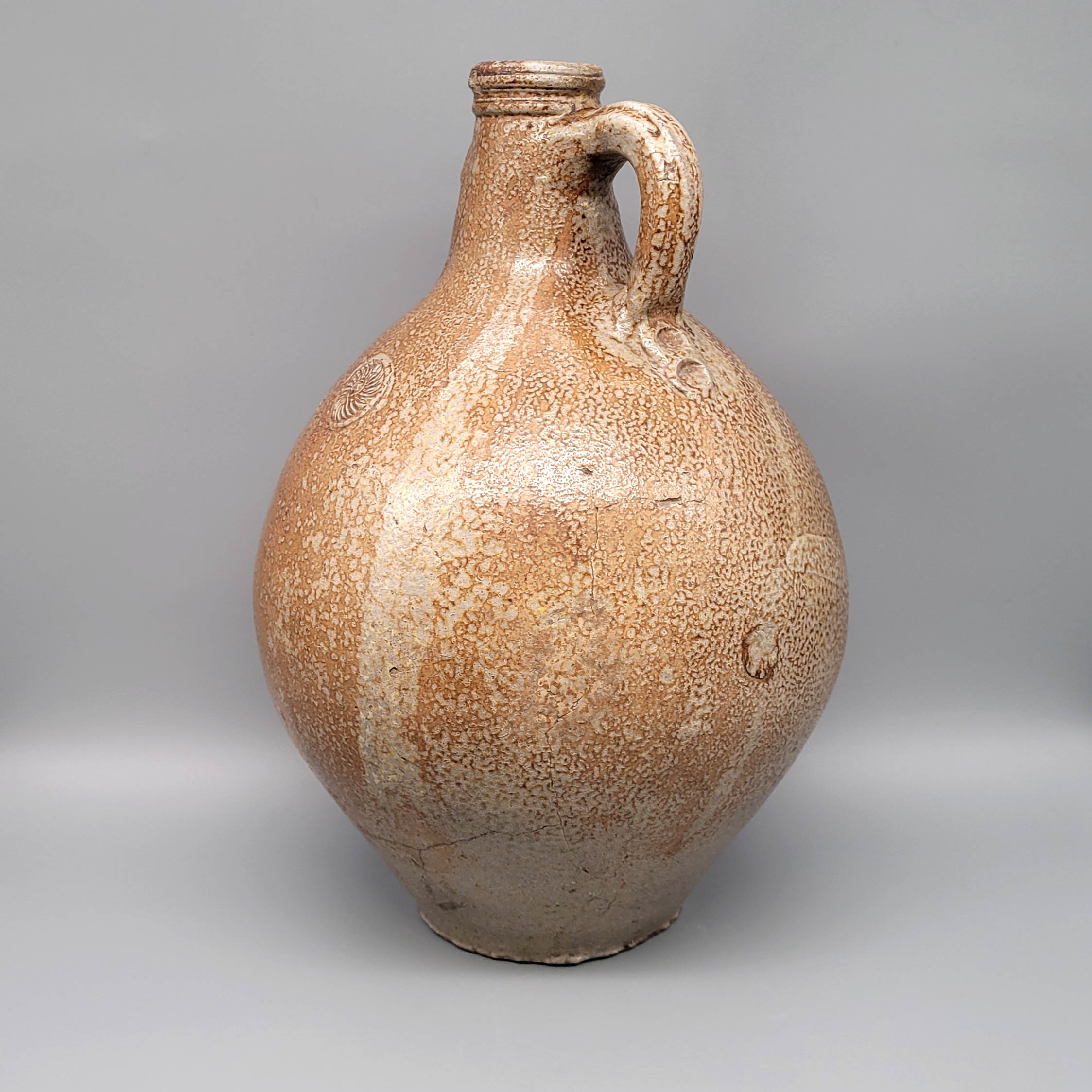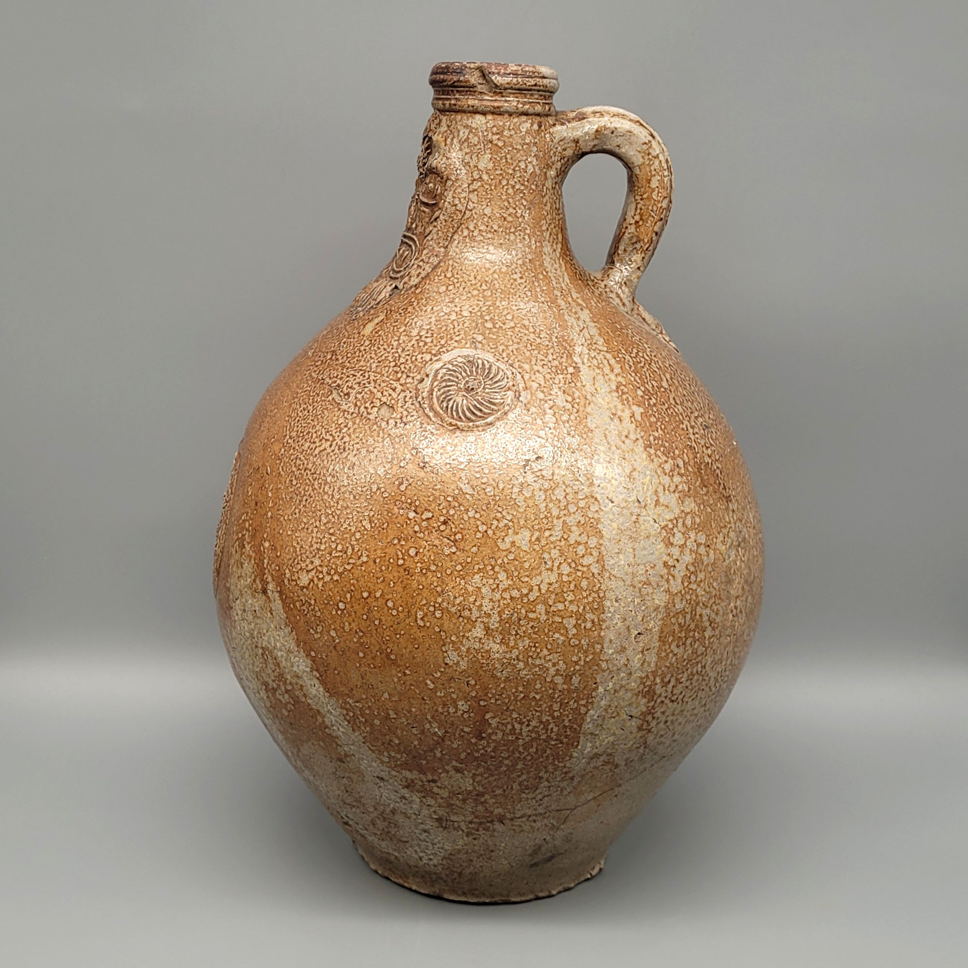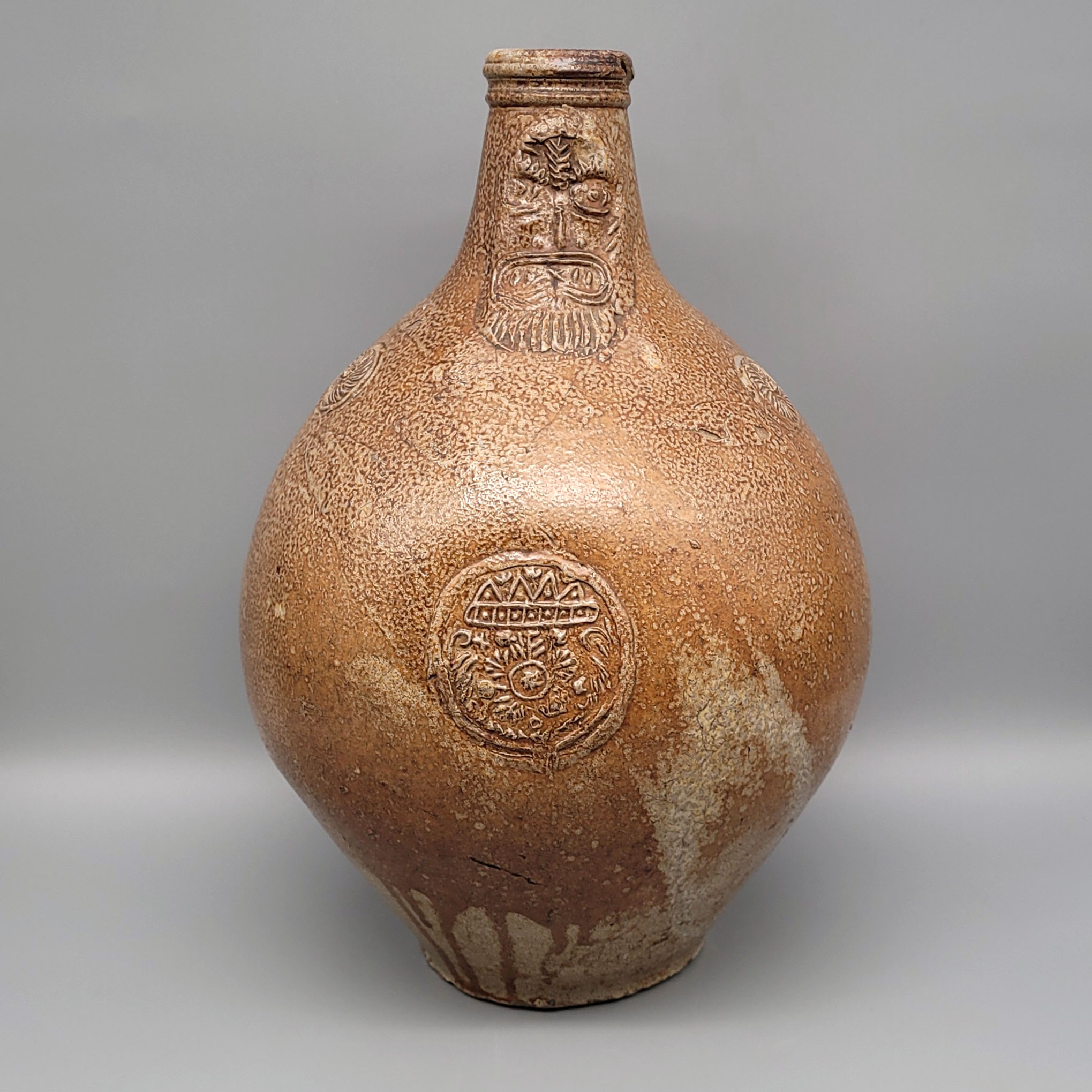 Großer BartmannskrugSteinzeug, braun glasiert, Wappenauflage, kleine Strahlenrosetten, Frechen 17./18. Jahrhundert, Höhe ca. 37 cm