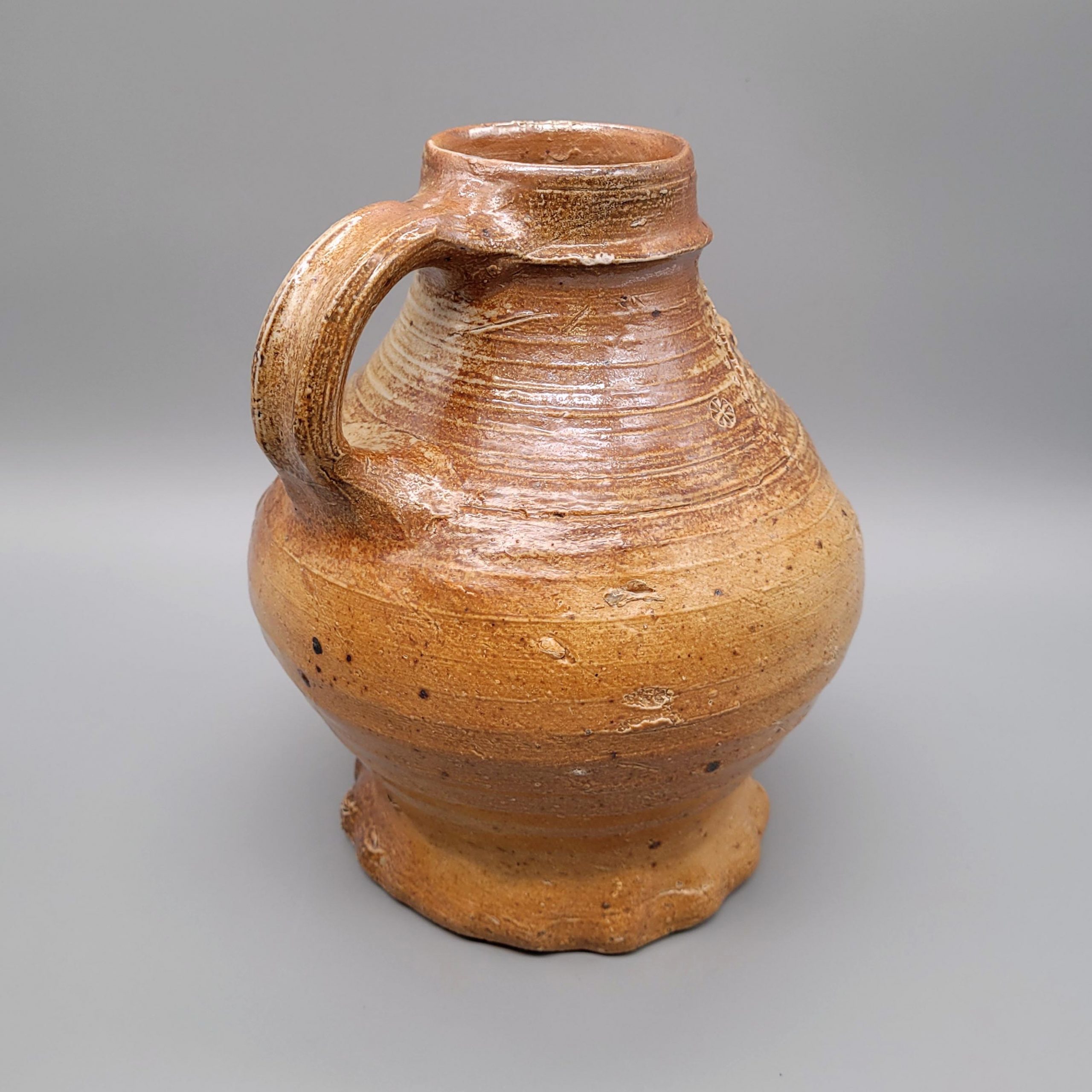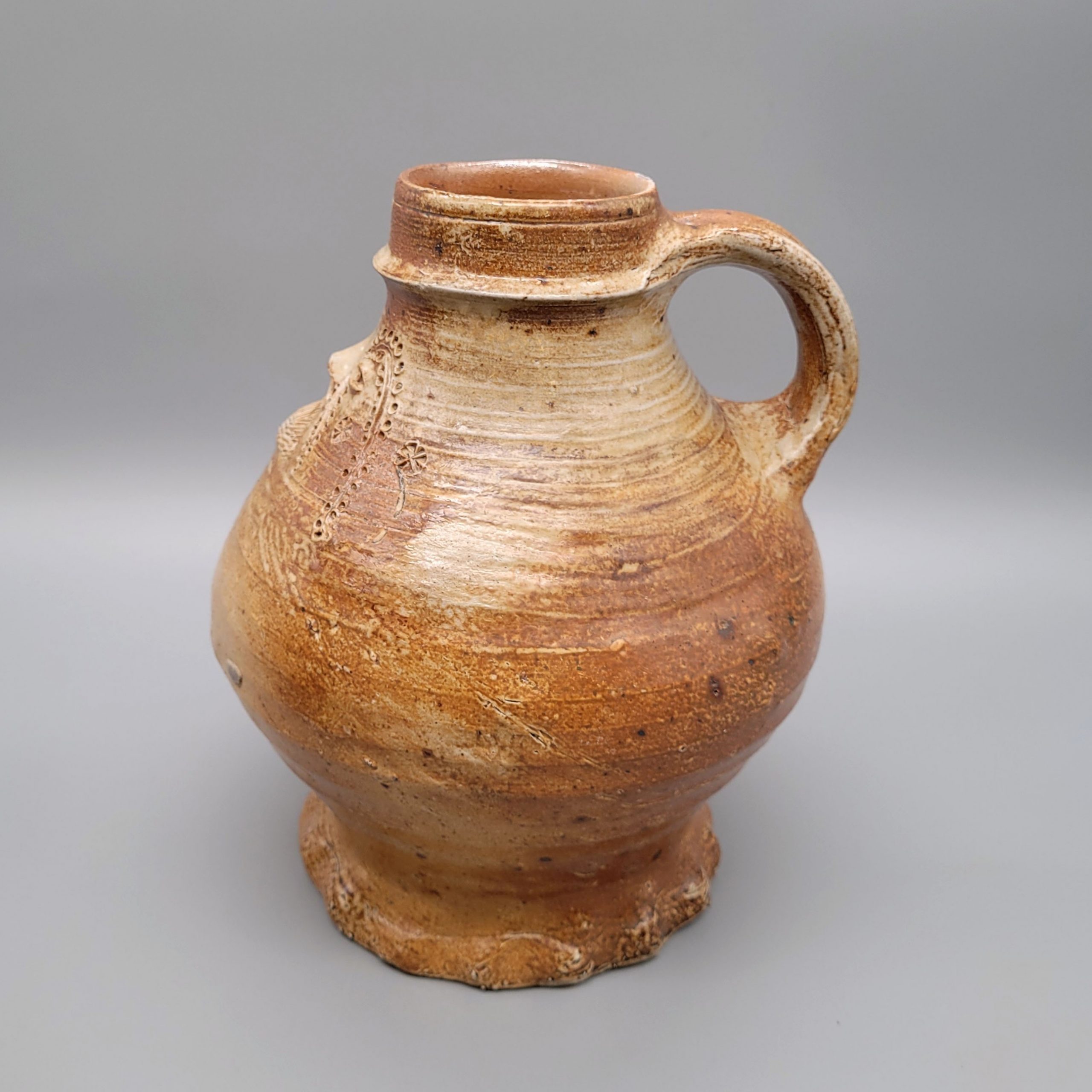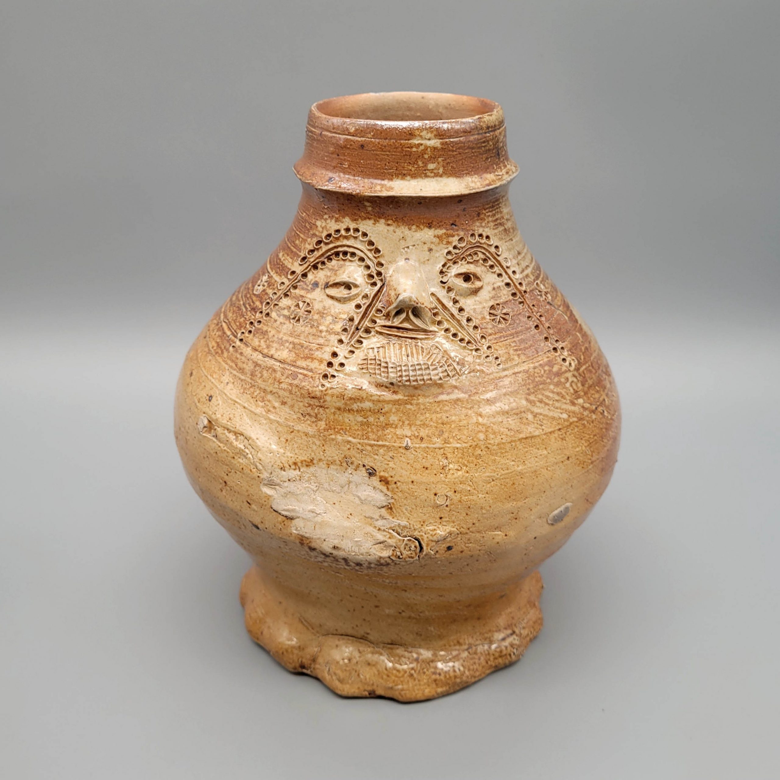 GesichtskrugSteinzeug, hellbraun glasiert, Wellenfuß, Raeren 16. Jahrhundert, Höhe 20 cm (restauriert, zusammengesetzt, ergänzte Fehlstellen)