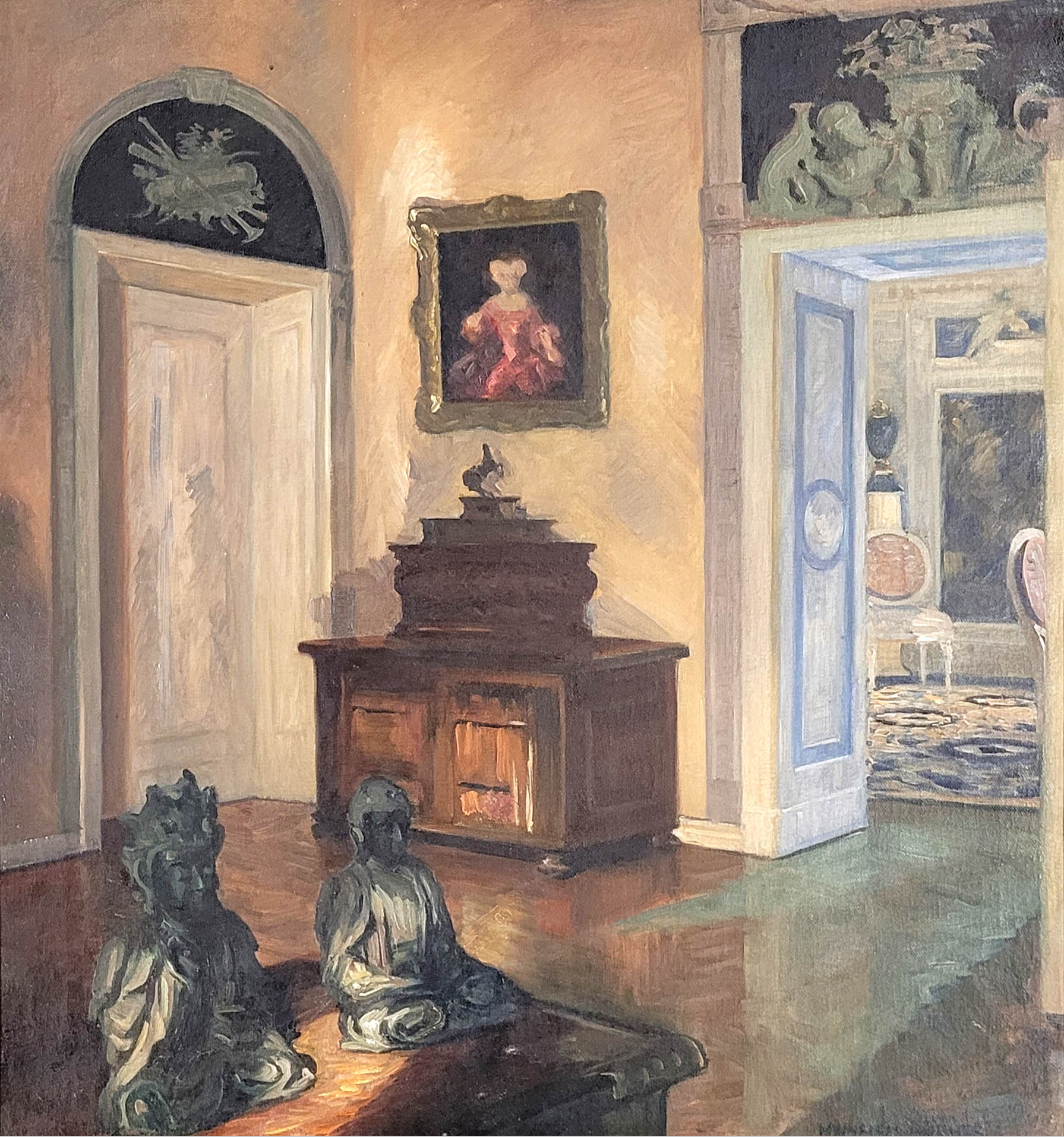 HÜBNER, Heinrich (1869-1945): Schloßinterieur mit Buddha-FigurenÖl auf Leinwand, signiert unten rechts, 67,5 x 63 cm, Rahmen