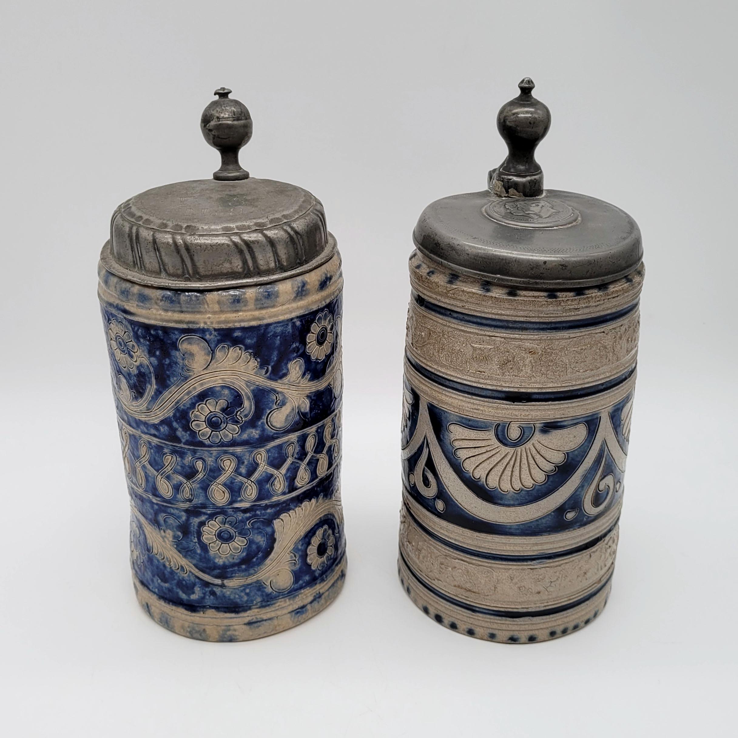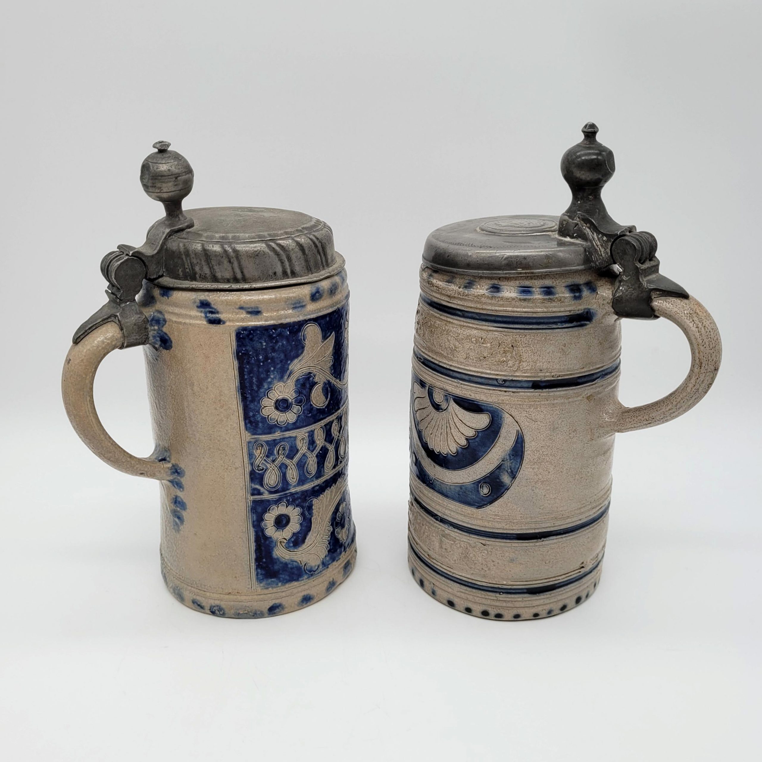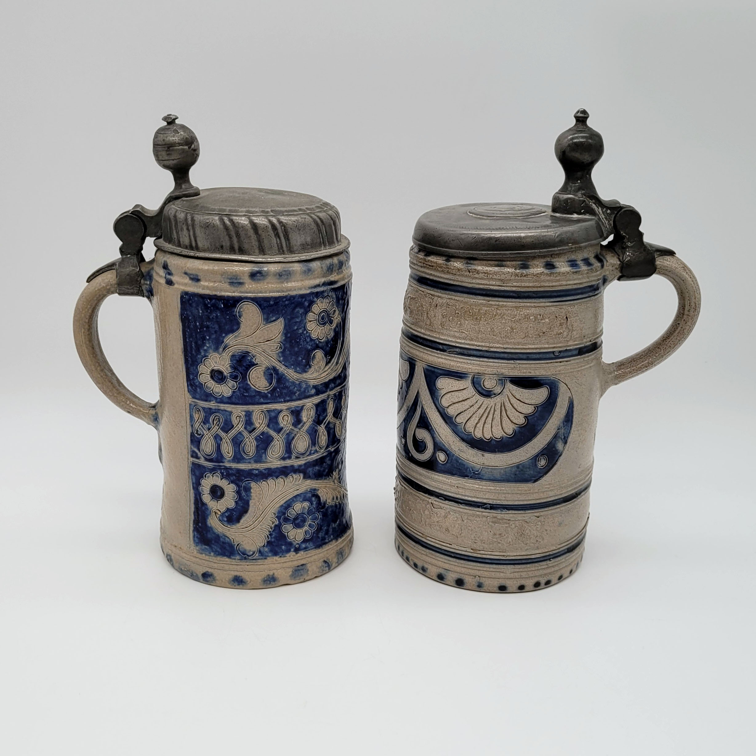 Steinzeug, glasiert, Wandung mit geritztem Blüten- und Schleifbanddekor (1x), Wandung mit geritztem fächerförmigen Blütendekor zwischen zwei Reliefbandauflagen (1x), Bemalung mit Kobaltblau (2x), Zinndeckel (2x), Westerwald Anfang 19. Jahrhundert, Höhe bis zu 23 cm