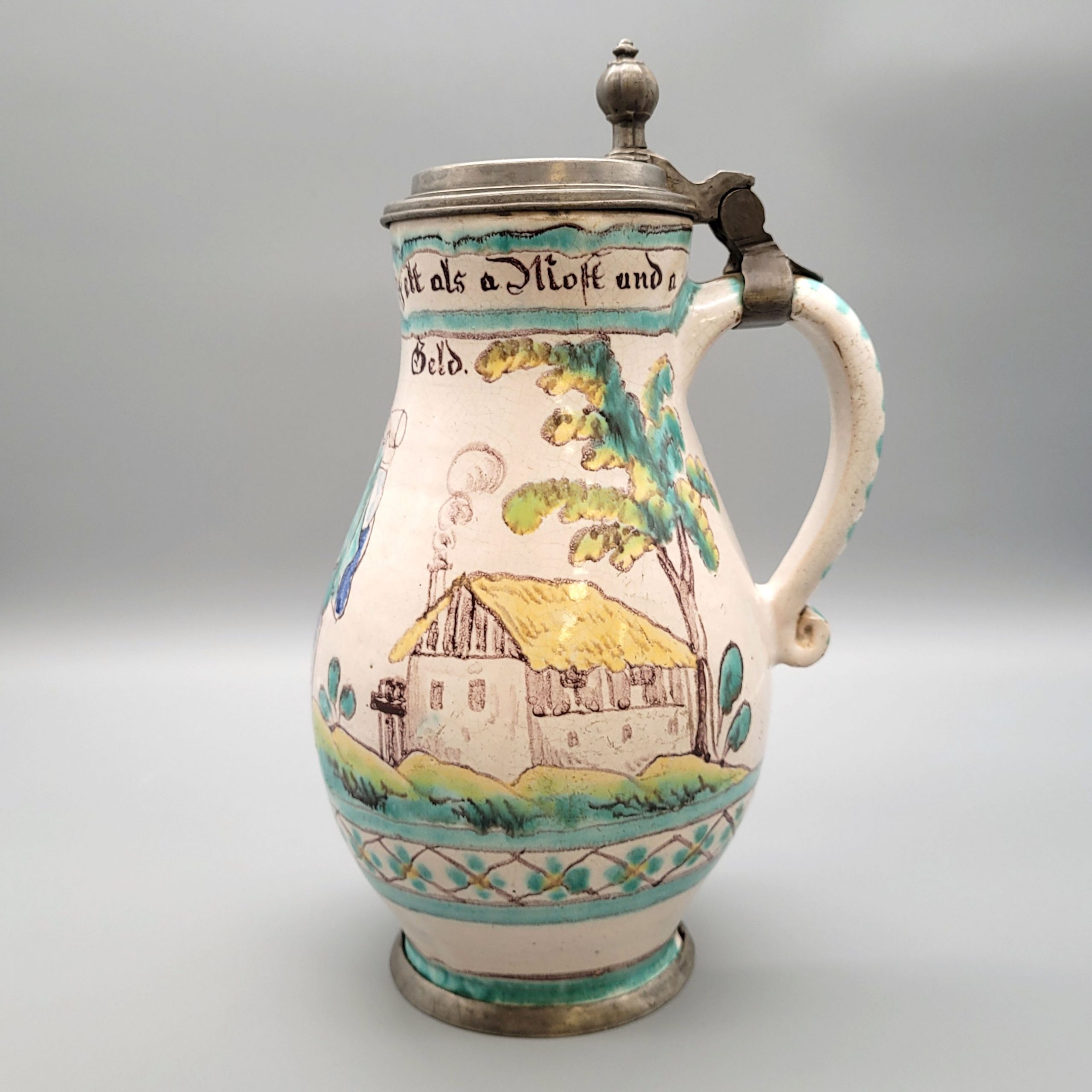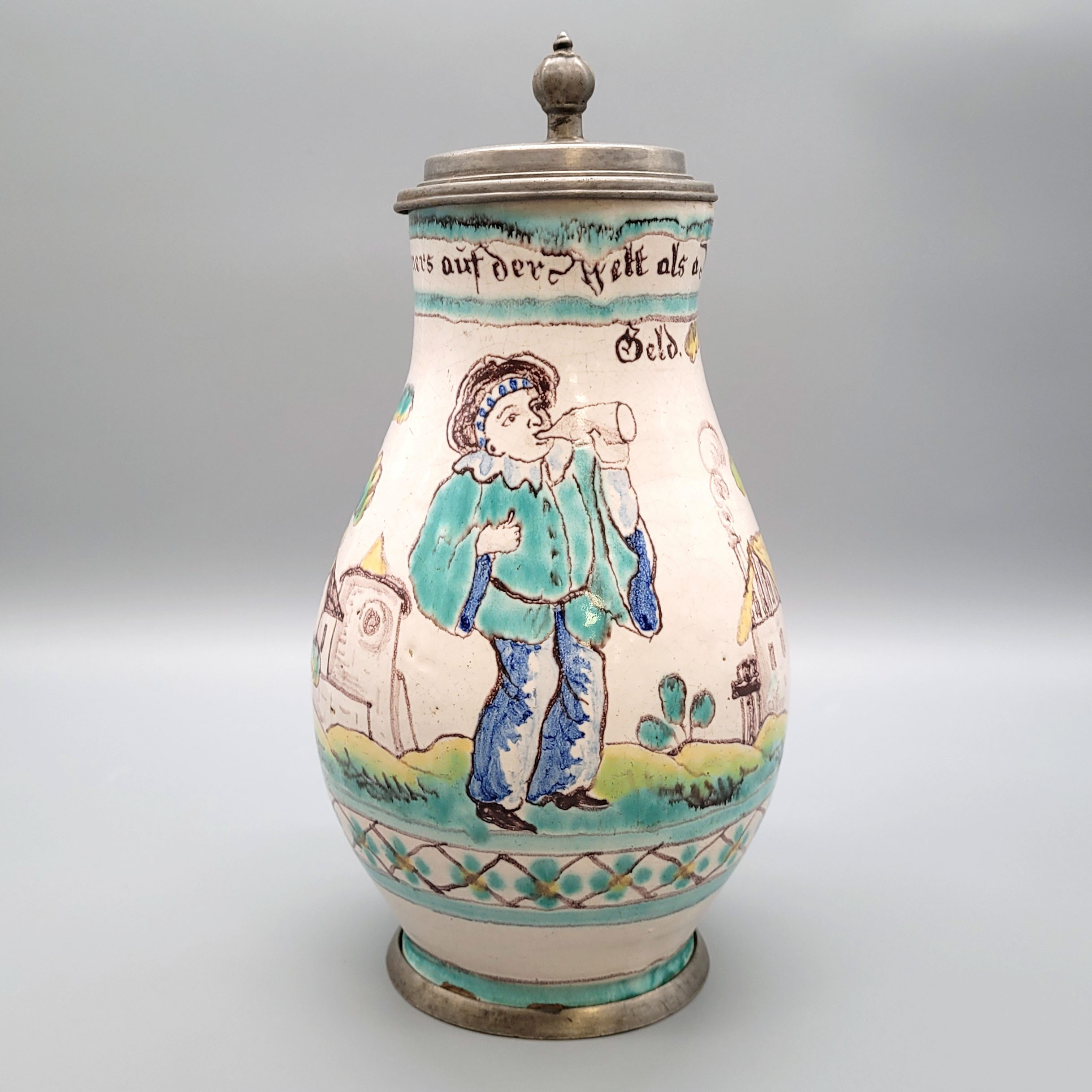 BirnkrugFayence figürlich bemalt, Spruch „Nichts Schöneres auf der Welt als a Most und a Geld“, Zinnmontierung, Zinndeckel, Süddeutschland 18./19. Jahrhundert, Höhe 26 cm