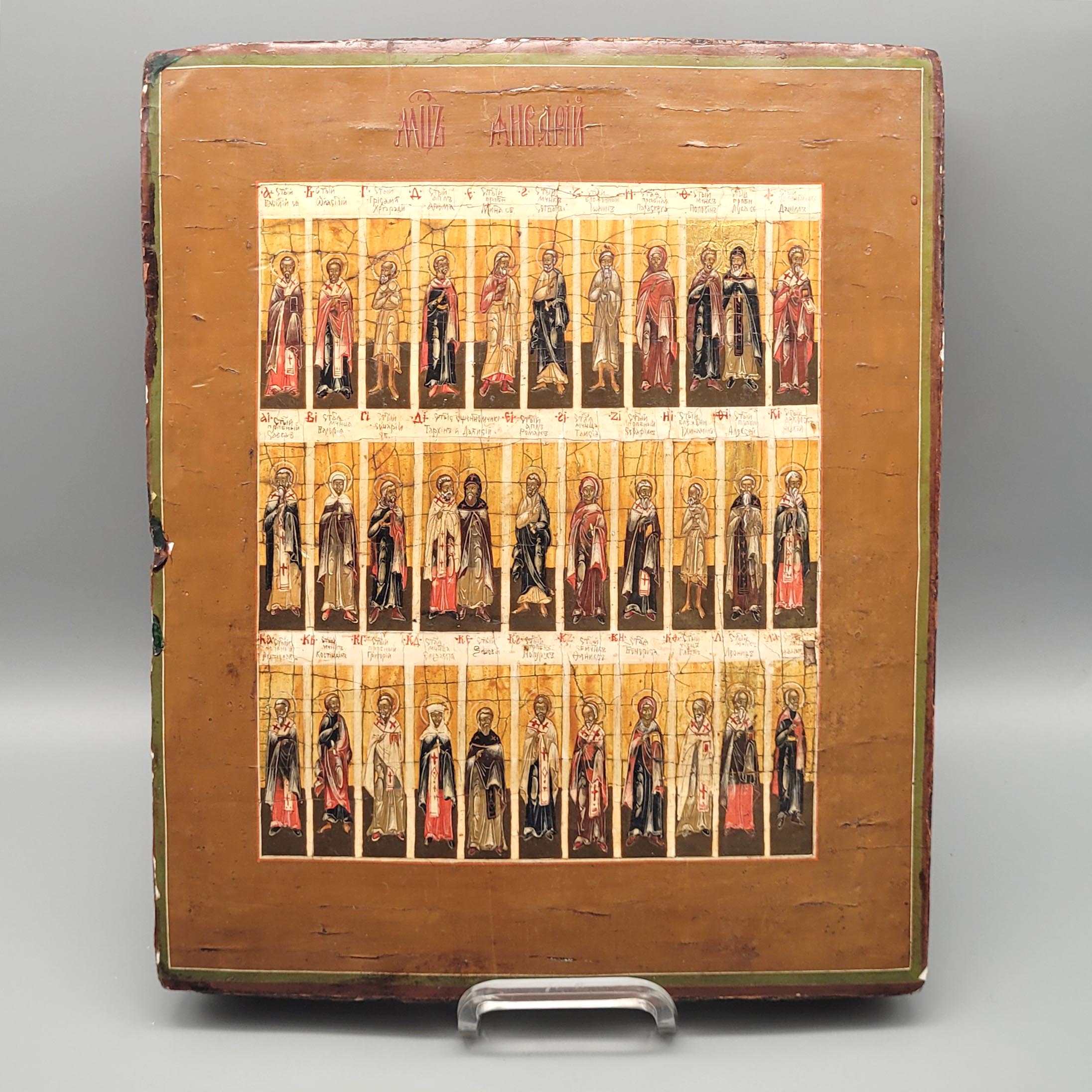 Ikone „Verschiedene Heilige“Tempera, Gold auf Holz, Darstellung verschiedener männlicher und weiblicher Heiliger gereiht nach dem Alphabet, um 1800, 32 x 26 cm