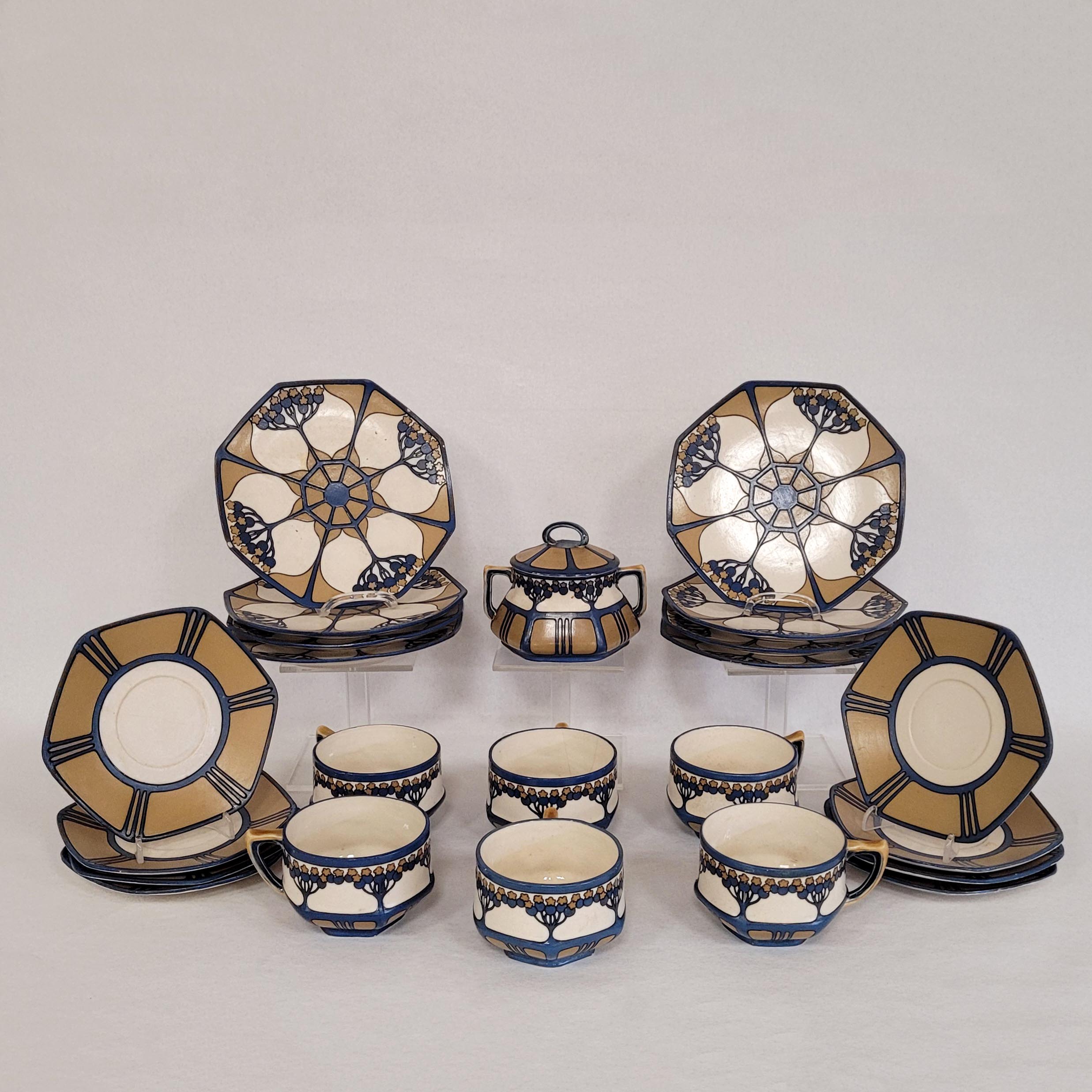 Teeservice für 6 PersonenFeinsteinzeug, Blau-brauner Jugendstildekor, partiell farbig glasiert, Villeroy & Boch, Mettlach, Modellnr. 2962, 3096 bzw. 2948, um 1911-12, bestehend aus 6 Tassen, 8 Untertassen, 8 Kuchenteller, Zuckerdose
