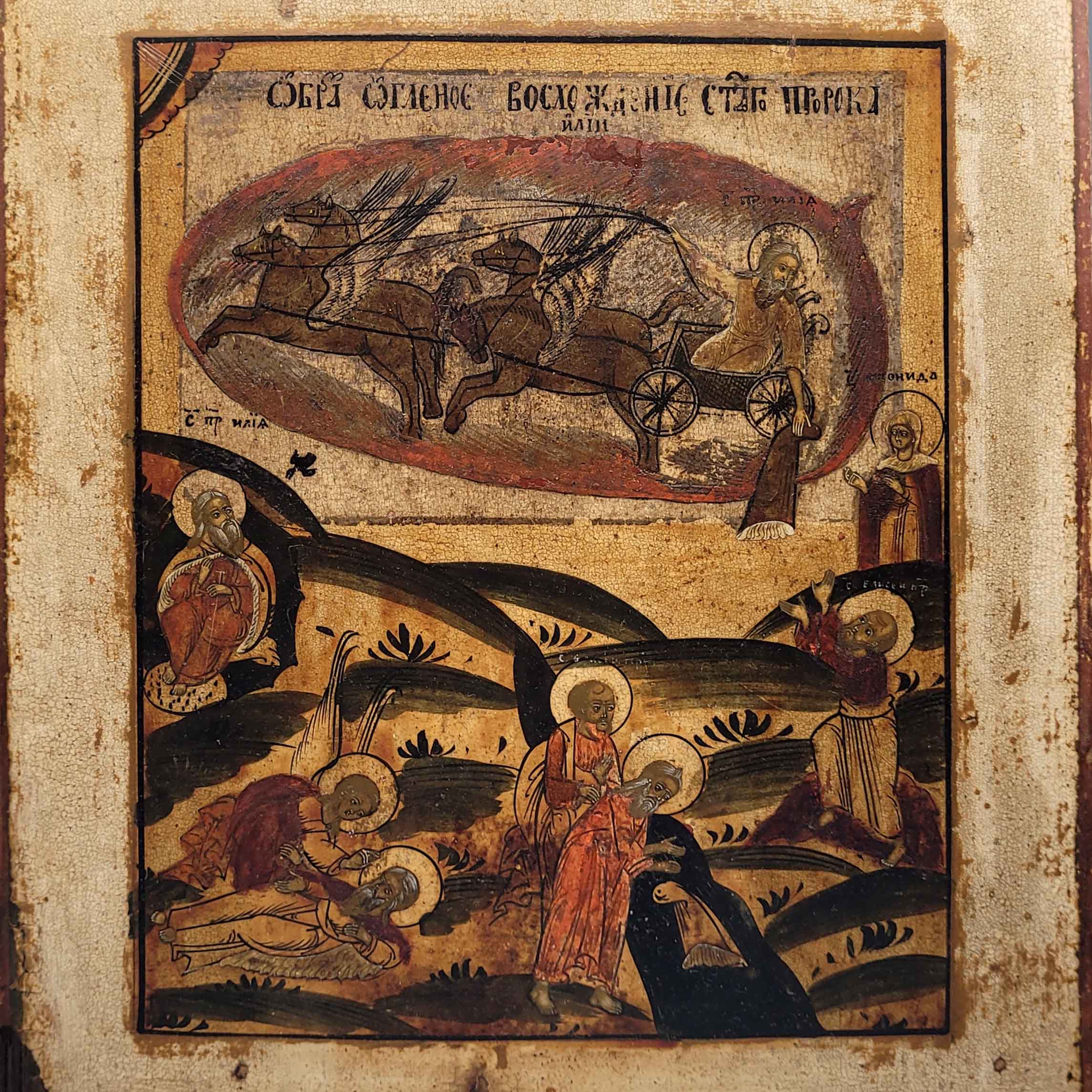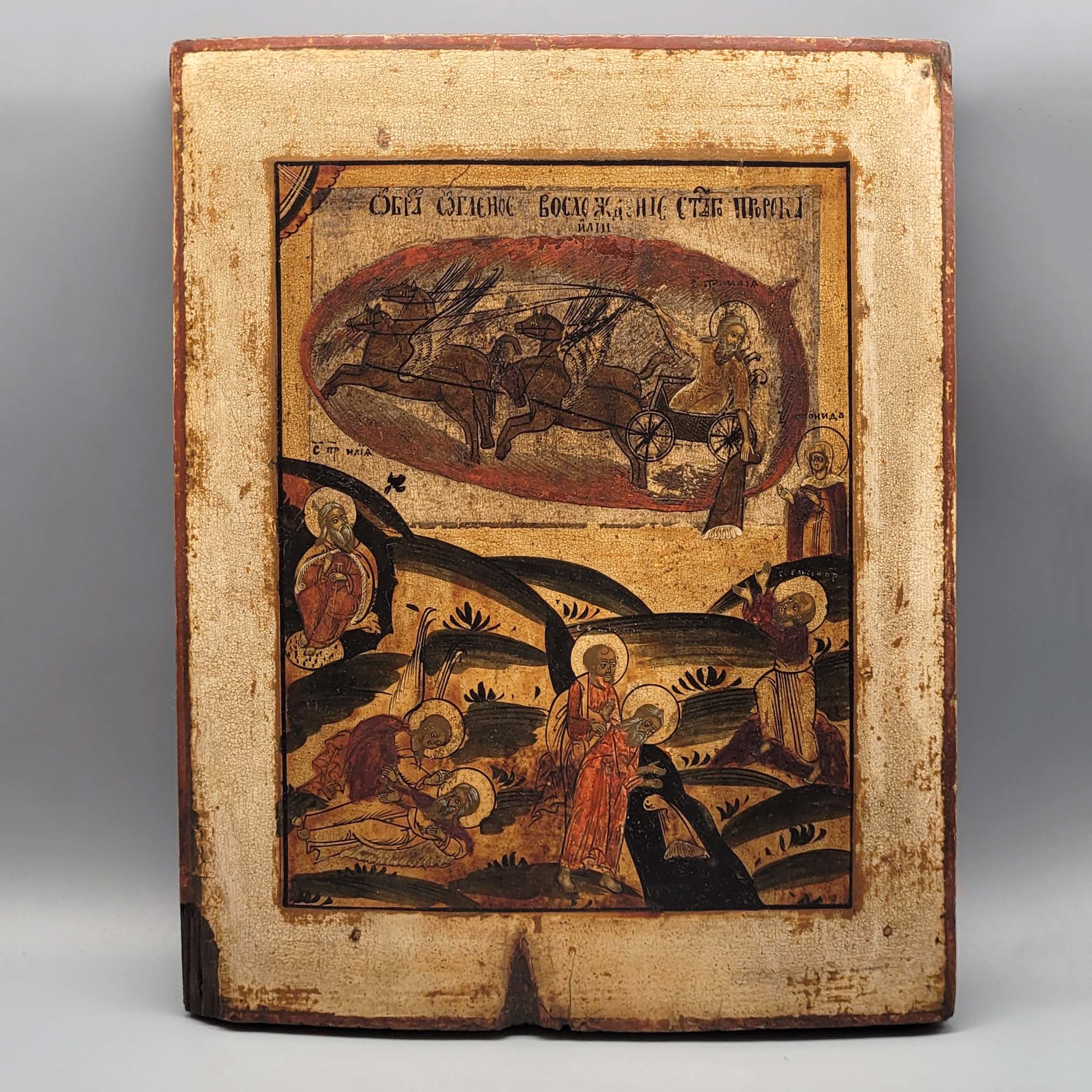 Ikone „Himmelfahrt des Elias“Tempera auf Holz, Russland Ende 18. Jahrhundert, 37,5 x 30,5 cm