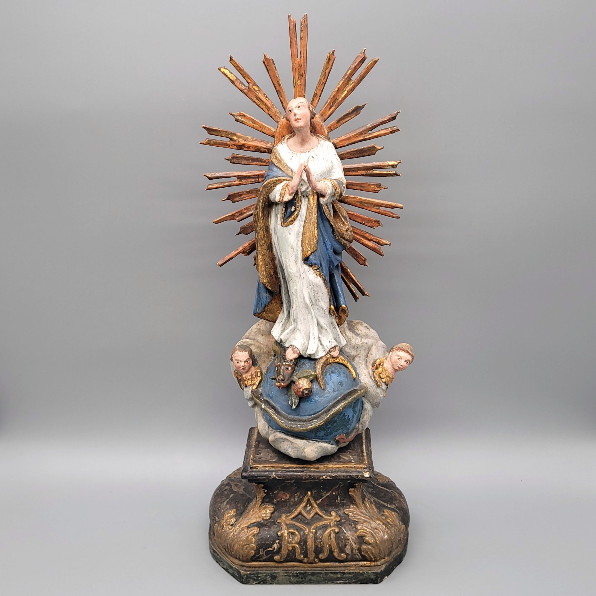 Maria Immaculata im StrahlenkranzHolz, vollrund geschnitzt, wohl zum Teil originale Fassung und Vergoldung, zugehöriger Sockel mit „Marien Monogramm“, Bayern 18. Jahrhundert, Gesamthöhe 43 cm
