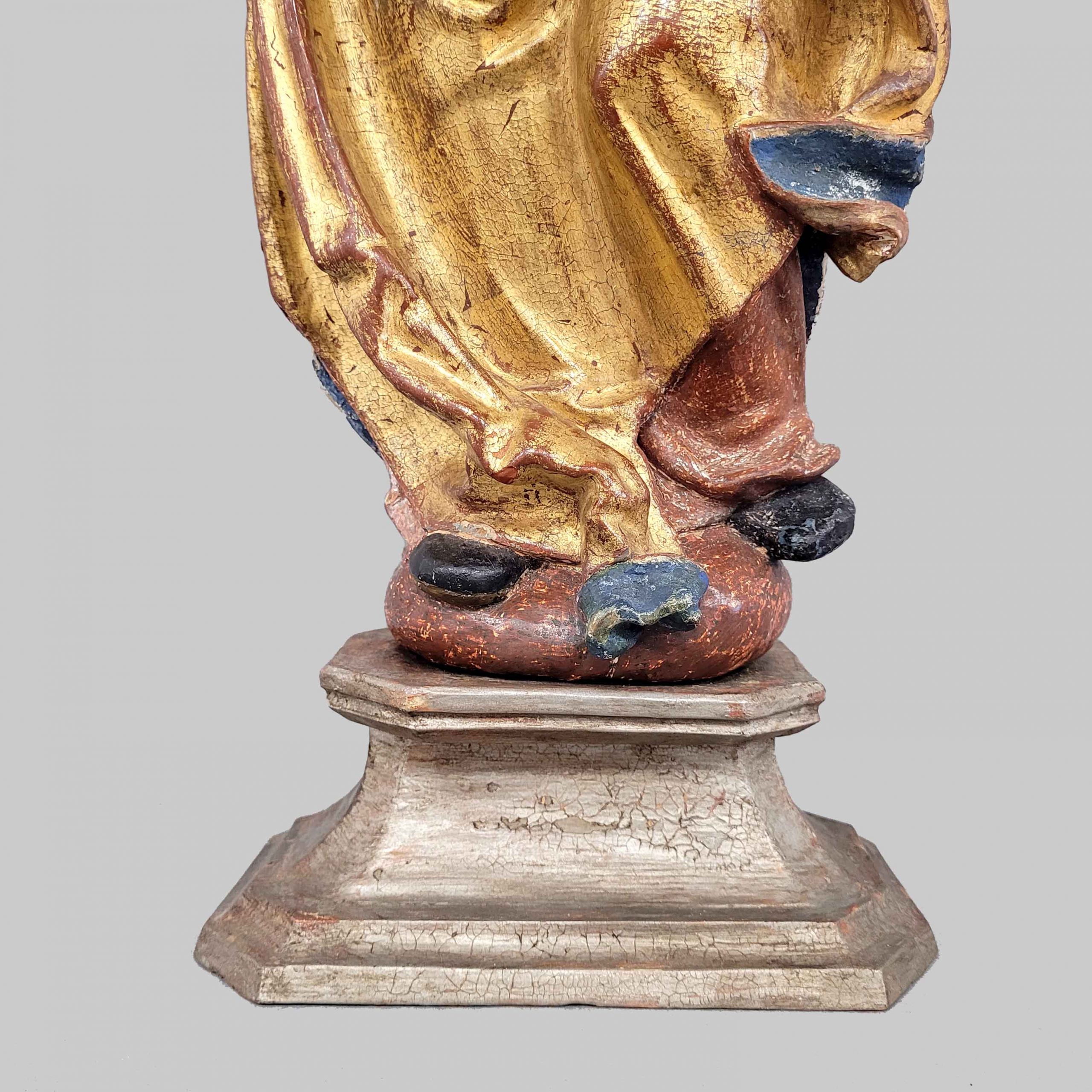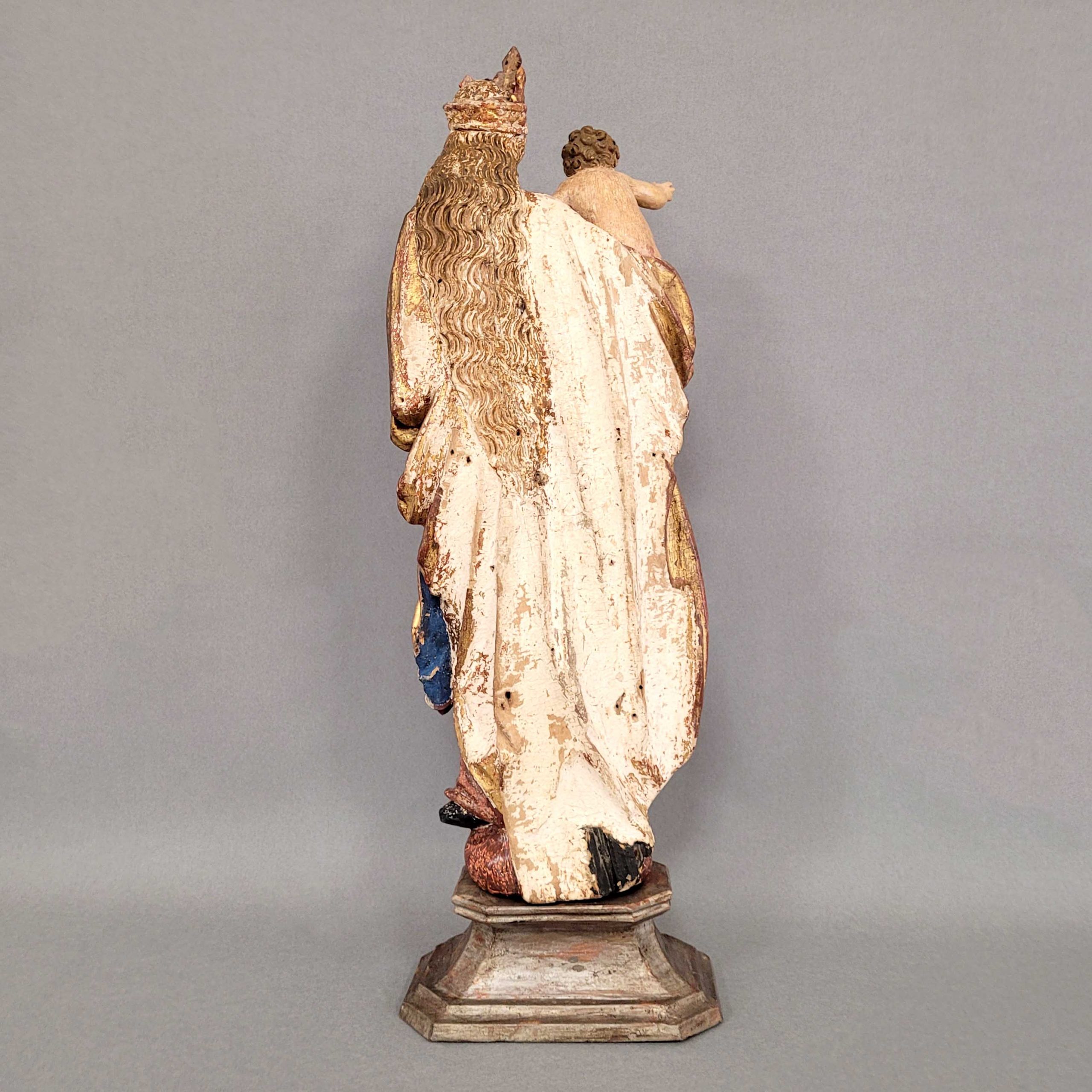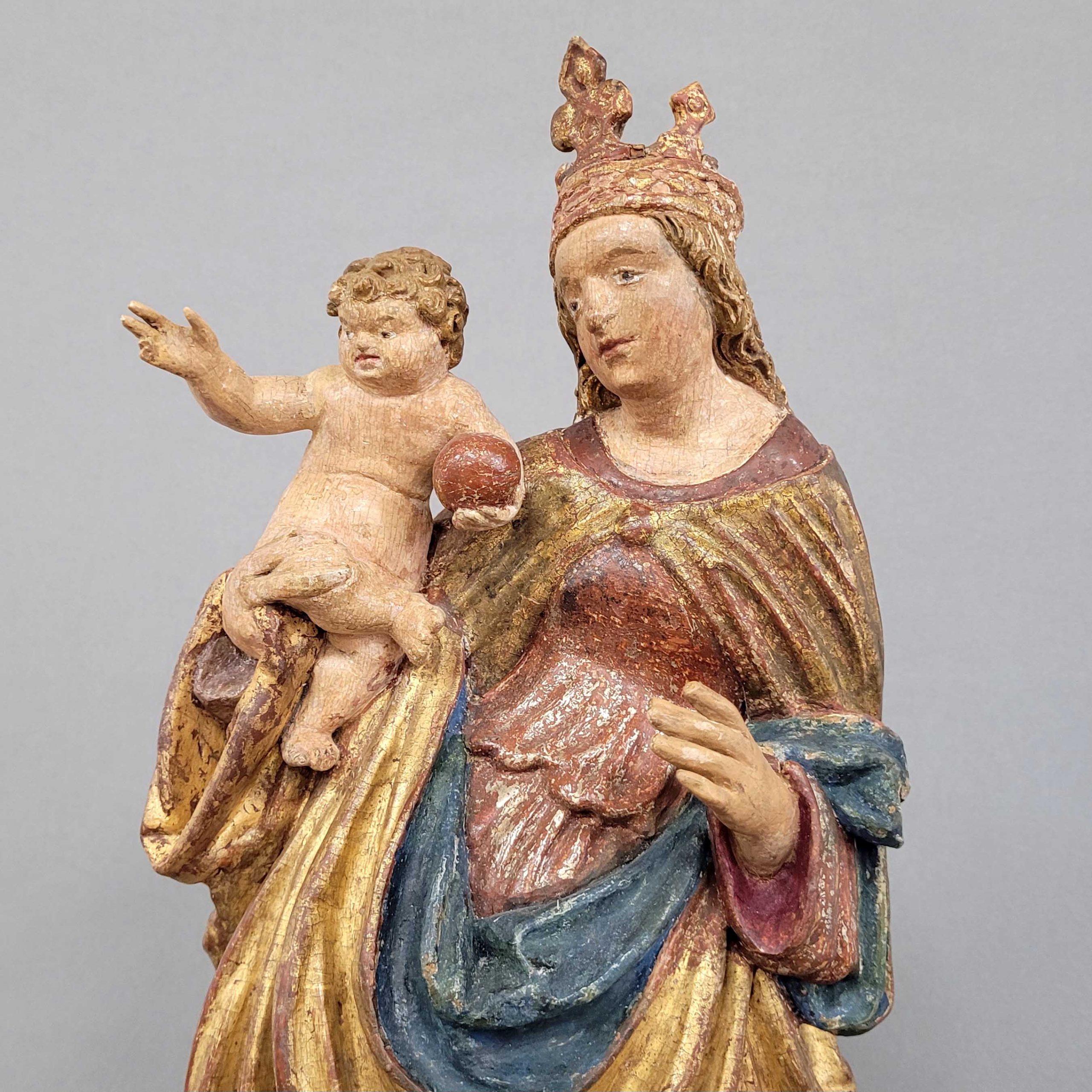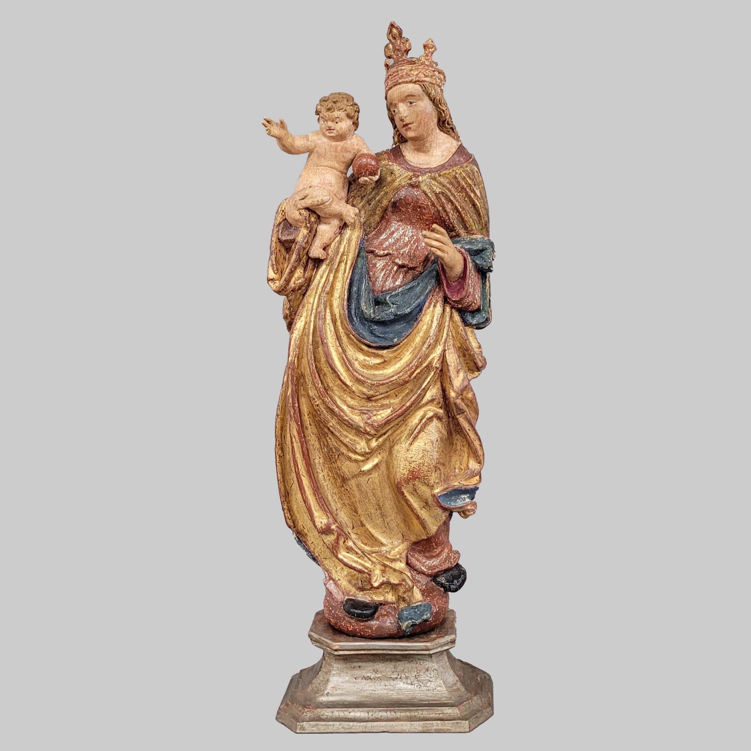 Madonna mit KindHolz, vollrund geschnitzt, alte farbige Fassung und Vergoldung, Donauschule, wohl Niederbayern, um 1520/1530, Höhe ohne den alten Sockel 56 cm