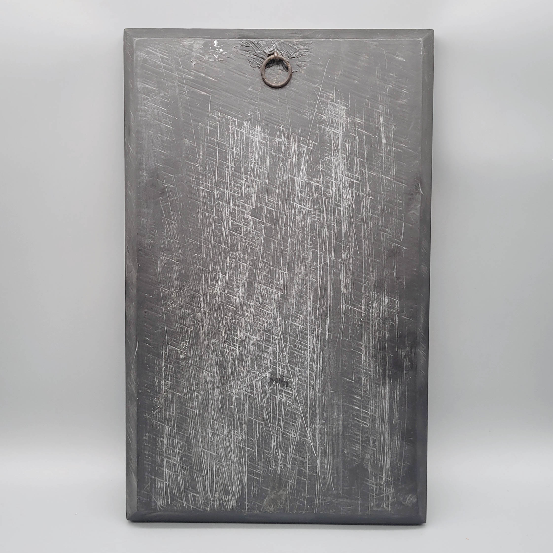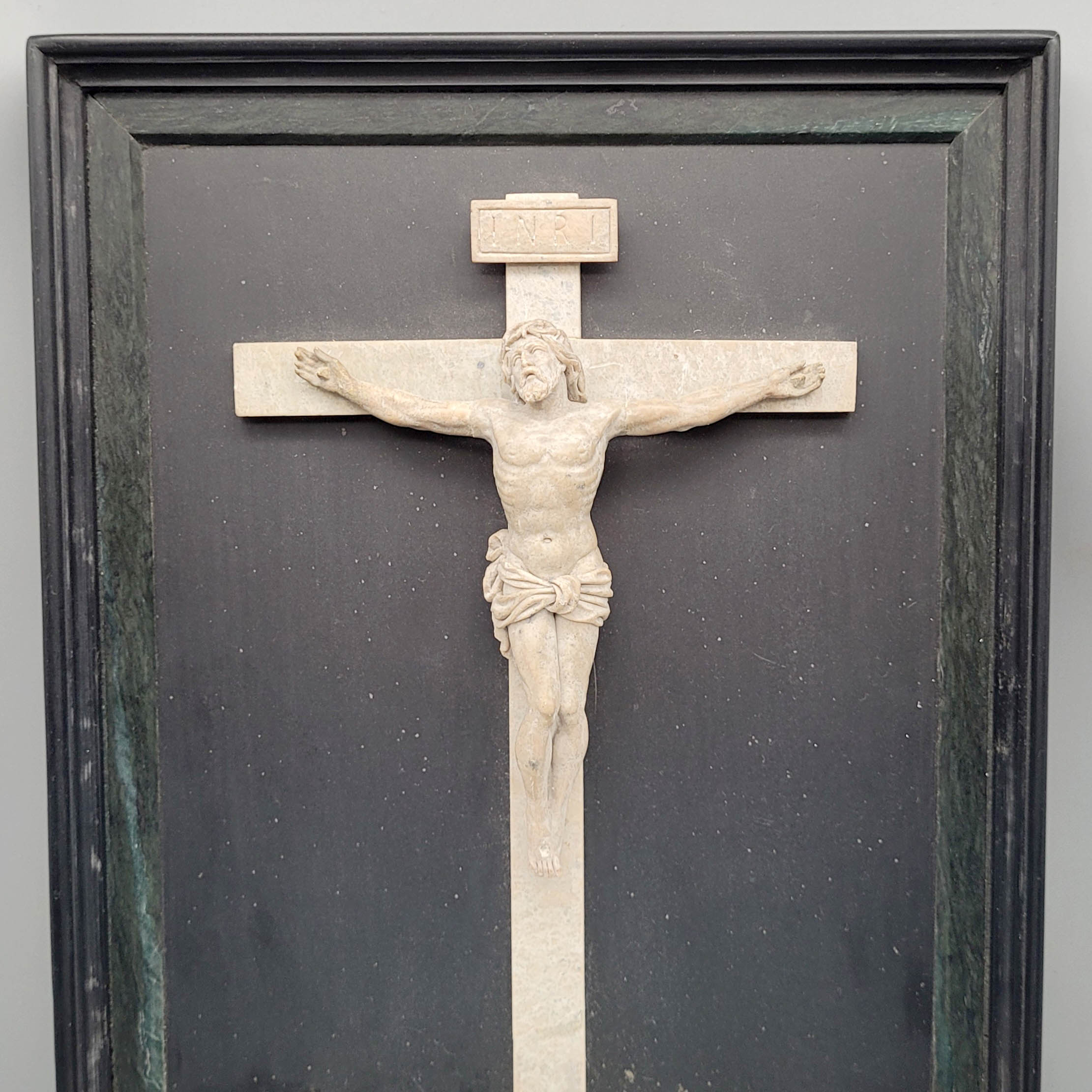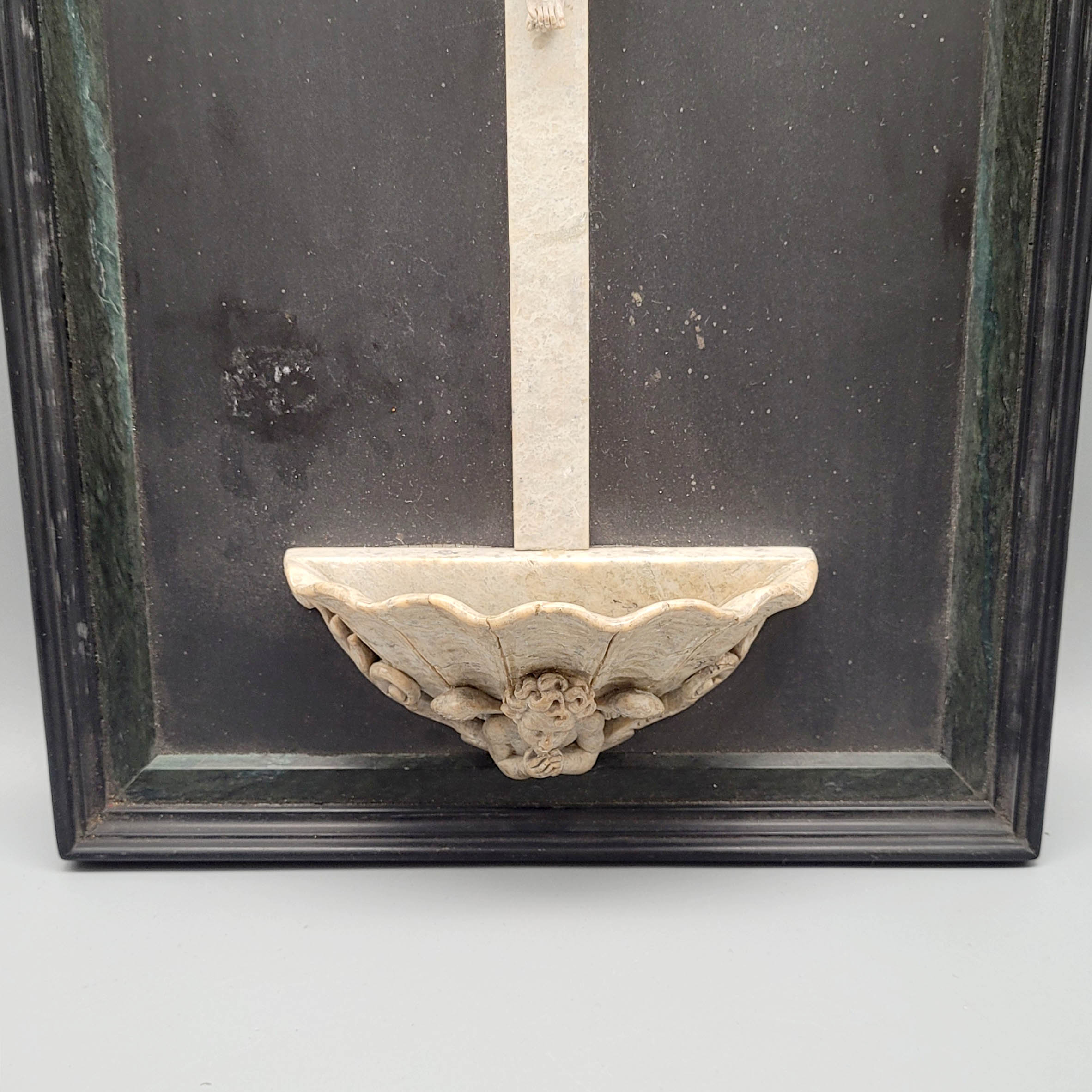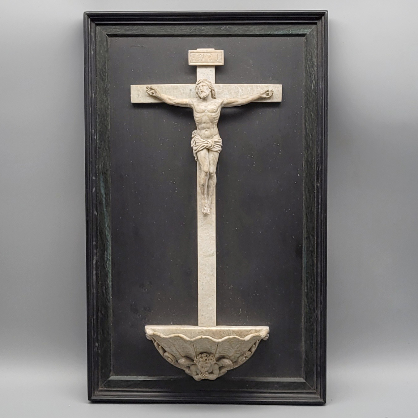 Weihbrunnen mit Kreuzigung ChristiKalkstein, geschnitten, Brunnen mit betender, geflügelter Puttobüste, montiert auf Steinrahmen, Süddeutsch 17. Jahrhundert, Höhe 34 cm, Rahmen 40 x 24,5 cm (restauriert)