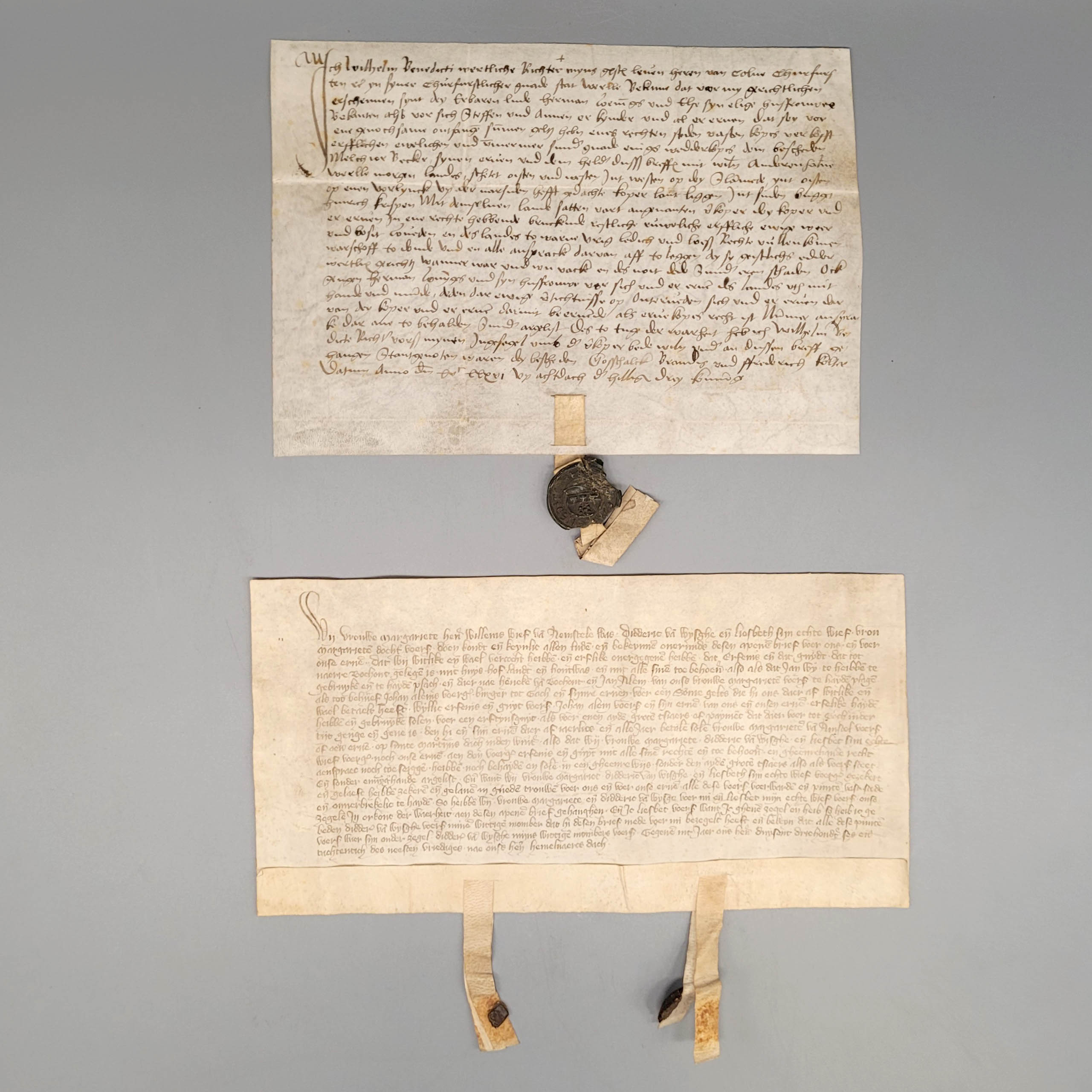 braune Tinte auf Pergament, datiert 1386, erwähnt werden ein „Didderic van Wisghe“, dem ein Haus „…naerre Bochont (oder Bochom) gelegen…“ übertragen wird, zwei zerbrochene, anhängende Wachssiegel, 13,5 x 26,5 cm beigelegt weitere Urkunde mit Siegel