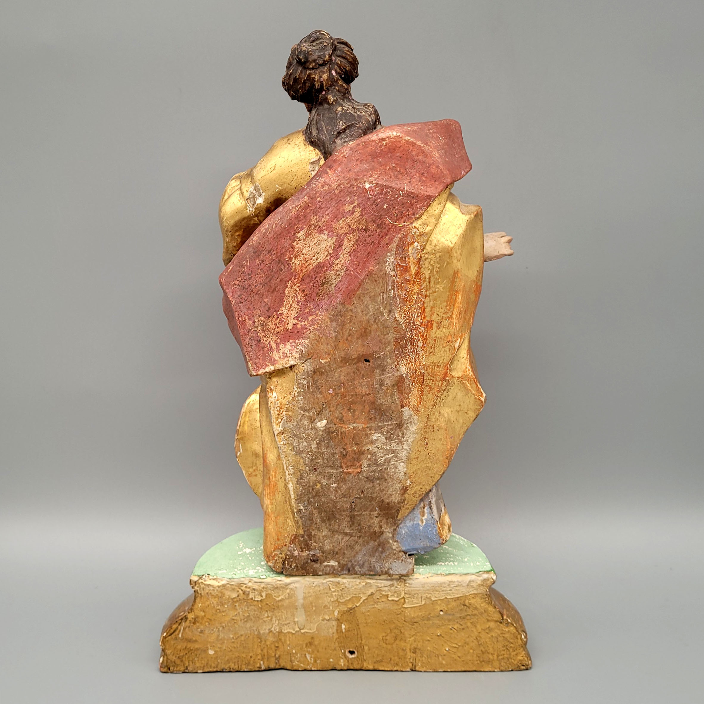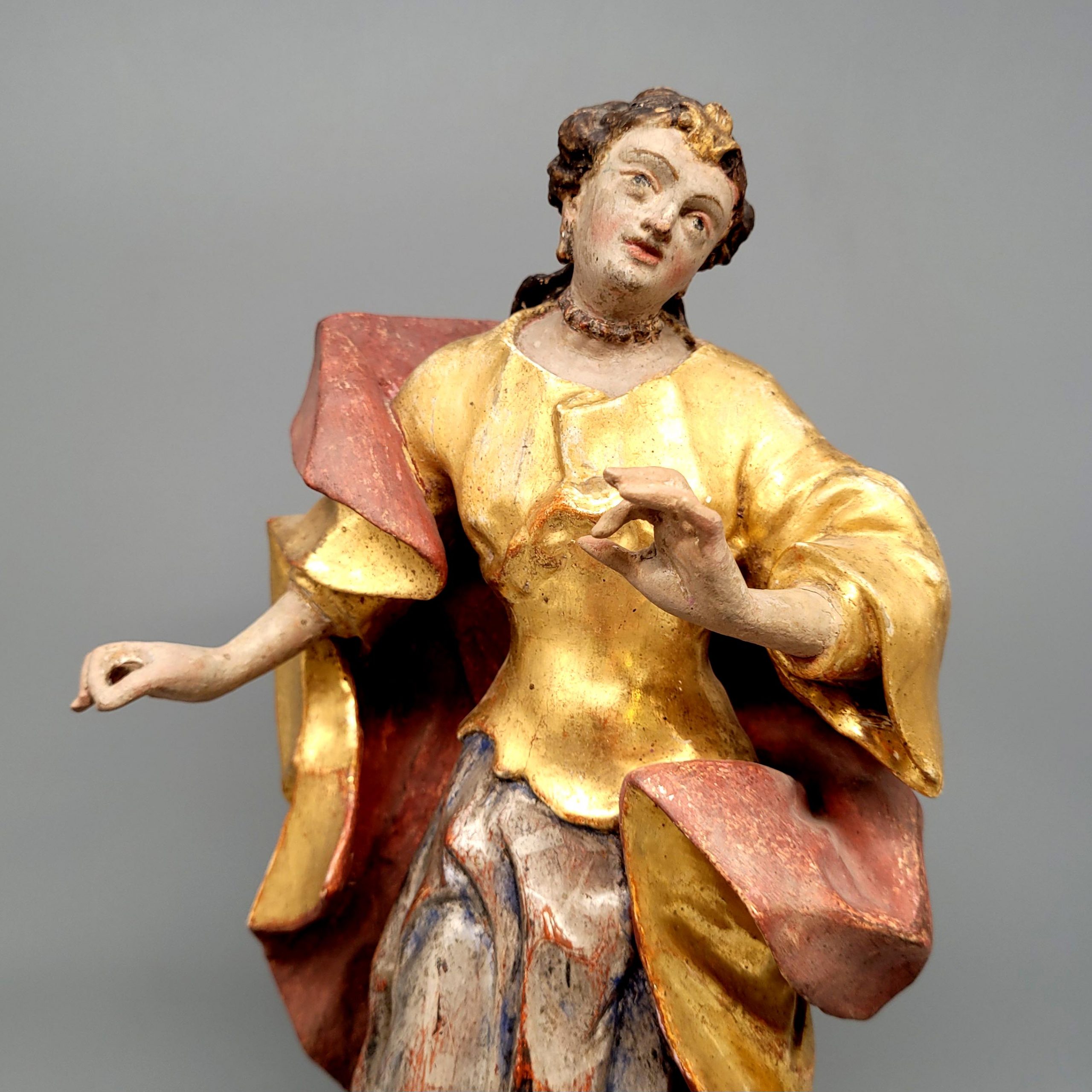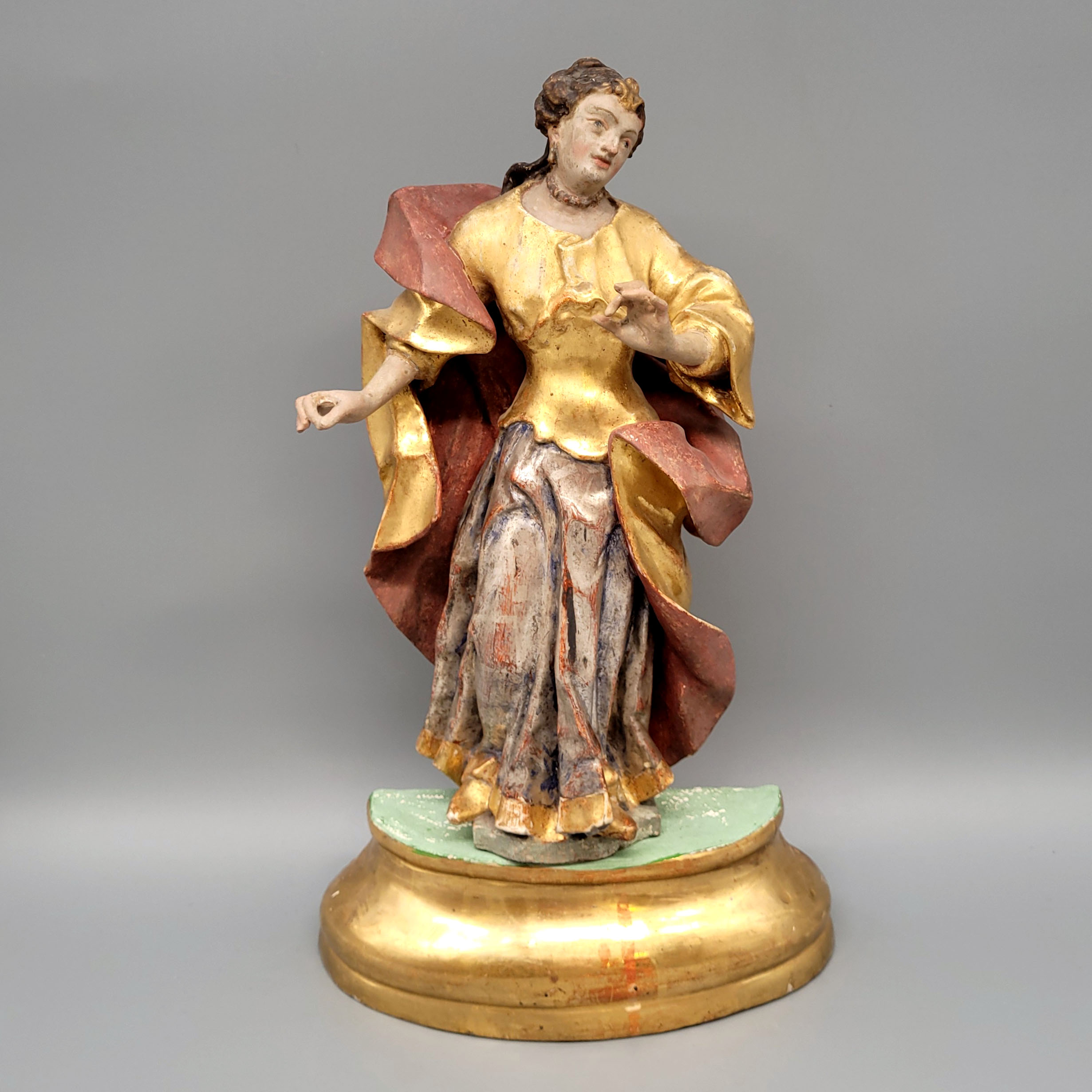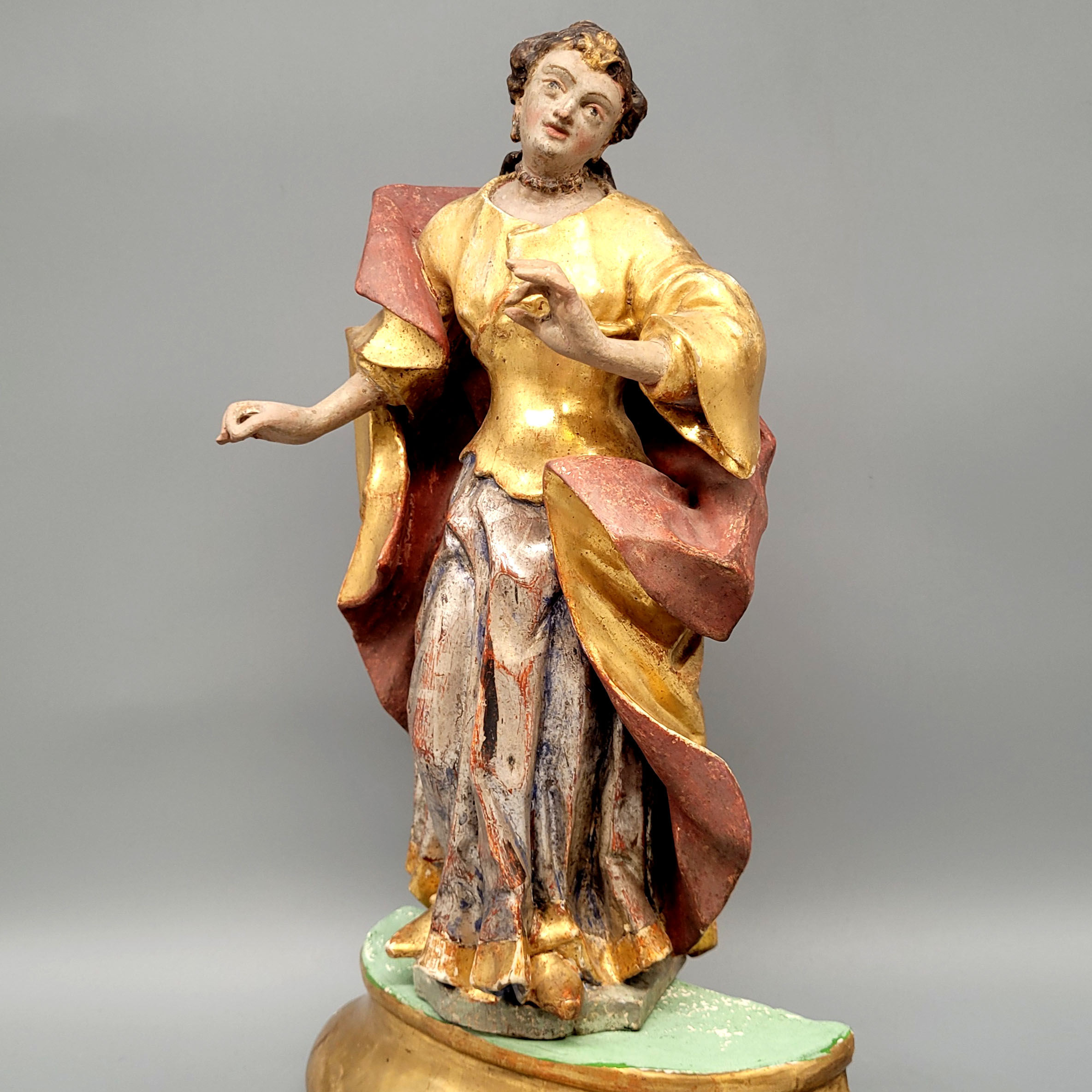 „Heiliges Fräulein“Holz, vollrund geschnitzt, originale Fassung, Vergoldung, Versilberung, Bayern 18. Jahrhundert, Höhe ohne den alten Sockel 28 cm