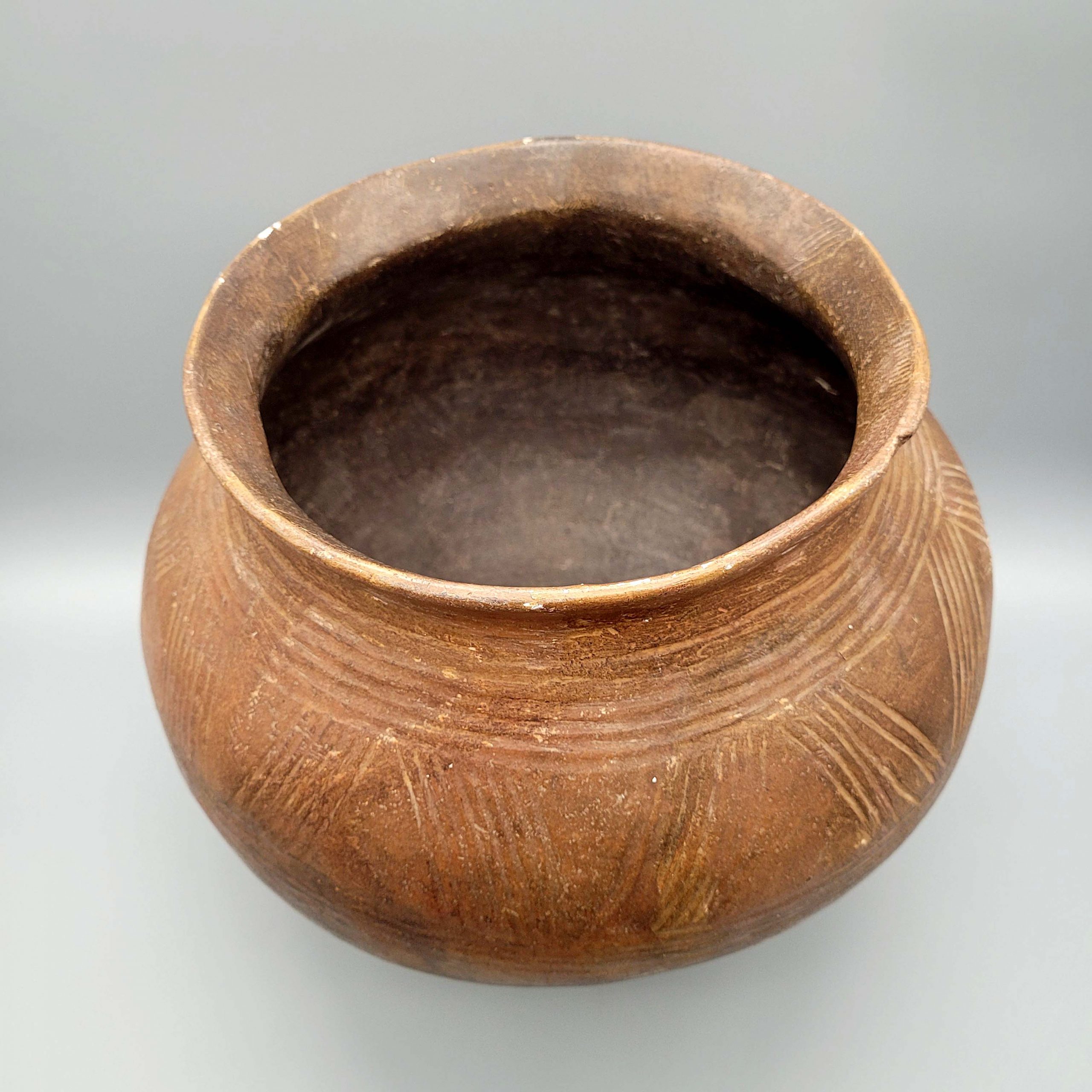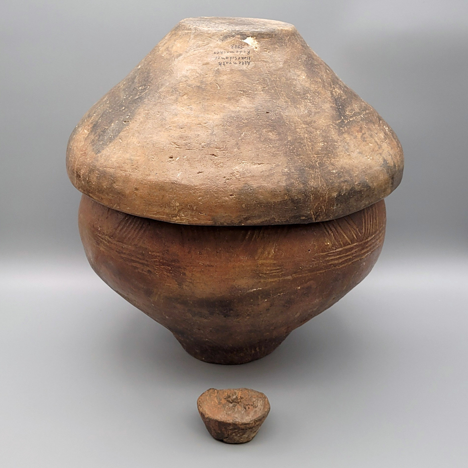 Ton, Urne mit Ritzdekor, Schale und Urne sowie Beigefäß restauriert (mit Ergänzungen) aus dem Gräberfeld „Hohe Schanze“, Altenrath in der Wahner Heide, ausgegraben im Jahre 1922 durch Erich Rademacher, dem Sohn und Mitarbeiter des bekannten Kölner Altertumsforschers Carl Rademacher (1859-1935), Urnenfelderkultur, Hallstatt C, 8.-7. Jahrhundert v. Chr., Höhe Urne 24 cm, mit Deckschale 31 cm (Sammlung G.T., Dormagen, seit ca. 1980)
