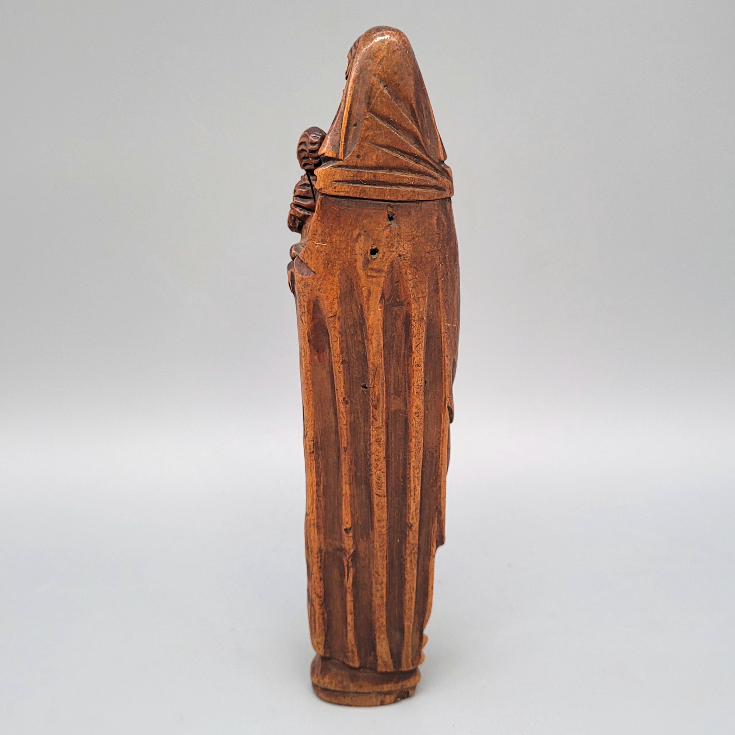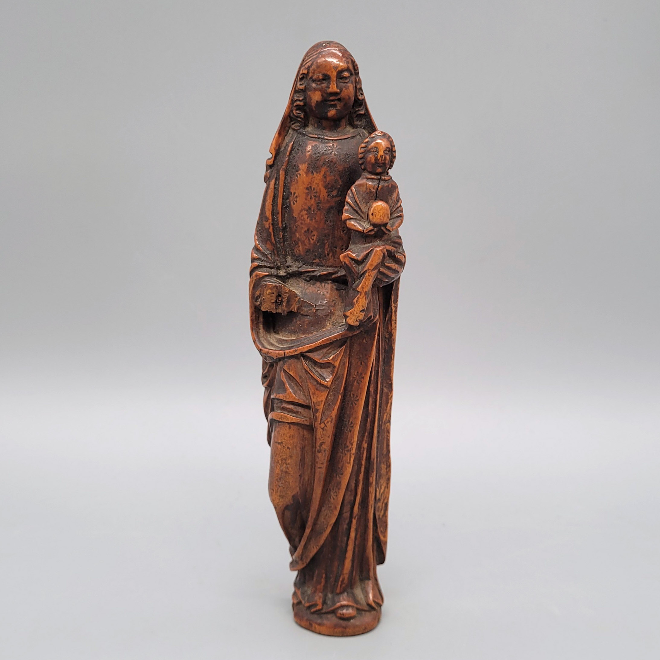 Madonna mit KindBuchsbaum, geschnitzt, graviert, rückseitig abgeflacht, bodenseitig altes Etikett von Lempertz, Flämisch 17. Jahrhundert, Höhe 18,5 cm