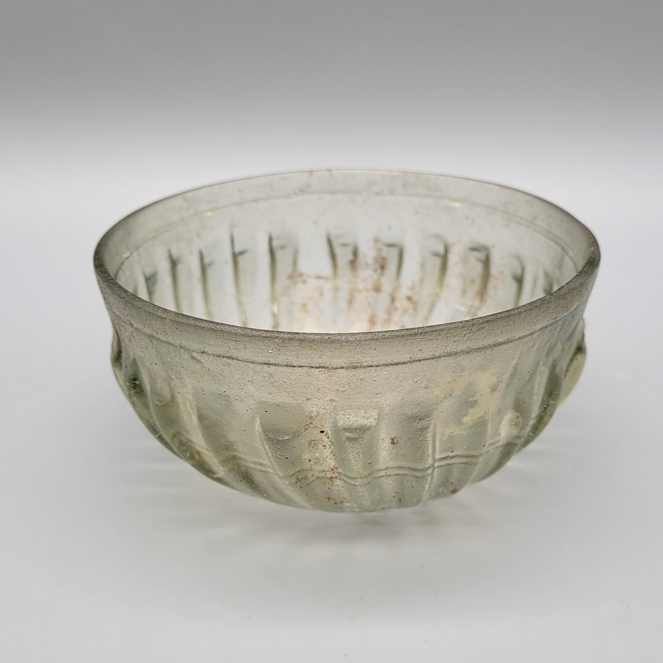 leicht grünliches Glas, innen doppelreihige Schlifflinie und unterhalb der Lippe einfache Schlifflinie, wohl Römisch 1.-2. Jahrhundert n. Chr., Höhe 5 cm, Durchmesser 11 cm (Prov.: Sammlung F.K., Bergisch-Gladbach [1926-2024], erworben Kunsthandlung Aloys Faust, Köln 1974)