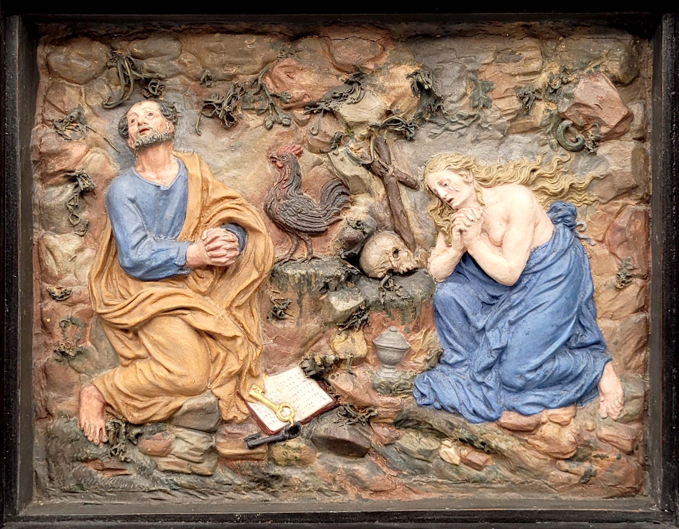 Reuiger Petrus und reuige Maria MagdalenaTerrakotta, alt farbig gefasst, Oberitalien 18. Jahrhundert, 20 x 25 cm, Rahmen