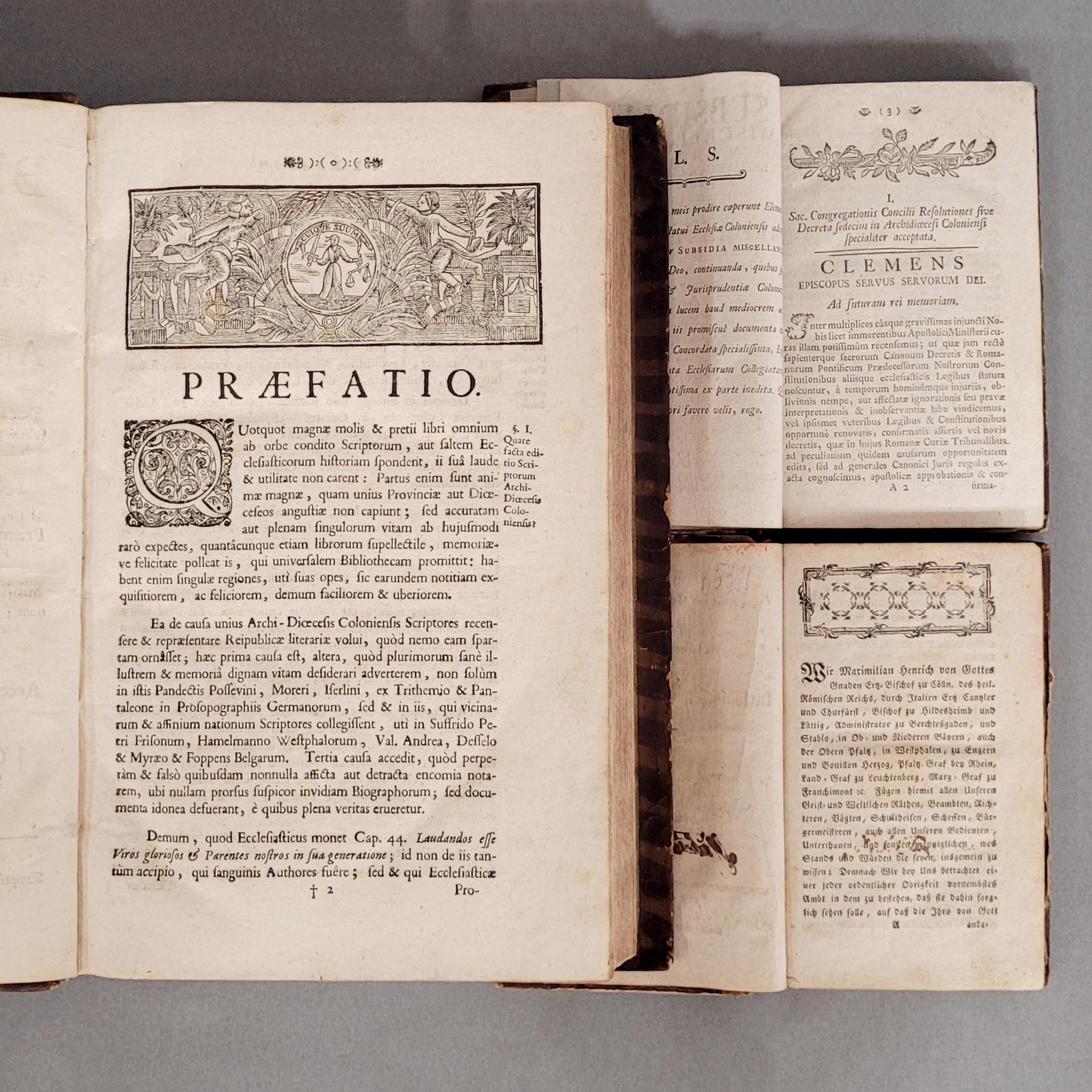Köln (Thomas Odendall) 1747 (Ledereinband der Zeit) ANONYMUS, Sammlung einiger ältern und jüngern Verordnungen zur Erläuterung des kurkölnischen Privatrechts, Bonn [1791] (Halbledereinband der Zeit) Subsidia miscellanea historiam et jurisprudentiam ecclesiasticam Coloniensem, Bonn (Abshoven, Rommerskirchen Erben) o. Jahr, beigebunden Tractatus de triplicis vicarii generalis in pontificalibus…Maximiliani Henrici archiepiscopi et electoris Coloniensis, Köln (Johannes Arnold) 1781 (Halbledereinband der Zeit)