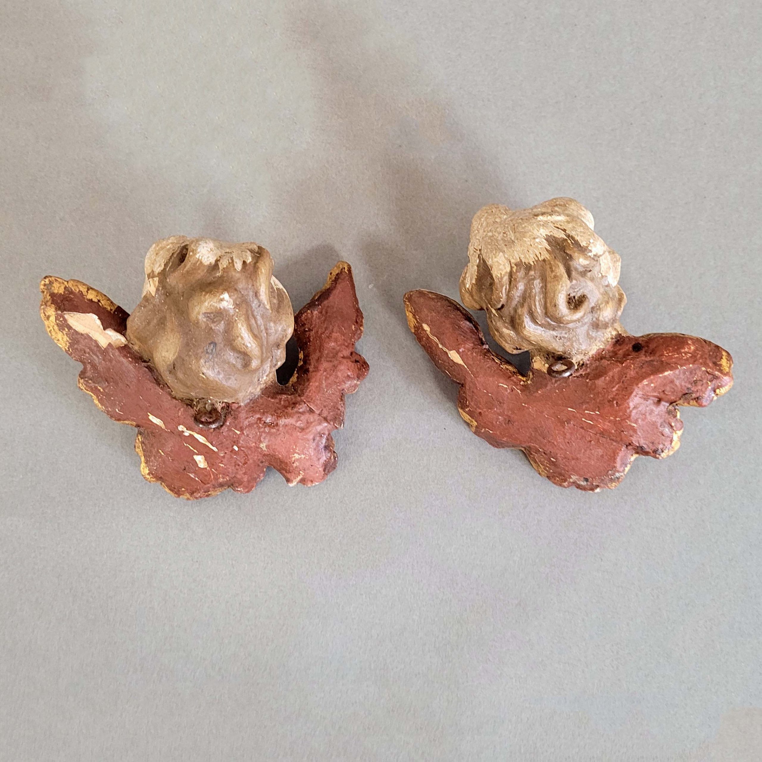 Paar geflügelte PuttenköpfeHolz, vollrund geschnitzt, farbig gefasst und versilbert, Süddeutsch 18. Jahrhundert, ca. 11 x 11 cm