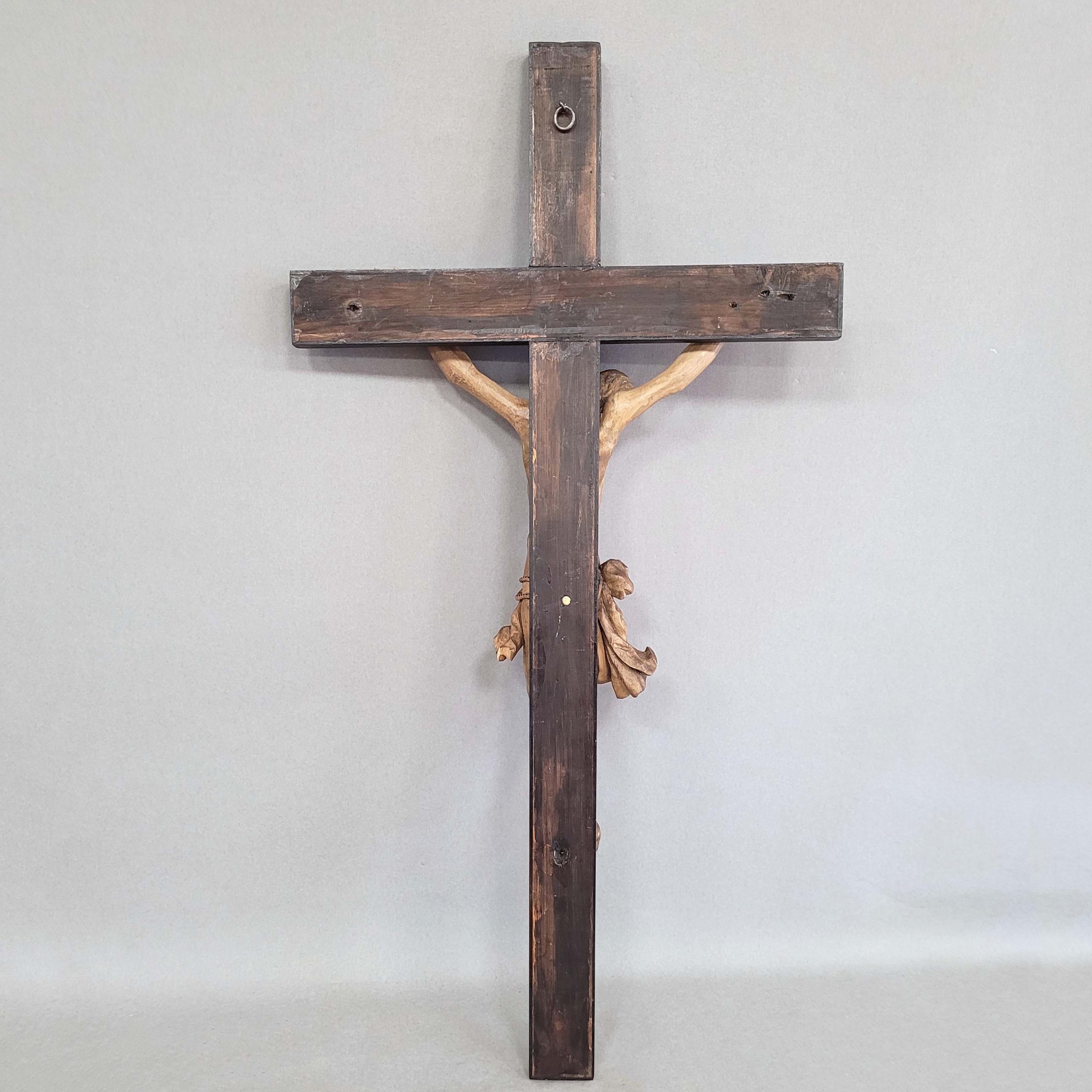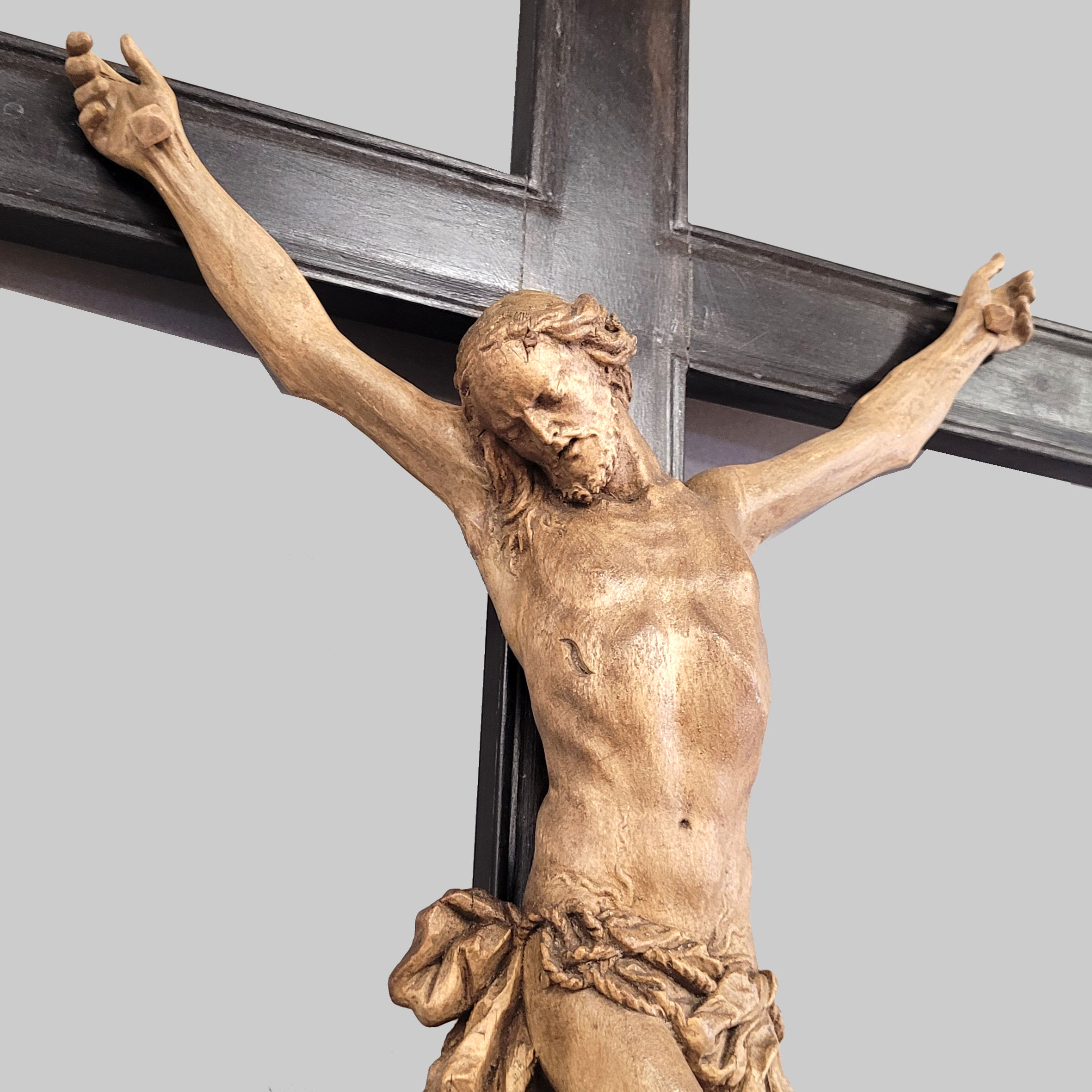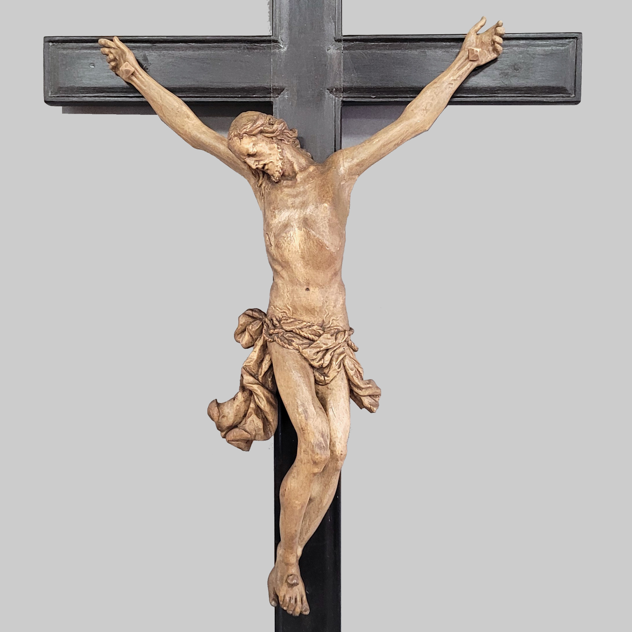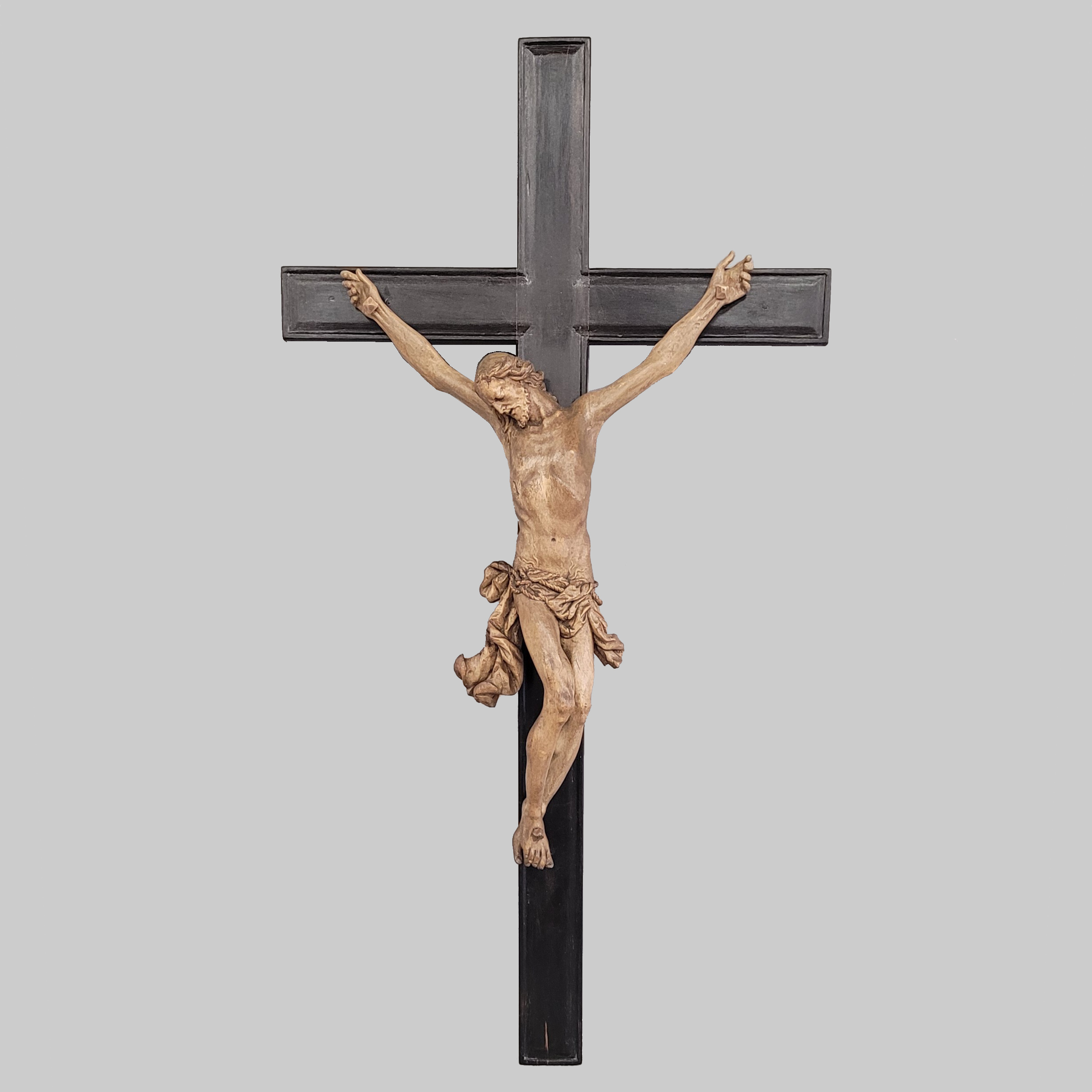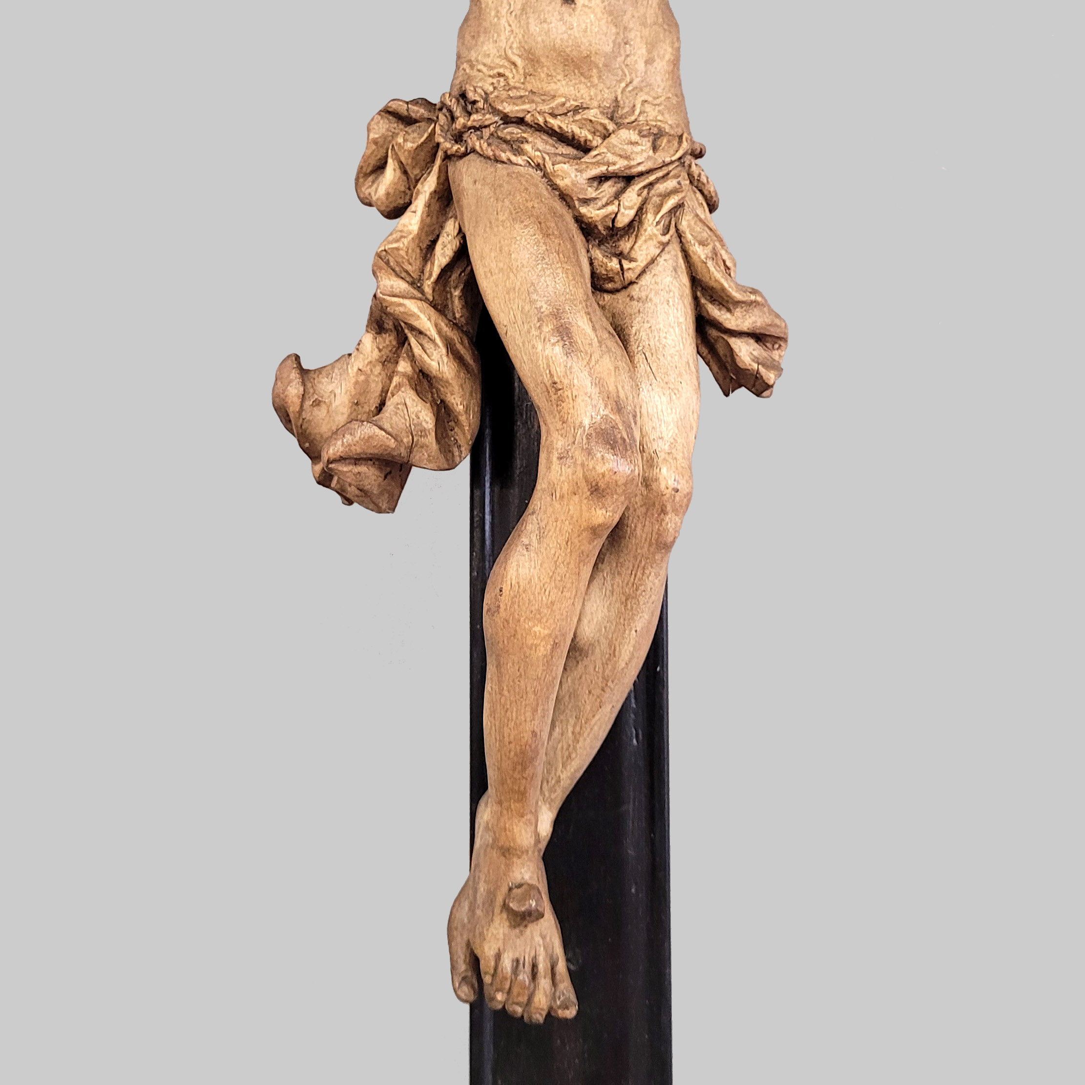 Holz (Linde), vollrund geschnitzt, Kreuz schwarz gefärbtes Holz, Österreich 18. Jahrhundert, Höhe Corpus Christi ca. 40 cm, Höhe Kreuz 70 cm