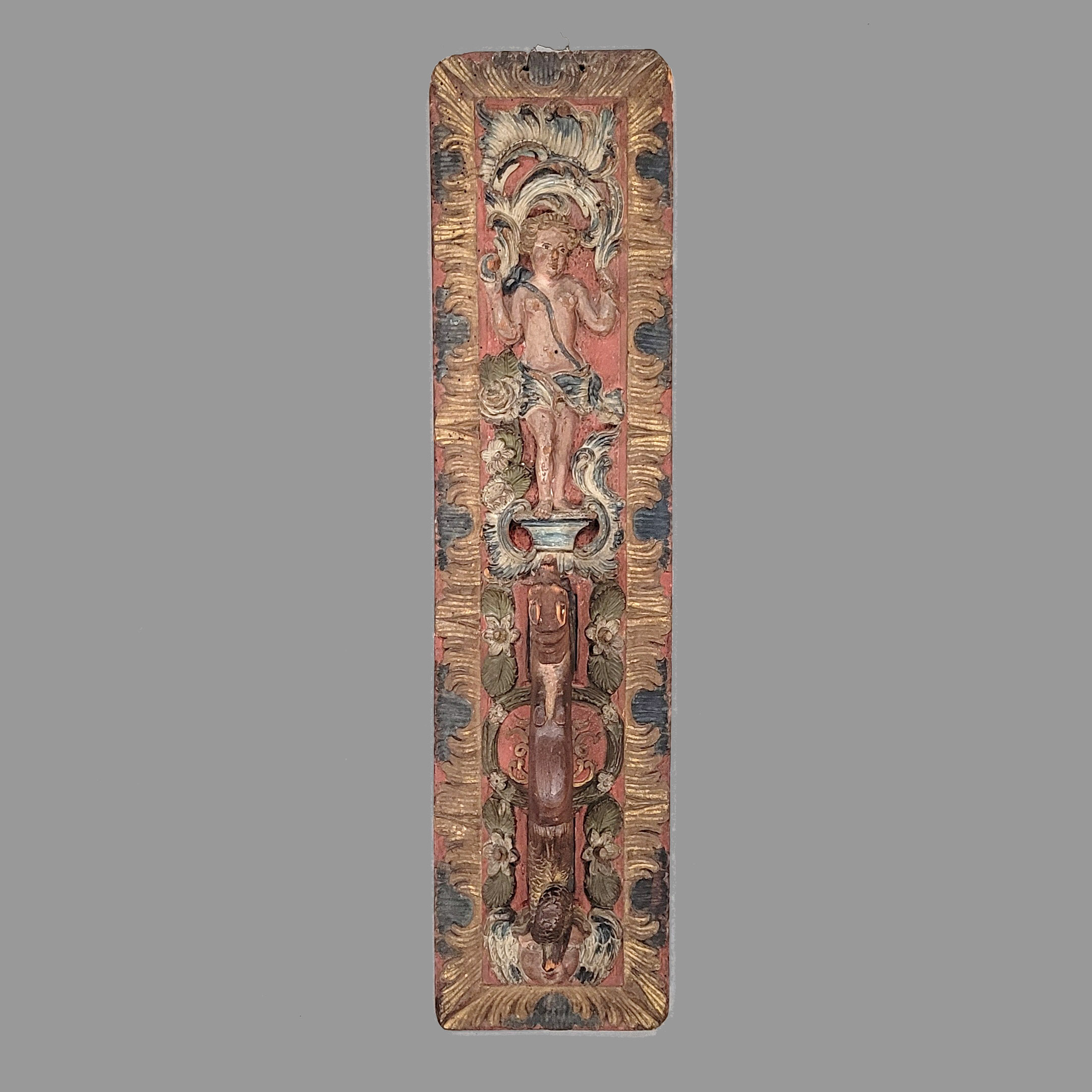 Zierbrett mit GriffRelief, Holz, geschnitzt, alt farbig gefasst, stehender Putto und geflügelter Puttenkopf, Griff in Form eines Drachen, Deutsch 18. Jahrhundert, 67 x 16,5 cm