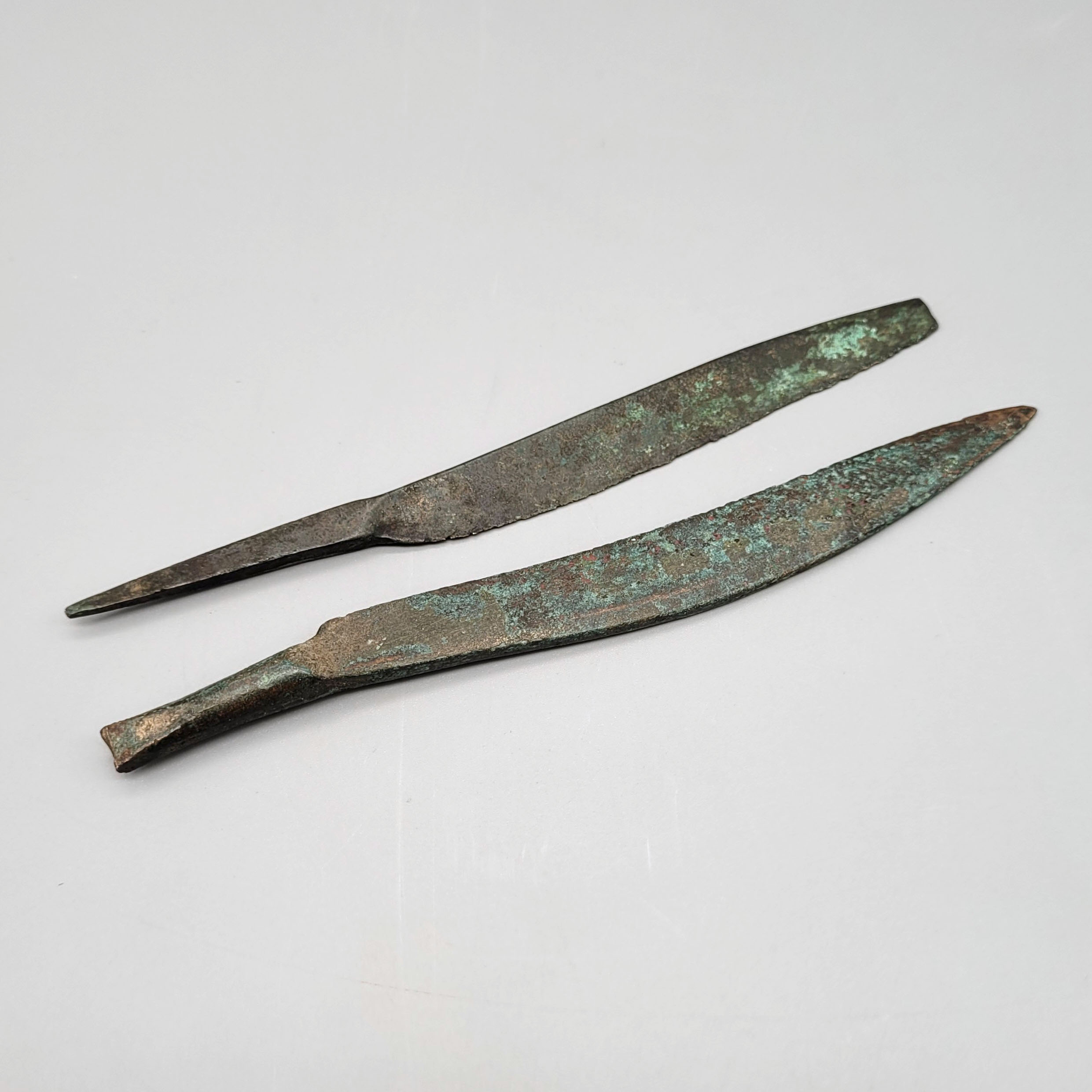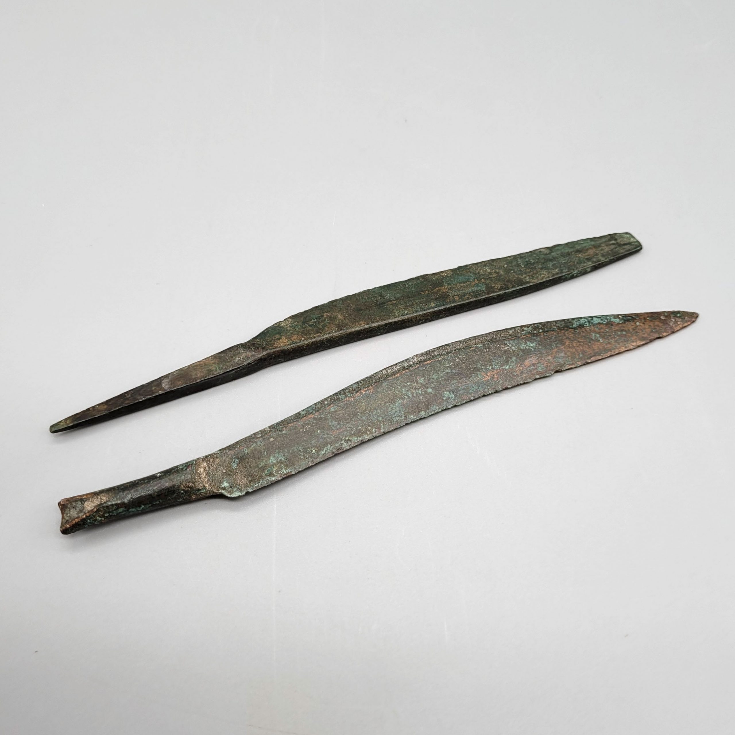 Bronze, Urnenfelderzeit, sog. Marburger Gruppe, Spätbronzezeit, ca. 1100-900 v. Chr., Länge 14,6cm bzw. 14,3 cm (eine Spitze fehlt), Fundort unbekannt (Sammlung J.-W.K., Frechen, erworben um 1970 aus einer alten Sammlung)