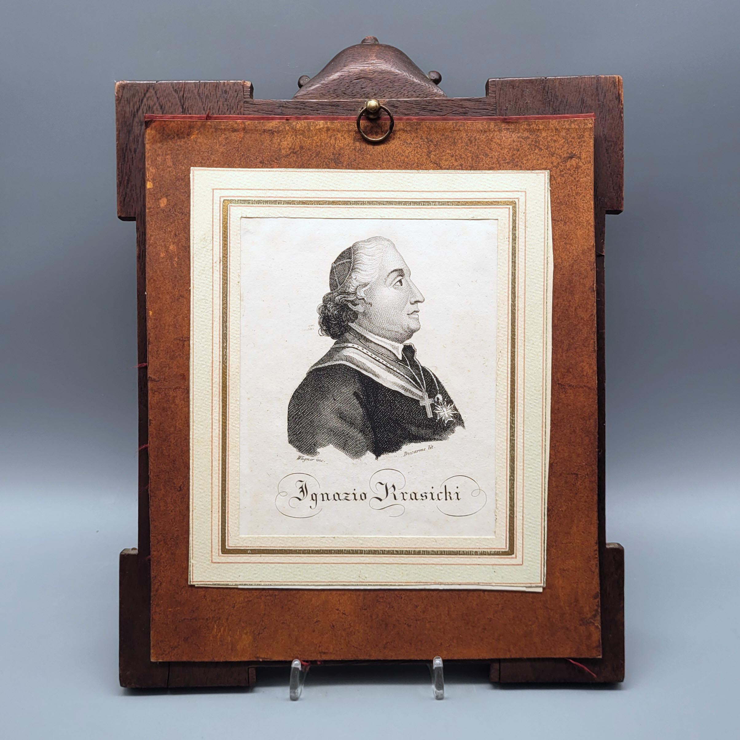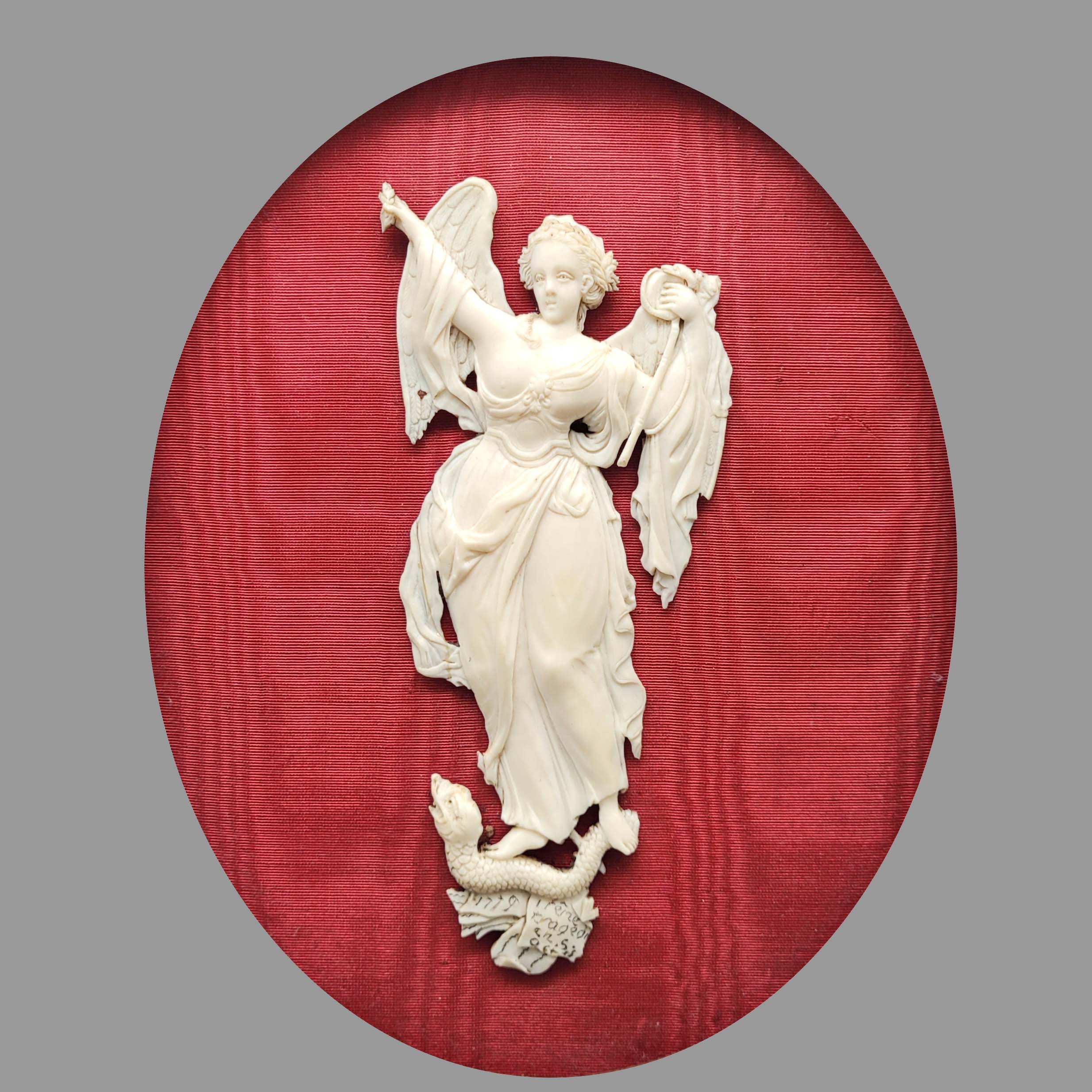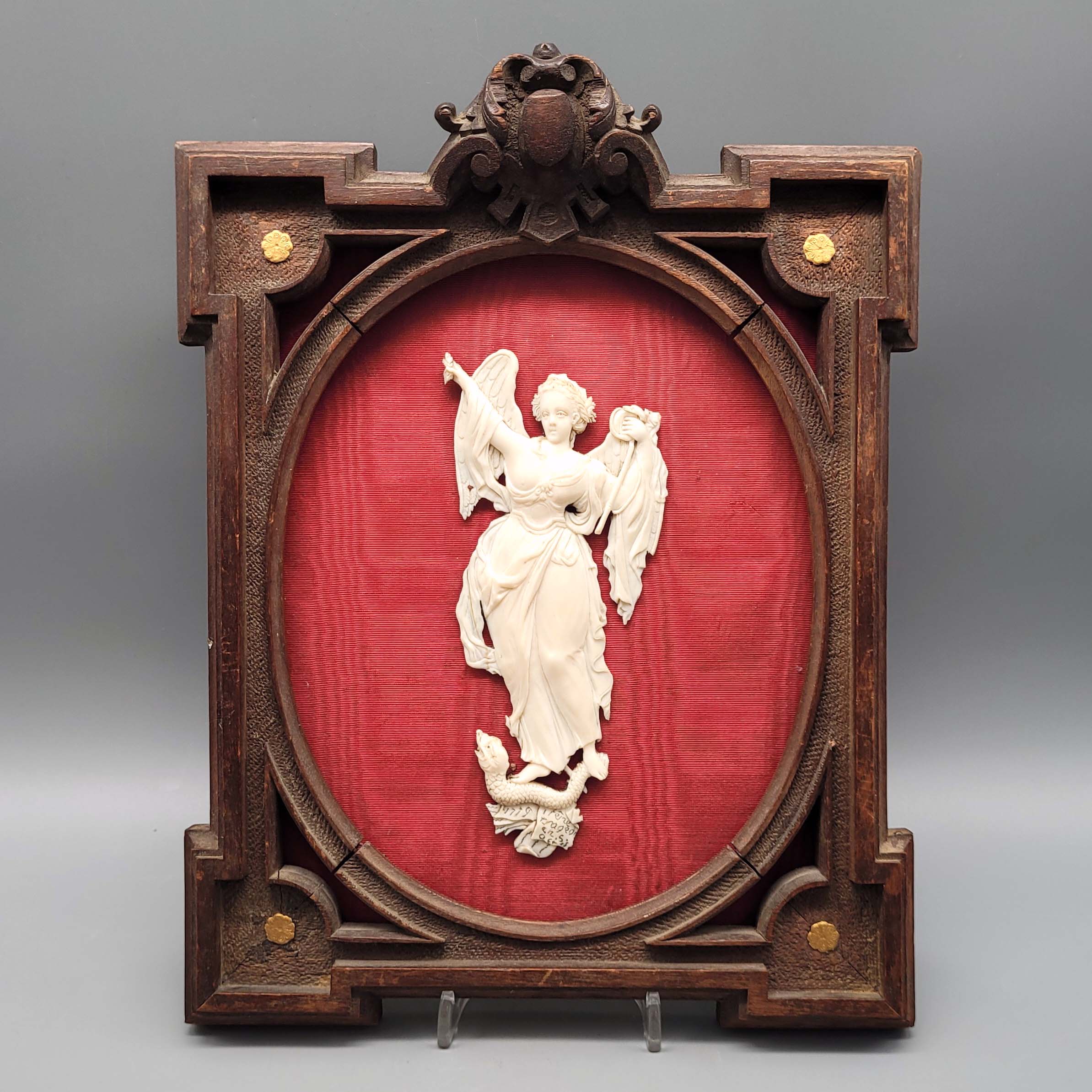 Relief, Elfenbein, datiert 1779, bezeichnet „Irene tragedi[e] an. 5 aetis“, Frankreich Ende 18. Jahrhundert, Höhe 15,5 cm (montiert auf Stoff, Rahmen verso aufgeklebte Graphik mit dem Brustporträt des polnischen Schriftstellers und Aufklärers Ignacy Krasicki (1735-1801). Das in Elfenbein gefertigte Flachrelief zeigt die Siegesgöttin Nike und steht im Zusammenhang mit der Tragödie „Irene“ von Voltaire.
