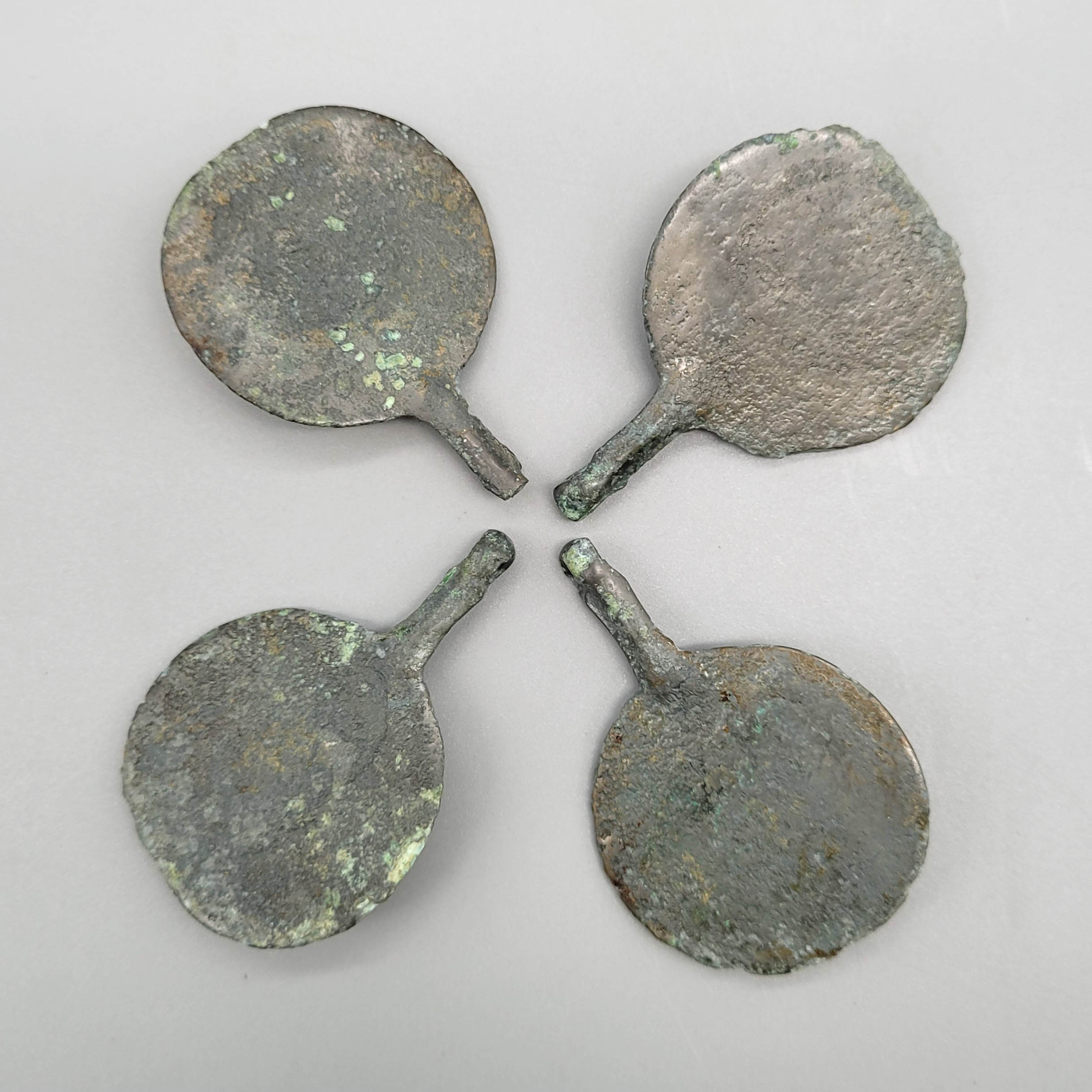 4 konzentrisch gerippte Scheiben mit Buckel im Zentrum, Mittlere Bronzezeit, um 1300 v. Chr., Fundort Schonach in Baden-Württemberg, Scheibendurchmesser 3,6 cm (Sammlung J.-W.K., Frechen, erworben um 1970 aus einer alten Sammlung)