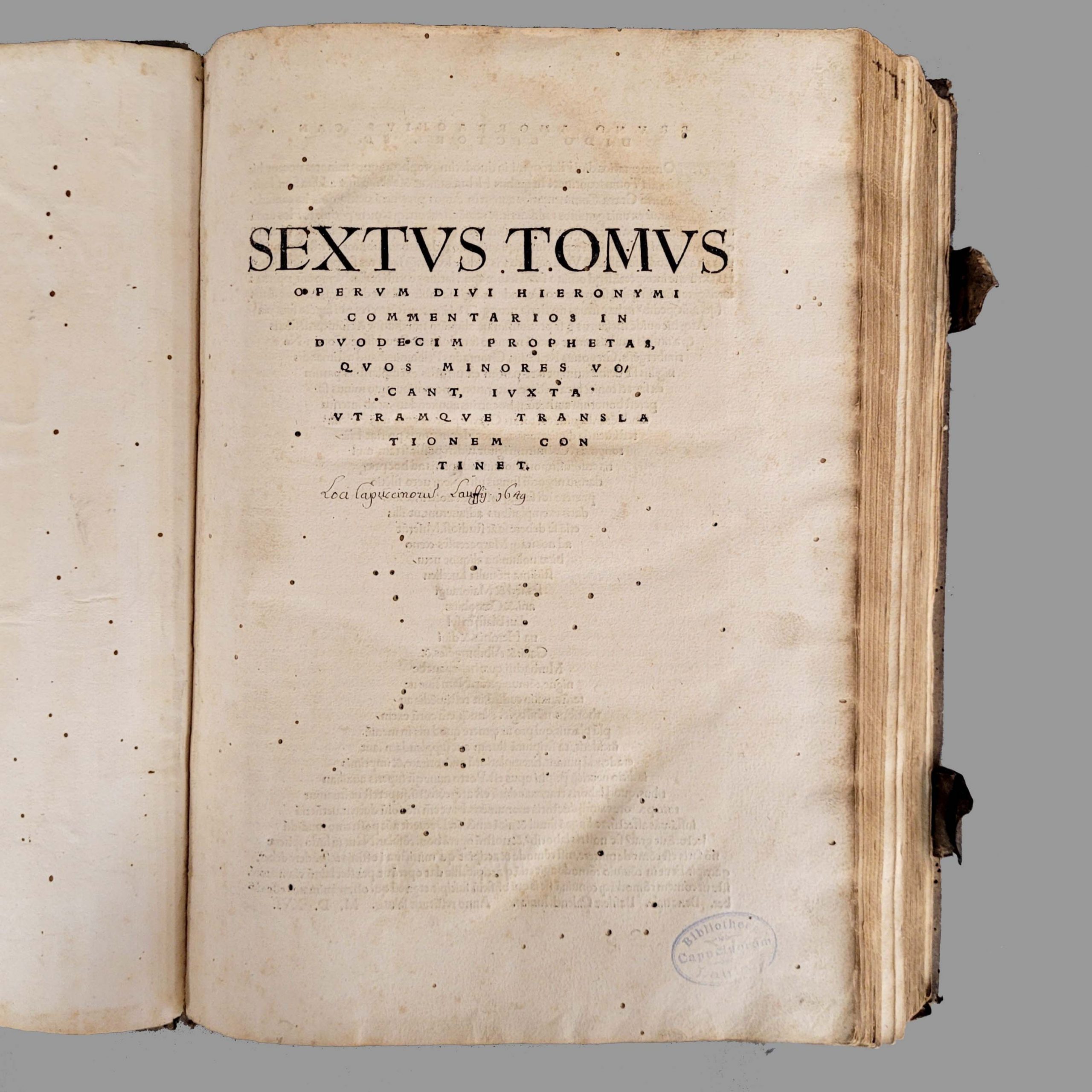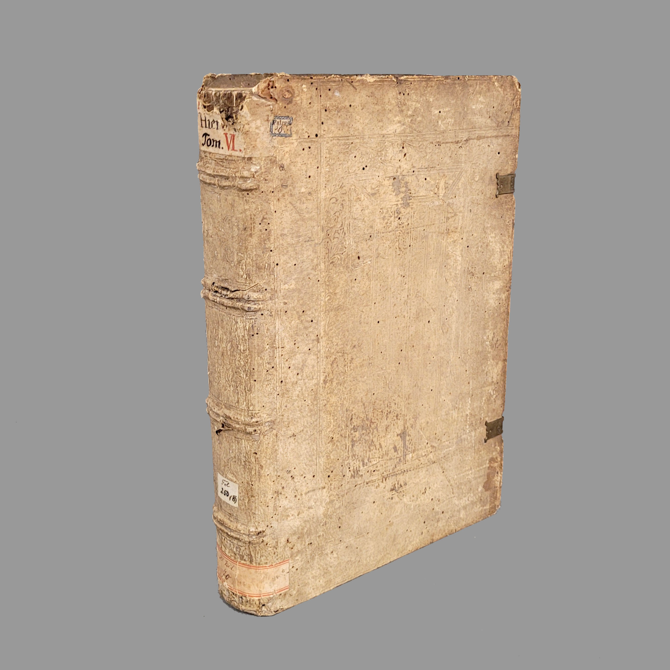 Vol. VI, Basel (Froben) 1516 (geprägter Pergamenteinband über Holzdeckeln der Zeit, Metallschließen fehlen, Wurmschäden aus der Bibliothek des Kapuziner-Klosters in Lauffen)