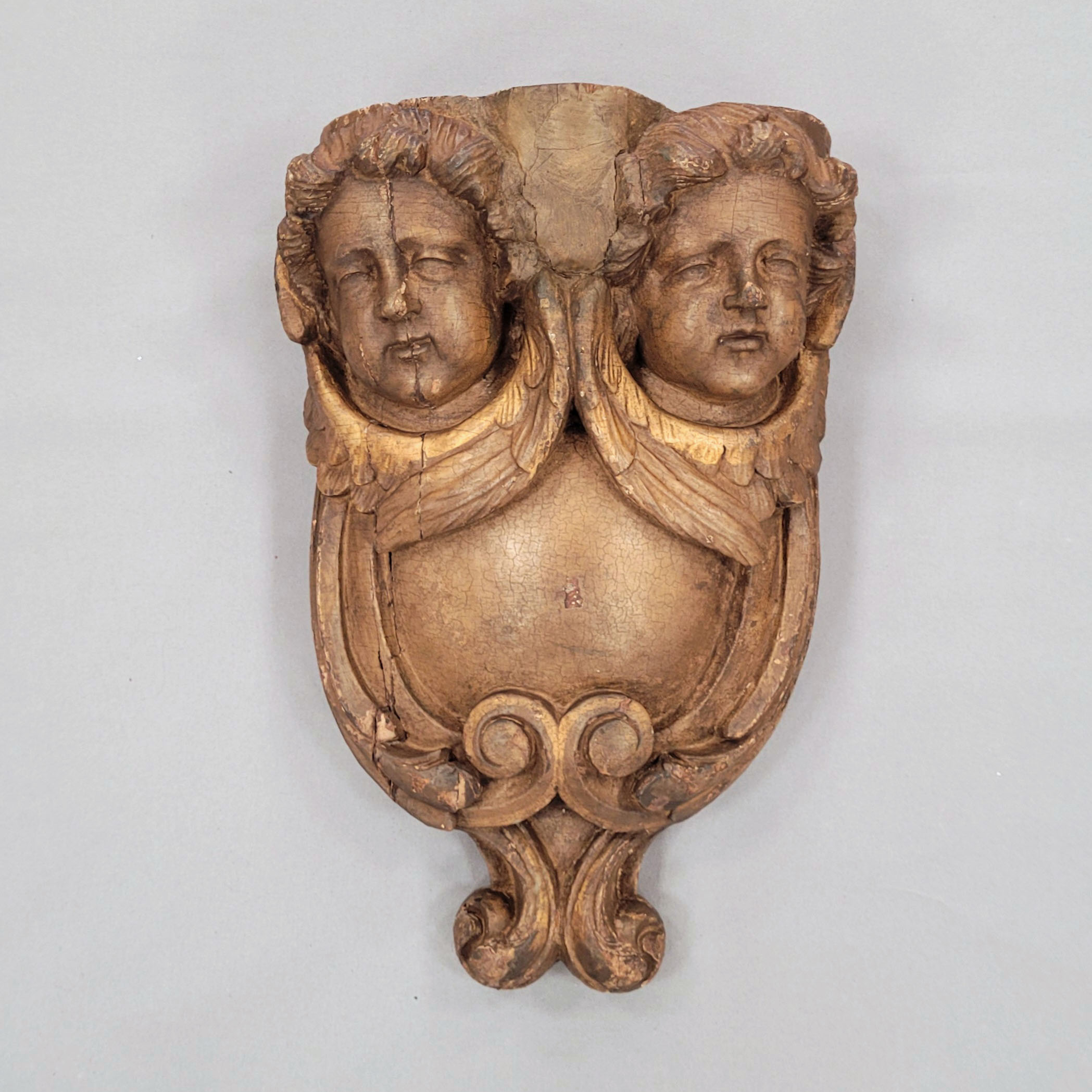 Wandapplike mit geflügelten EngelköpfenHolz, geschnitzt, Reste farbiger Fassung und Vergoldung, Westdeutsch 18. Jahrhundert, Höhe 51 cm