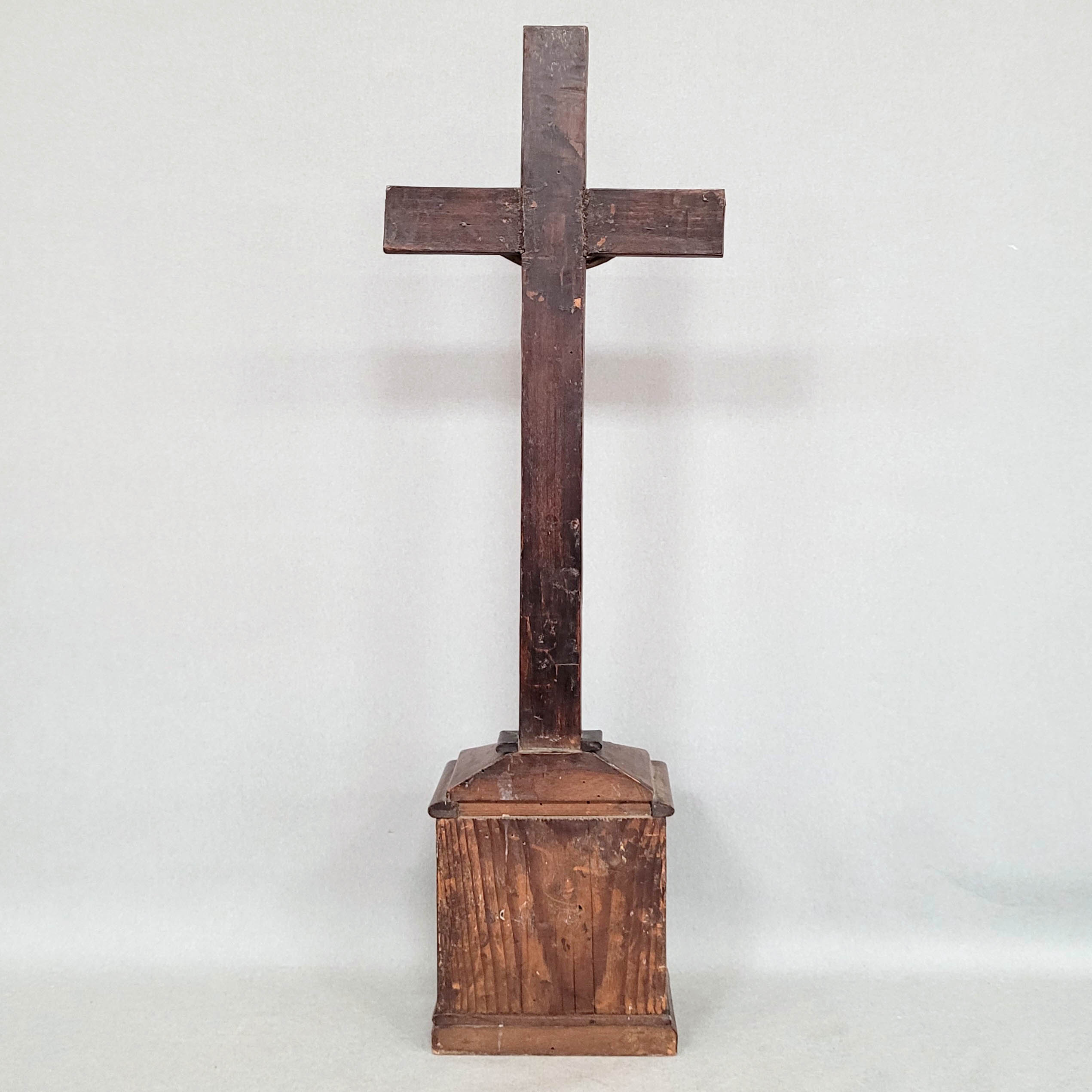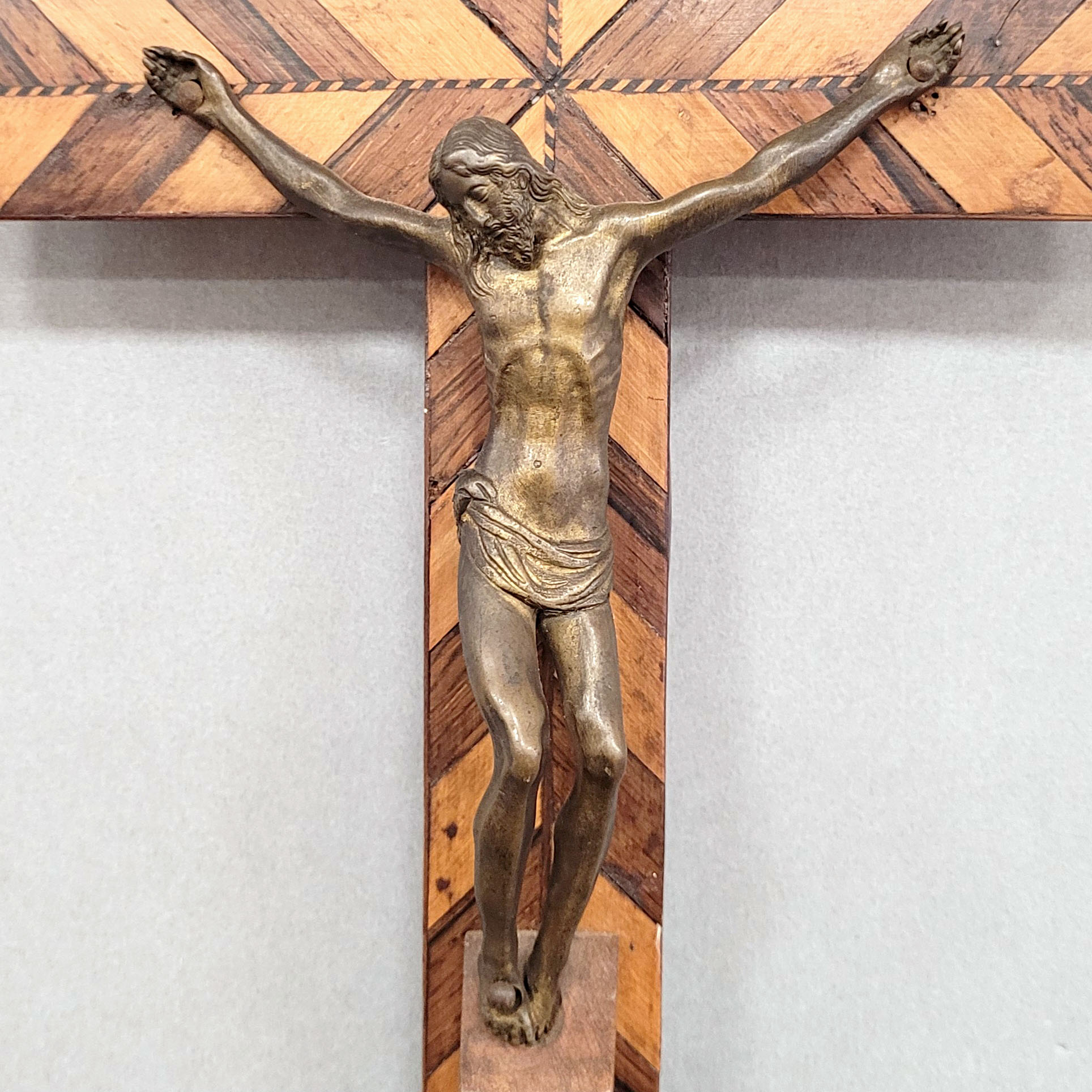 StandkreuzKreuz und Sockel, Nussbaum furniert auf Weichholz, intarsiert mit anderen Obsthölzern, Süddeutsch 18. Jahrhundert, Höhe ca. 63 cm Corpus Christi, Bronze, Reste von Vergoldung, wohl Italien 17. Jahrhundert, Höhe 15 cm