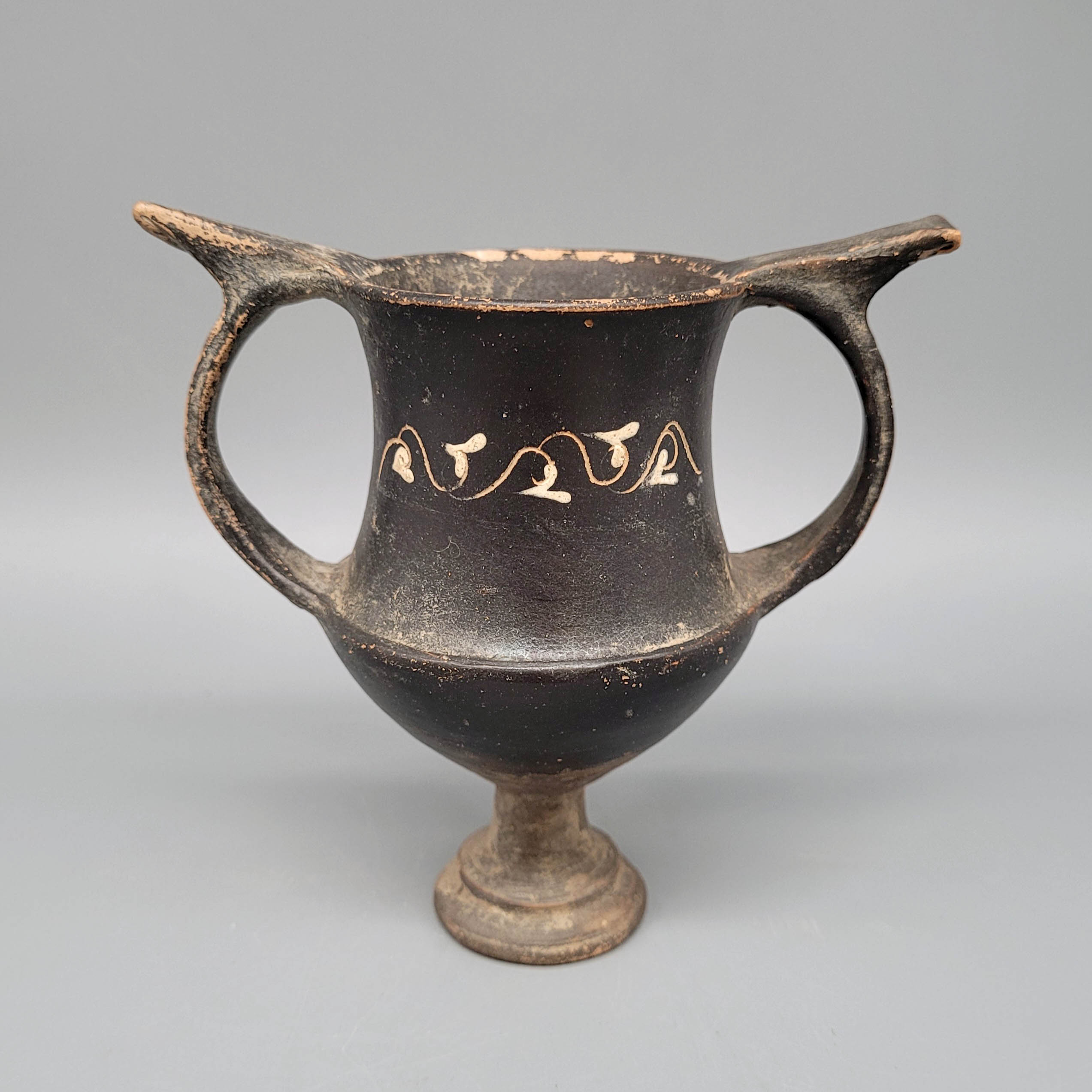 Kantharosgrauer Ton, im oberen Teil schwarz gefirnist, Efeuranken in roter und weißer Malerei, Apulien 4. Jahrhundert v. Chr., Höhe 12 cm (Prov.: Sammlung F.K., Bergisch-Gladbach [1926-2024], erworben 1970-1980)