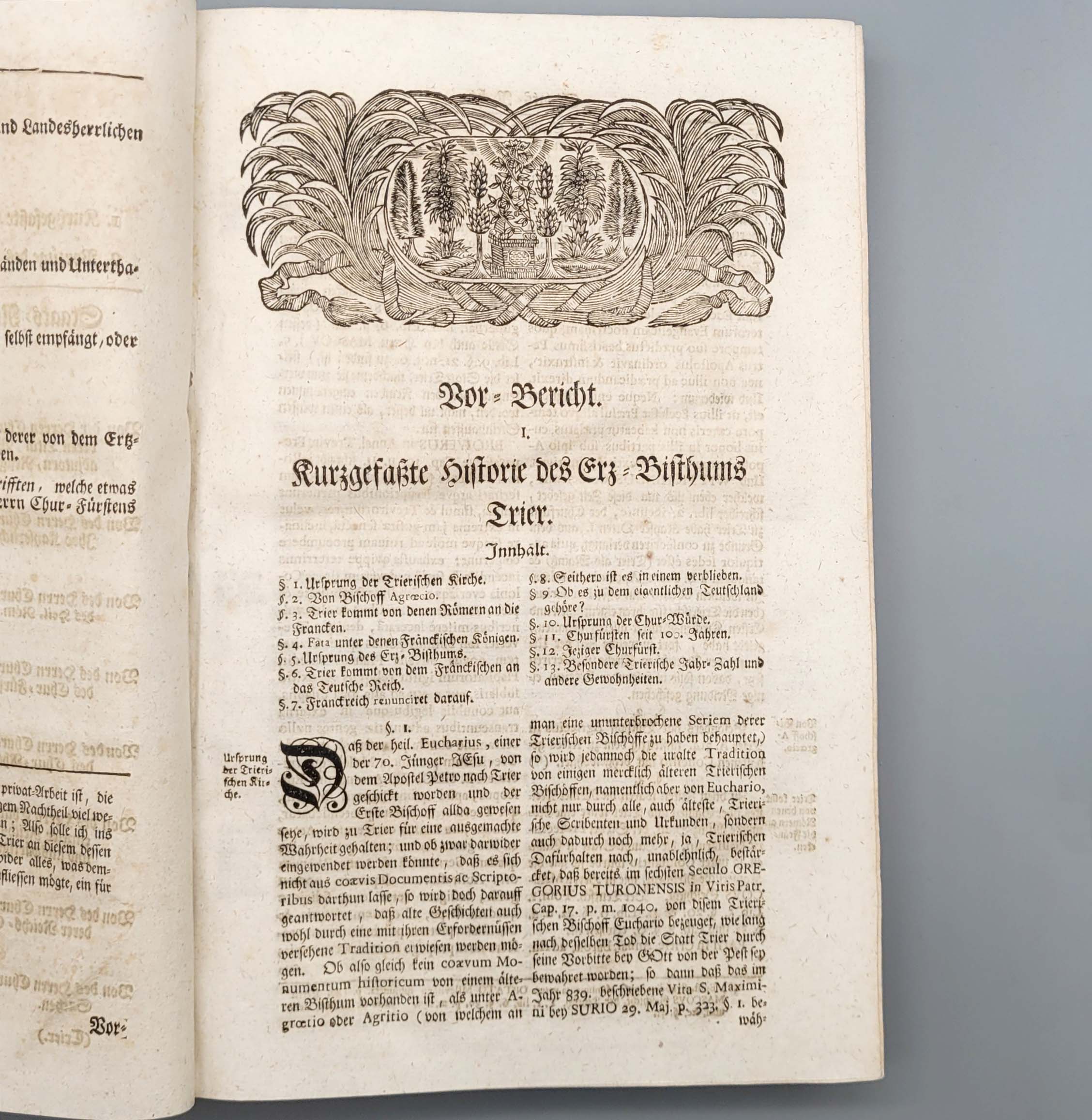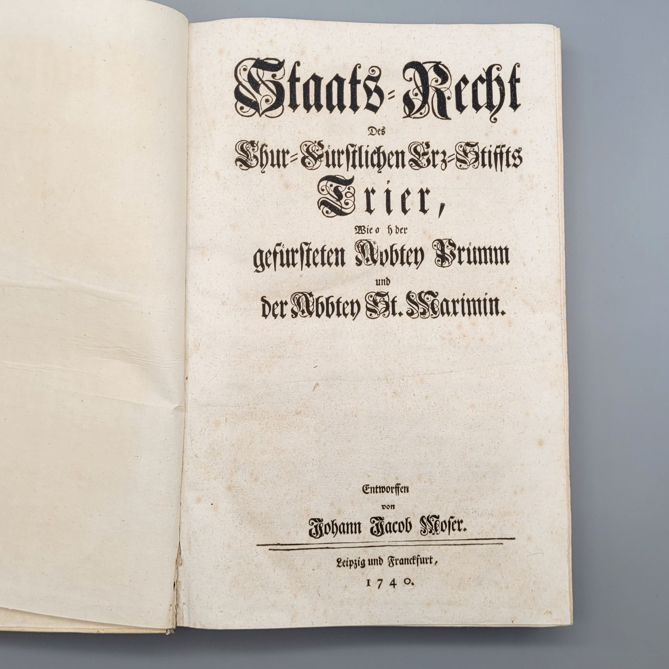 MOSER, Johann Jacob: Staats-Recht des Chur-Fürstlichen Erz-Stiffts Trier, wie auch der gefürsteten Abbtey Prümm und der Abbtey St. Maximin