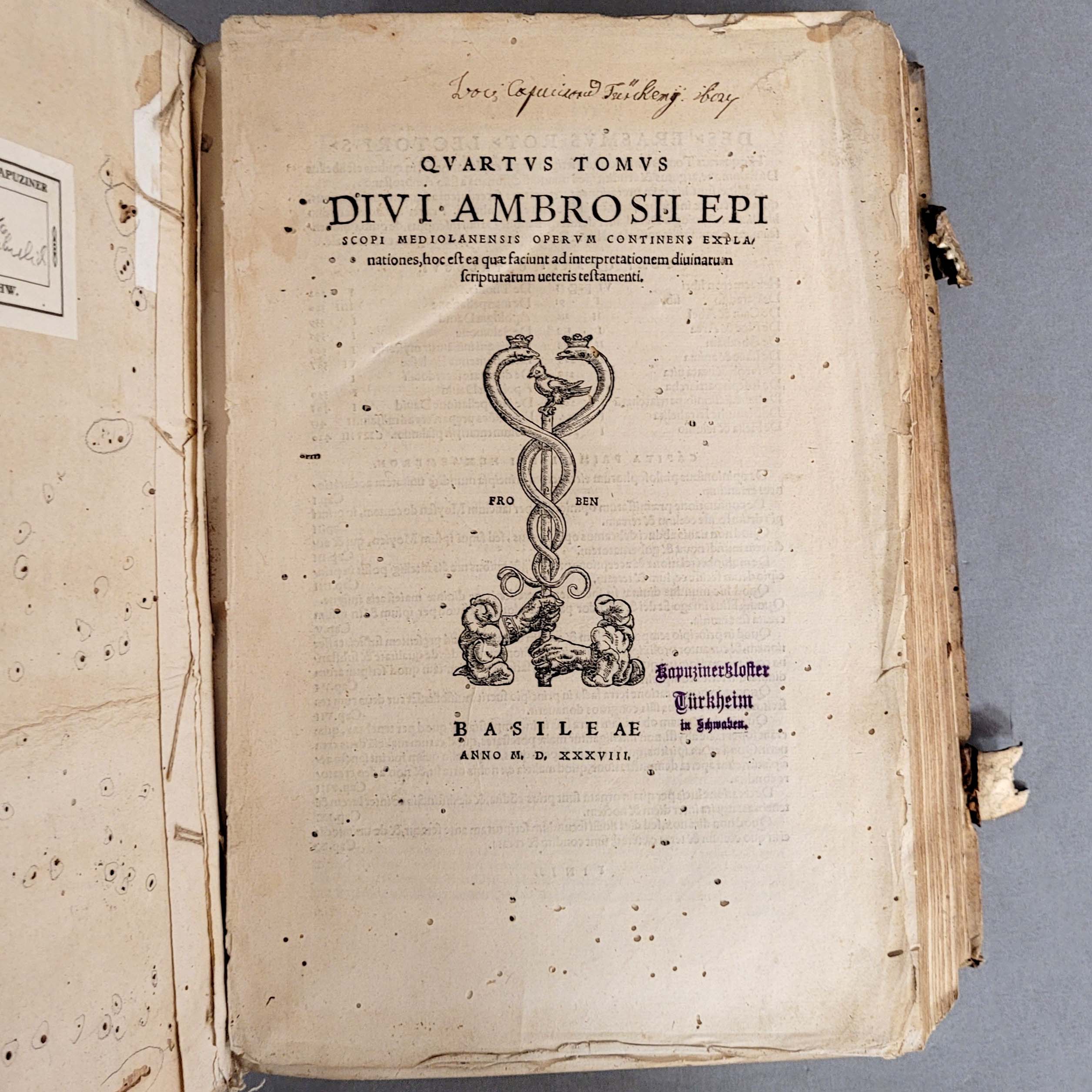 Vol IV-V (in einem Band), Basel (Froben) 1538 (geprägter Pergamenteinband über Holzdeckel der Zeit, Metallschließen fehlen, Titelblatt von Vol. IV lose, Wurmschäden aus der Bibliothek des Kapuziner-Kloster Türkheim in Schwaben)