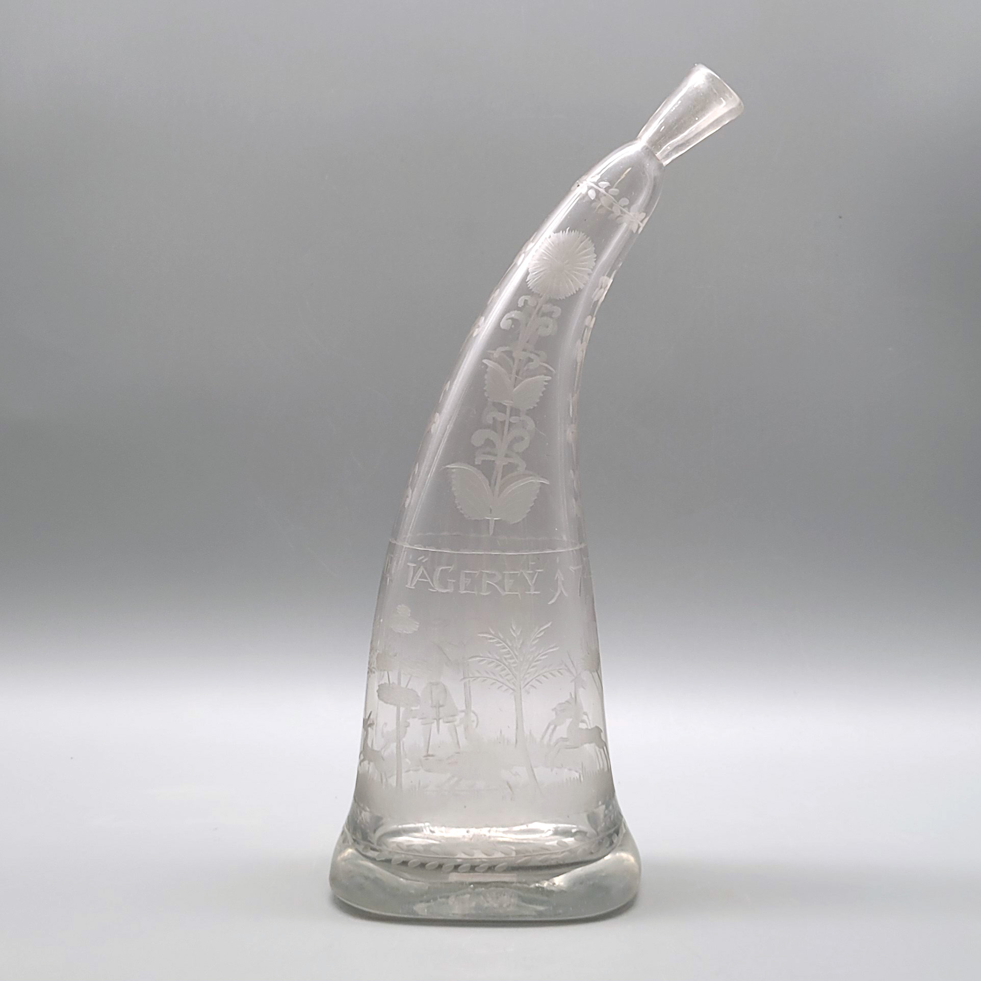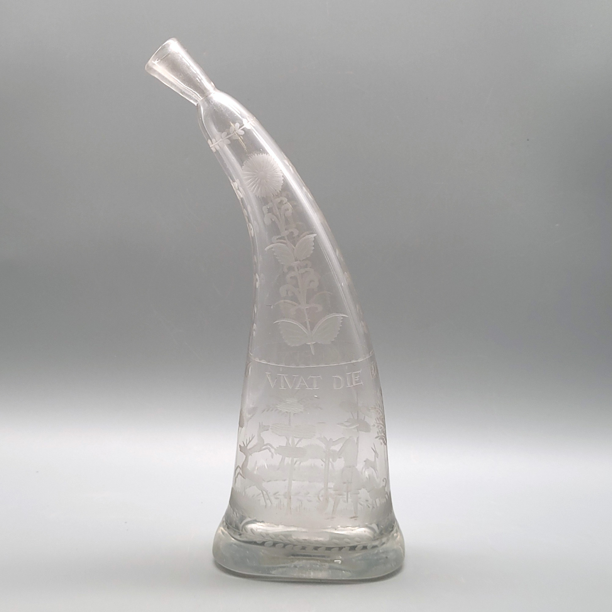 Scherzgefäß in Form eines Jagdhornsfarbloses Glas, geätzter Dekor mit Jagddarstellung und Blumen, Spruchband „VIVAT DIE EDLE IÄGEREY“, datiert 1726, Deutsch 18. Jahrhundert, Höhe 23 cm