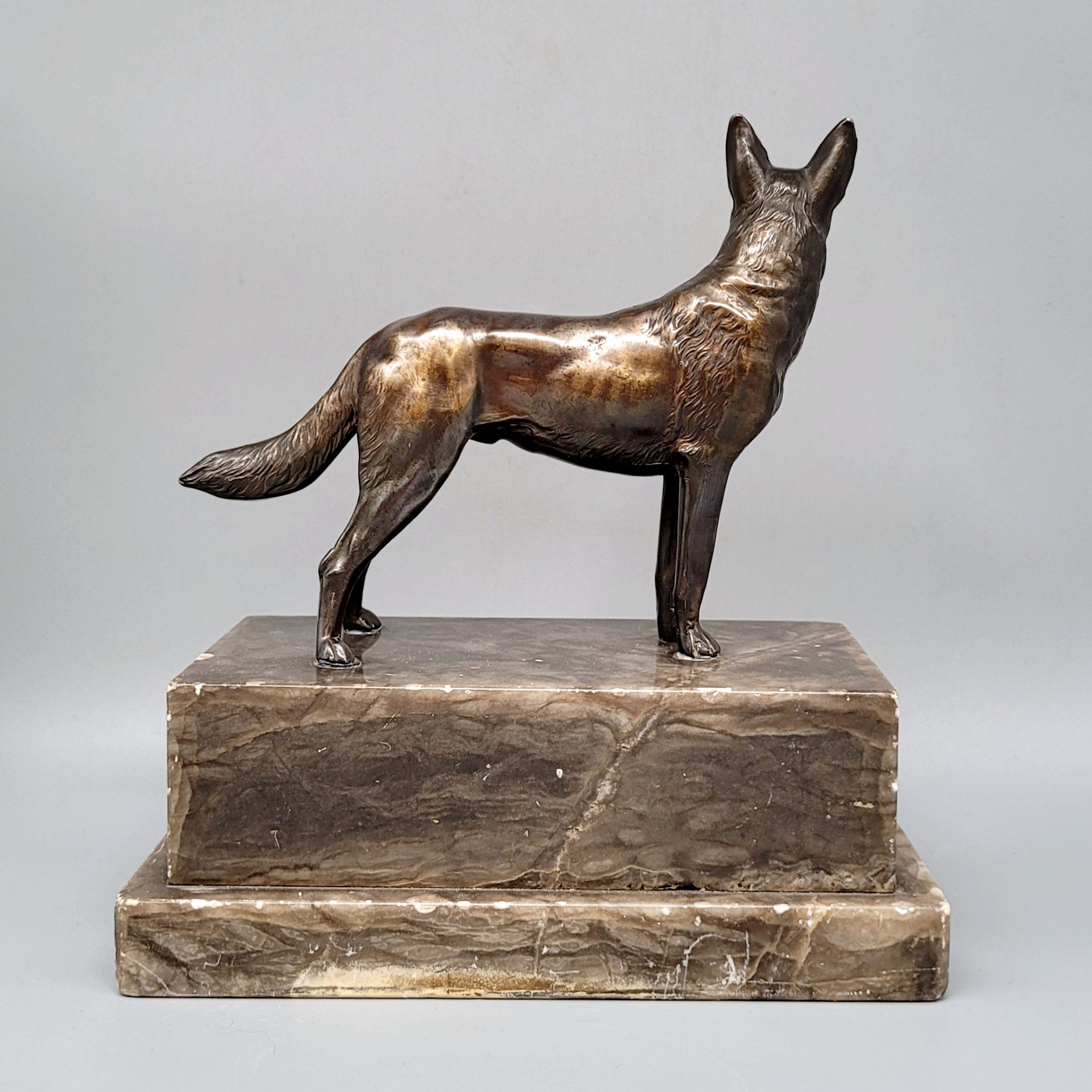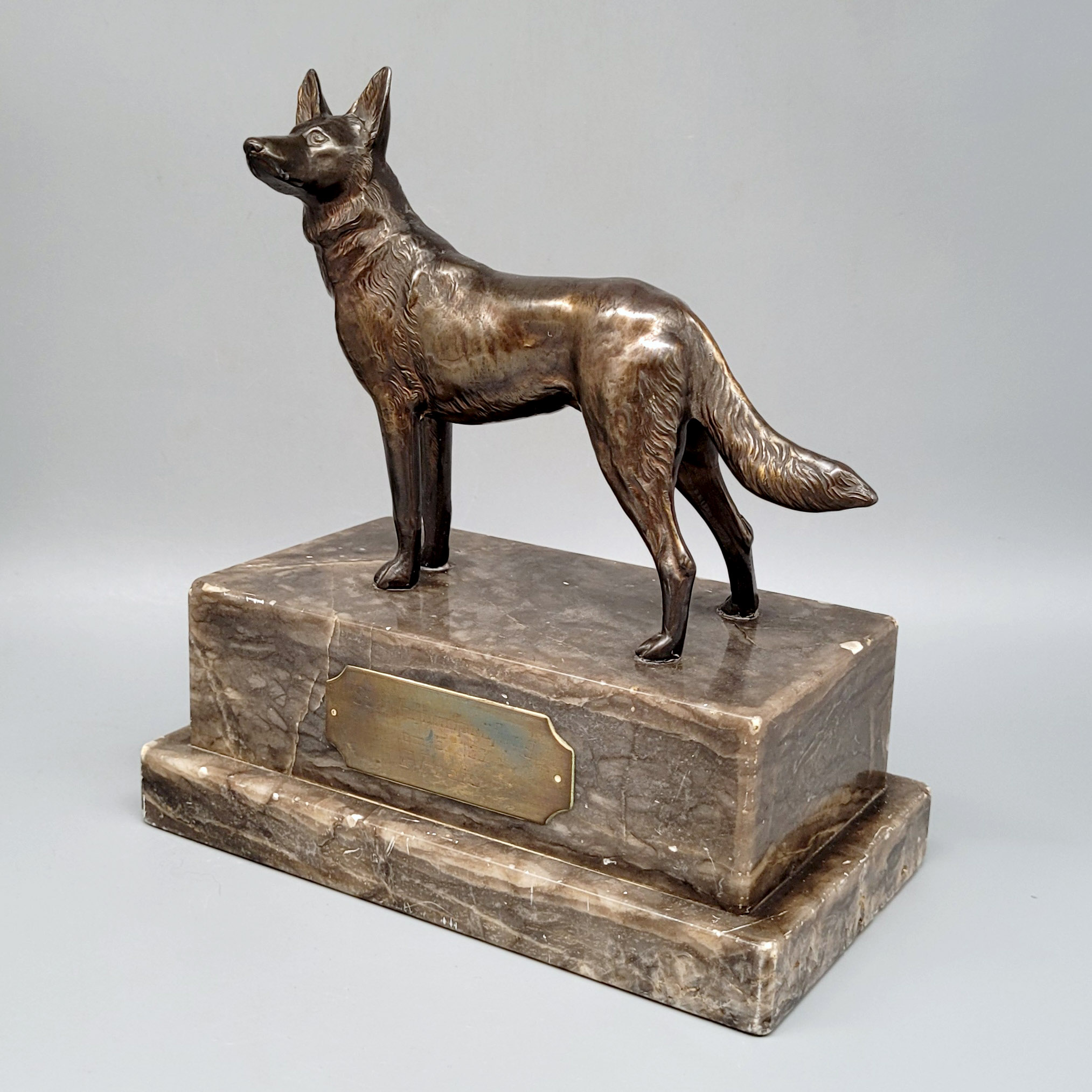 SchäferhundGalvanoplastik, Steinsockel, Plakette „Schäferhundprüfung am 5.10.30 II. Preis“, Höhe mit Sockel 20 cm