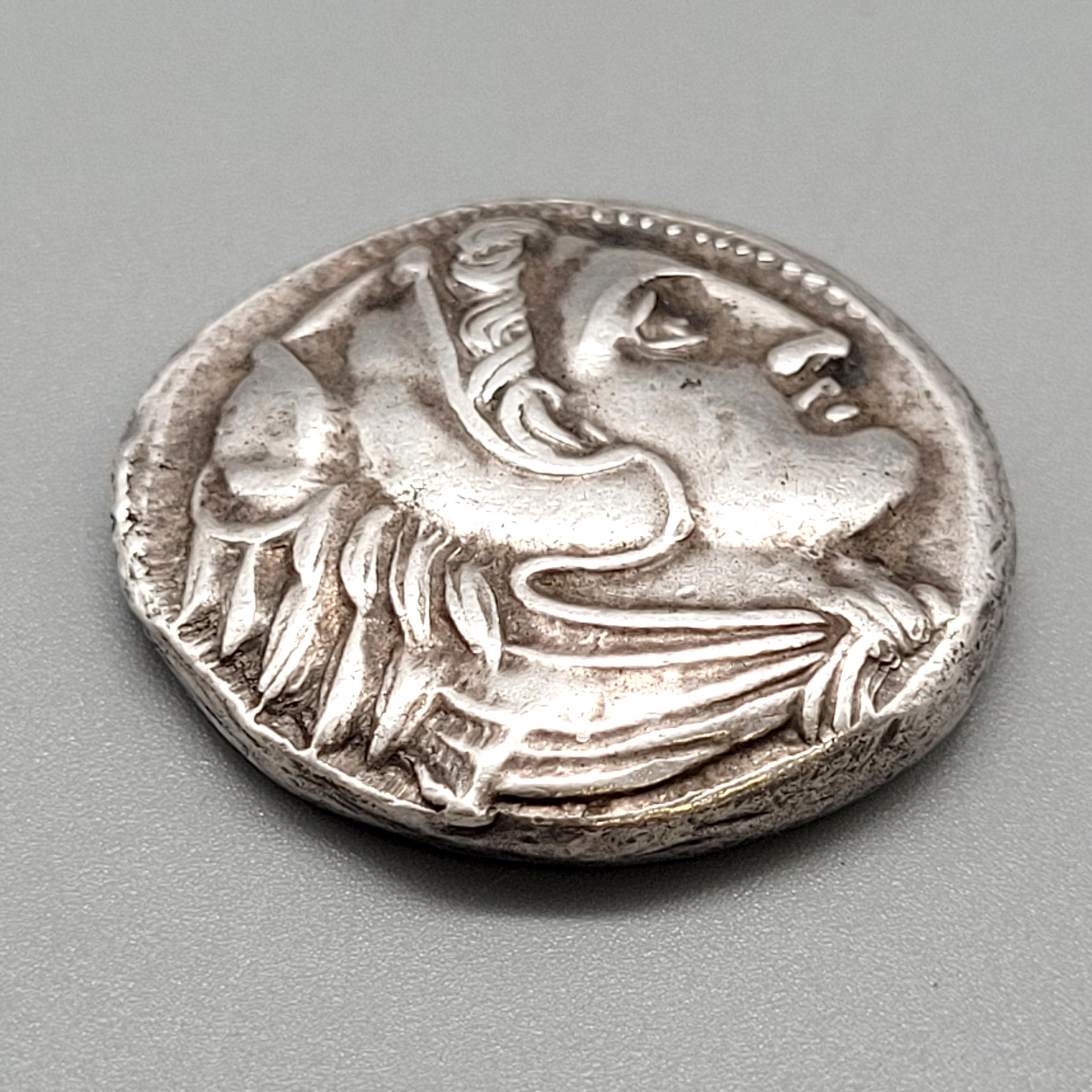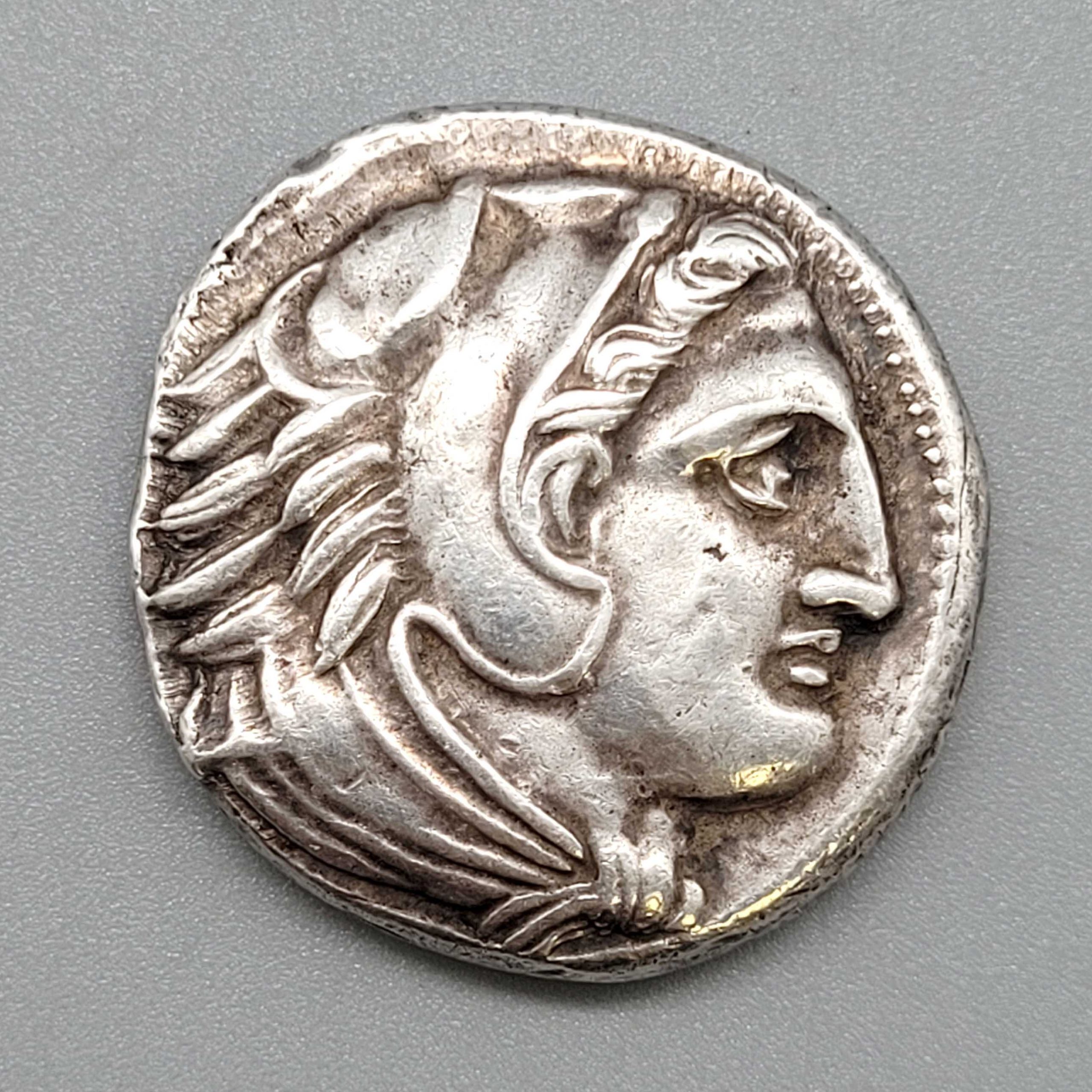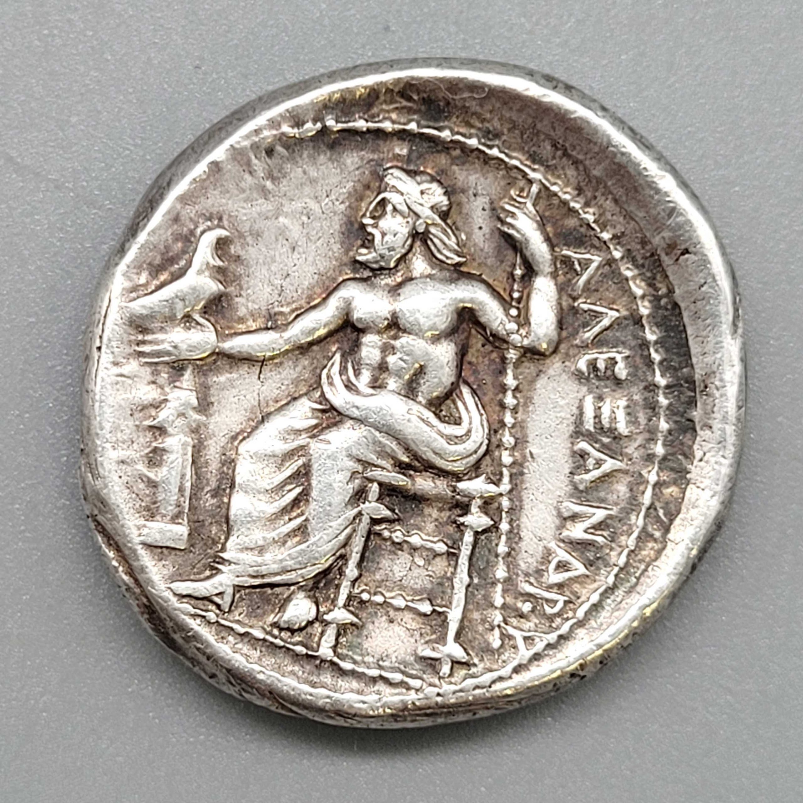 Silber, Vorderseite Kopf des Herakles mit Löwenskalp Rückseite Zeus auf Hocker nach links mit Adler und Szepter, Beschriftung „Alexandrou“, Durchmesser 2,5 cm, Gewicht 17,2g