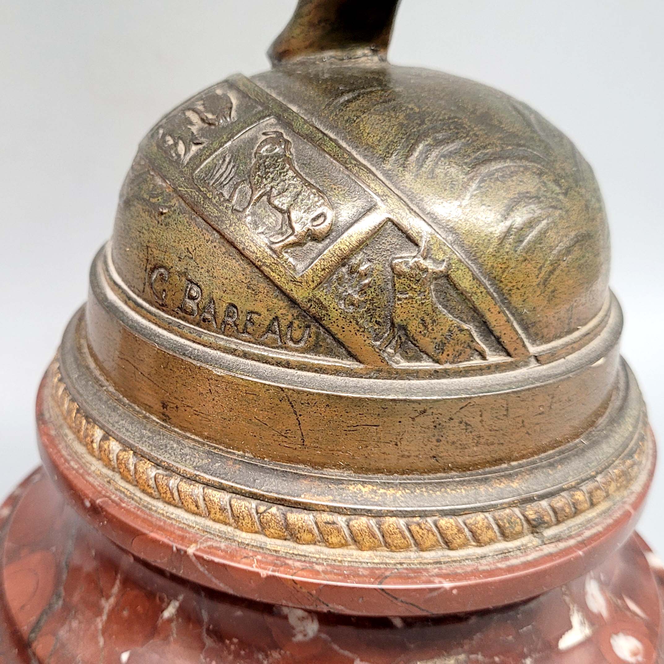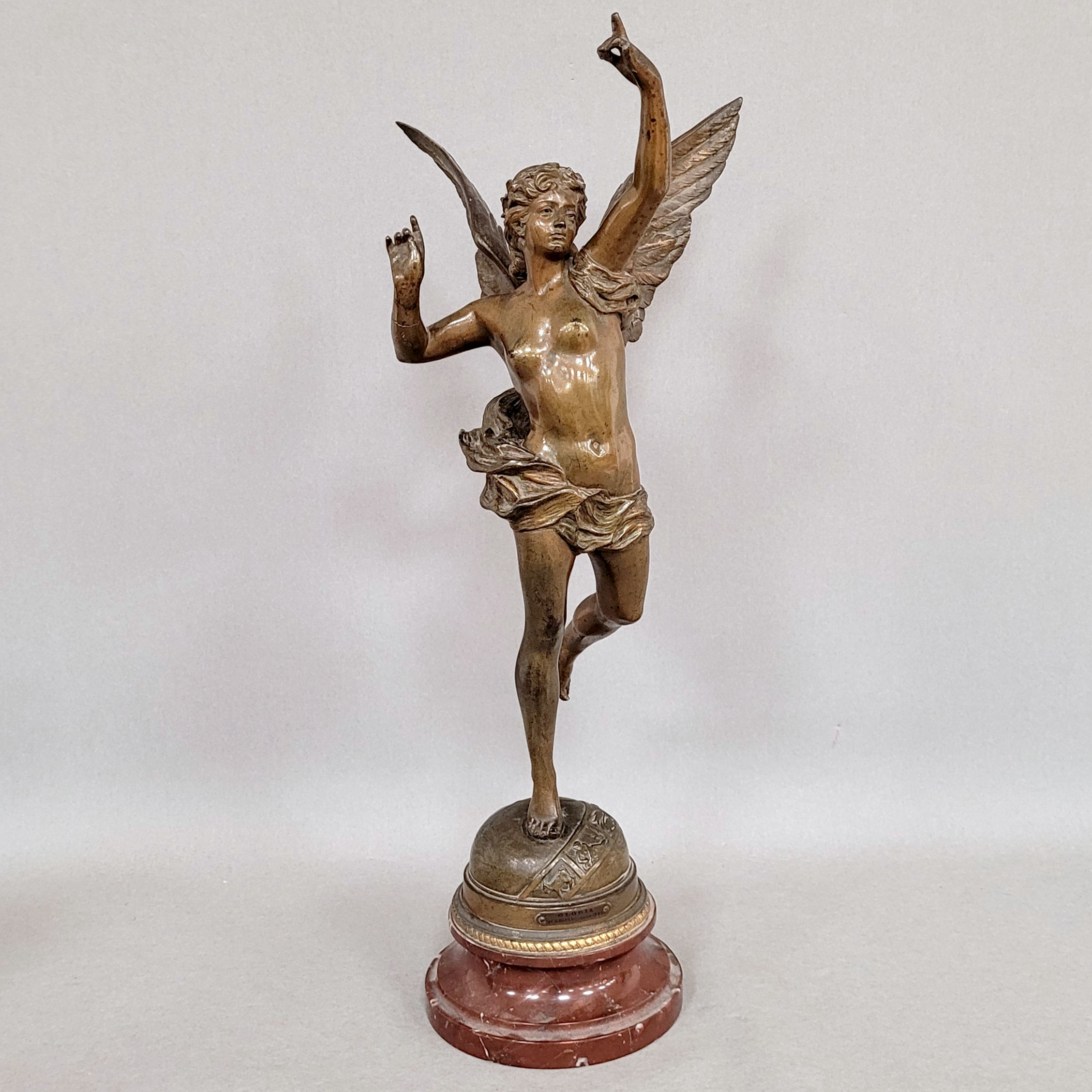 BAREAU, Georges (1866-1931): GloriaZinkguss, verschiedenfarbig patiniert, signiert, Steinsockel, Plakette mit Titelangabe und Zusatz „Salon 1892“, Gesamthöhe 54 cm (ein Arm angebrochen, Gussfehler an 2 Fingern)